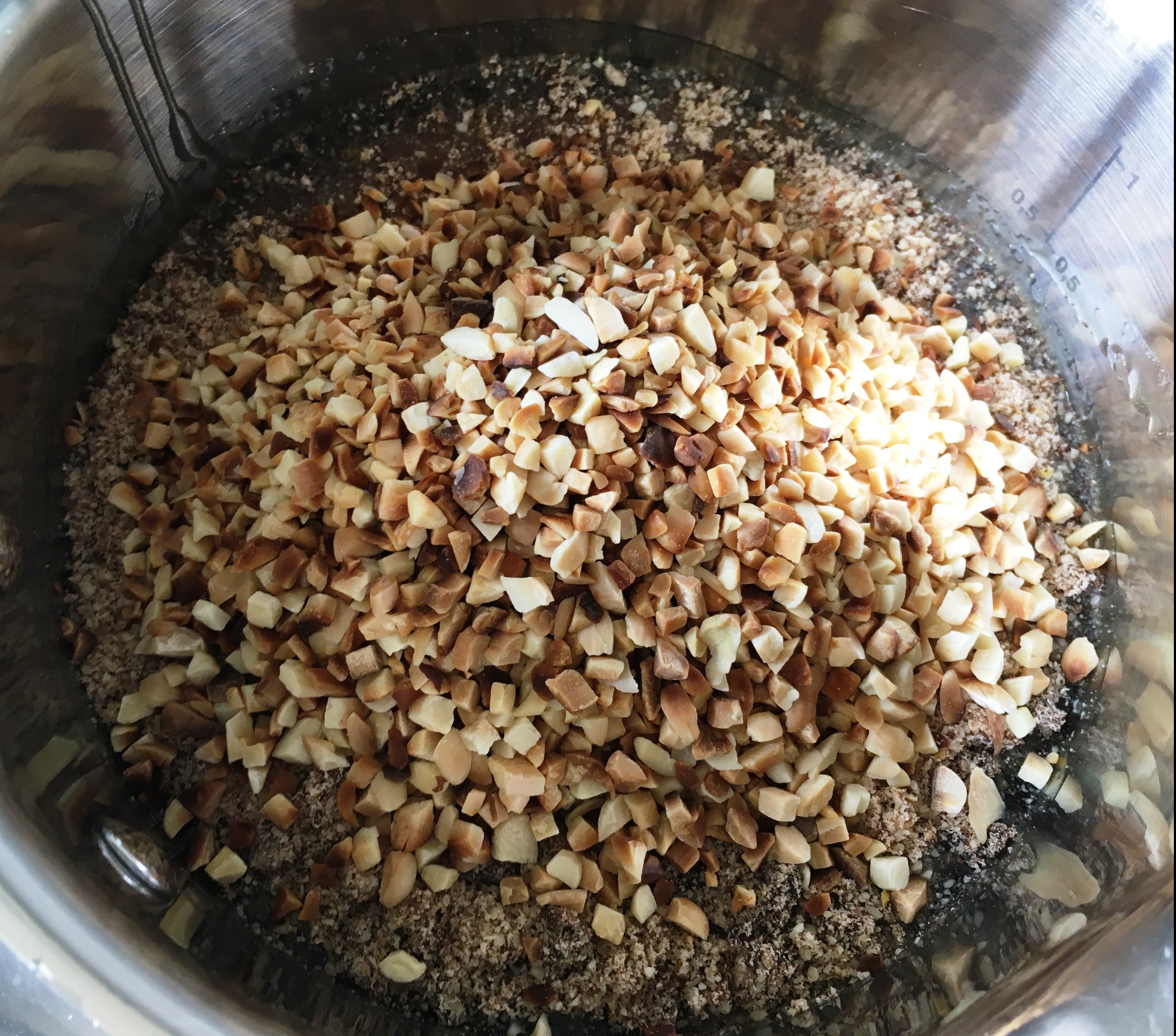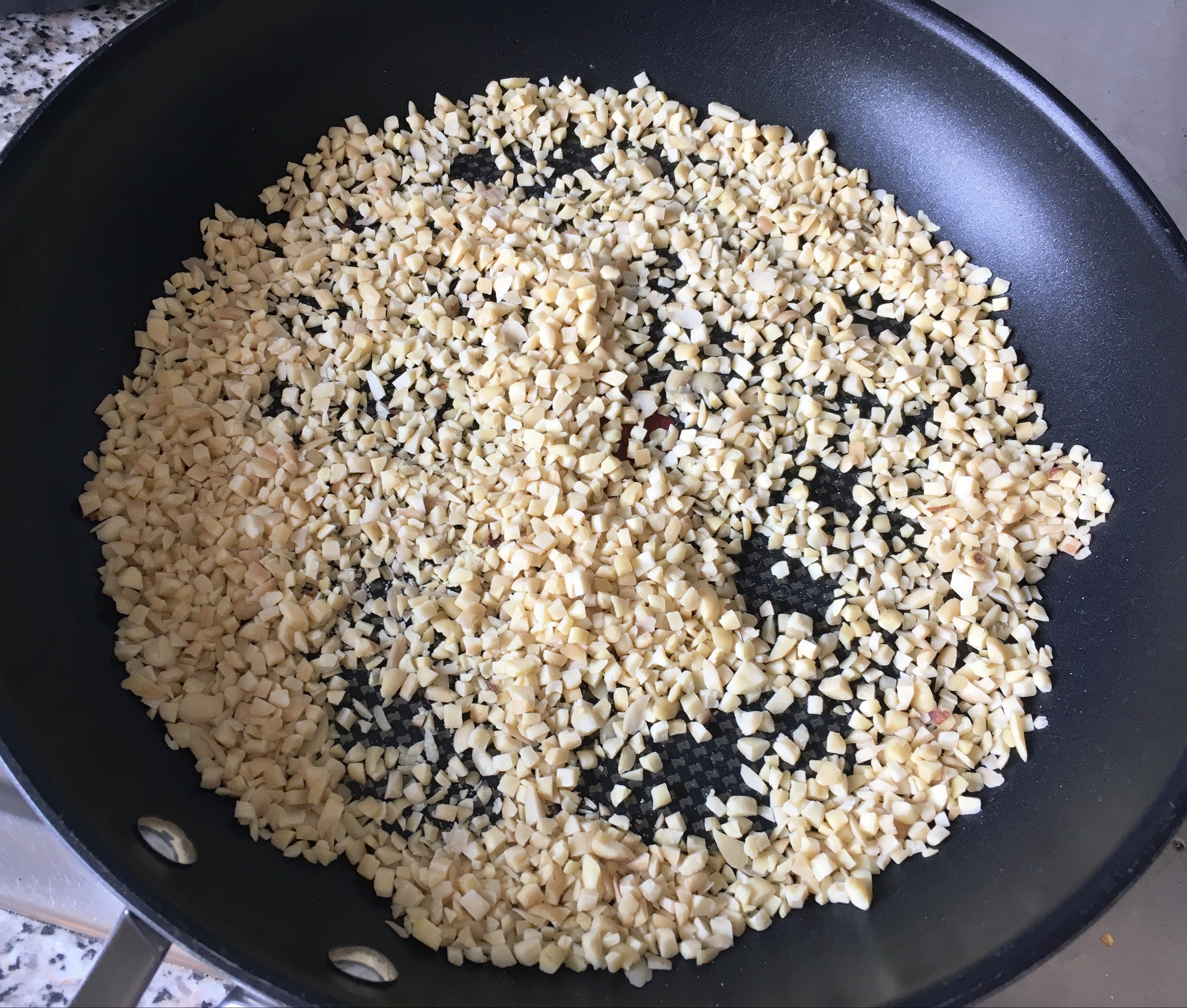 - Die gehackten Mandeln in einer Pfanne ohne Fett anrösten und abkühlen lassen.