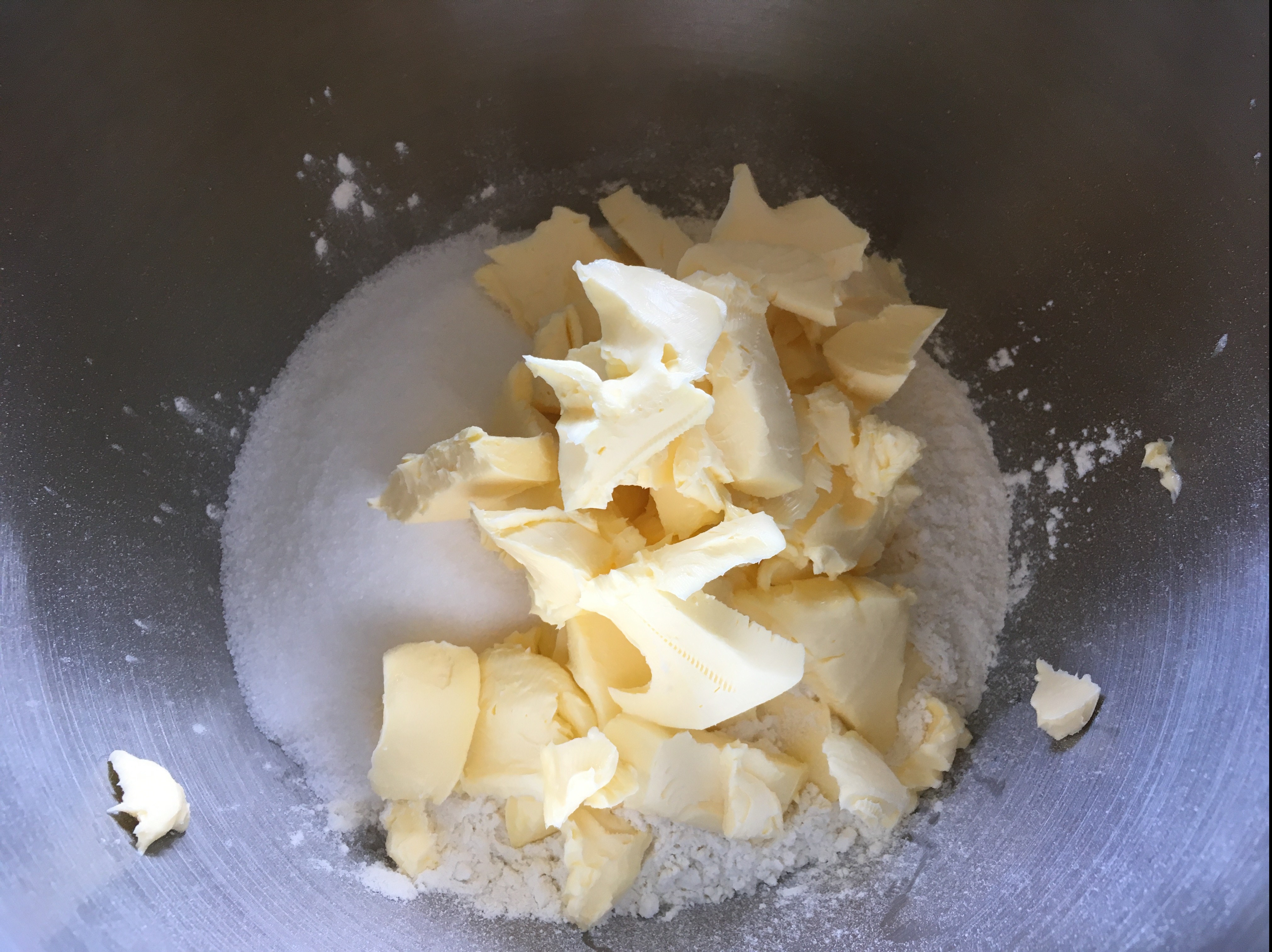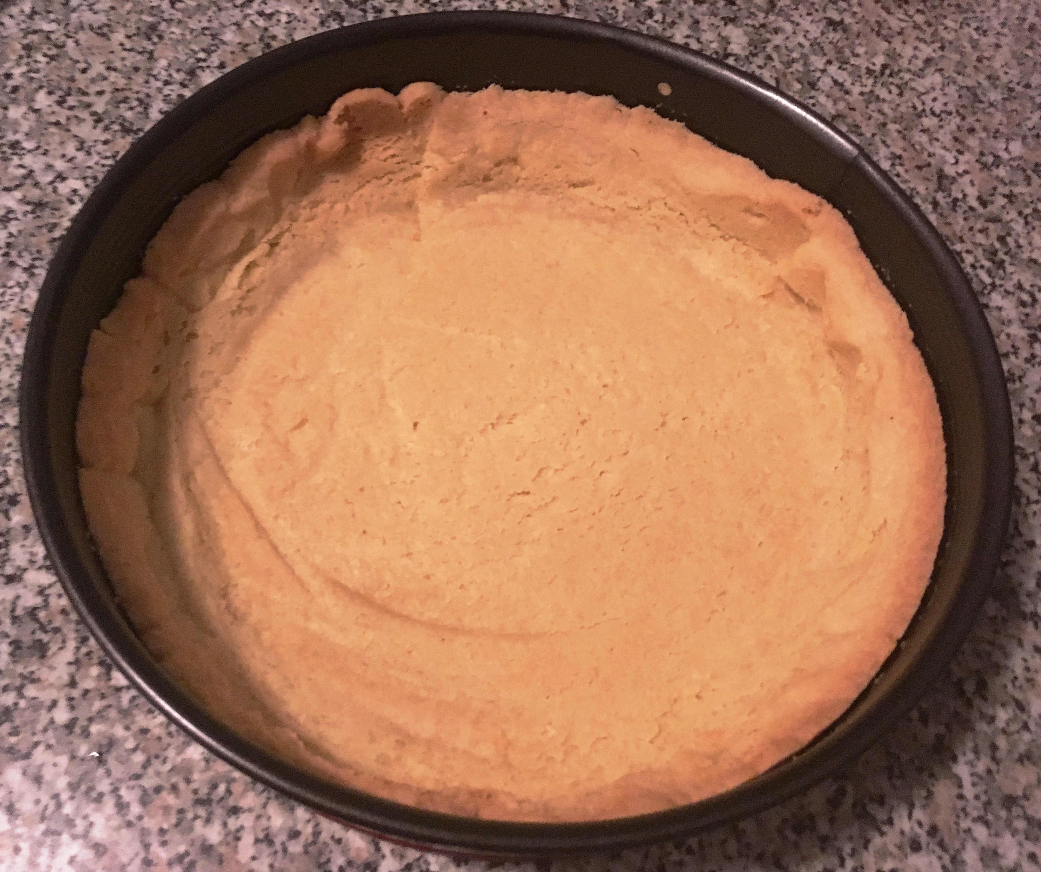 - Als Erstes bereite ich einen Mürbeteig nach der 3-2-1 Regel zu: 300g Mehl, 200g kalte Butter in Stückchen, 100g Zucker zu einem glatten Teig vermengen und für mind. 30 Minuten kaltstellen. Dann den Teig in eine runde Form geben, mit Backpapier bedecken, mit Backlinsen beschweren und ca. 25 Min backen.