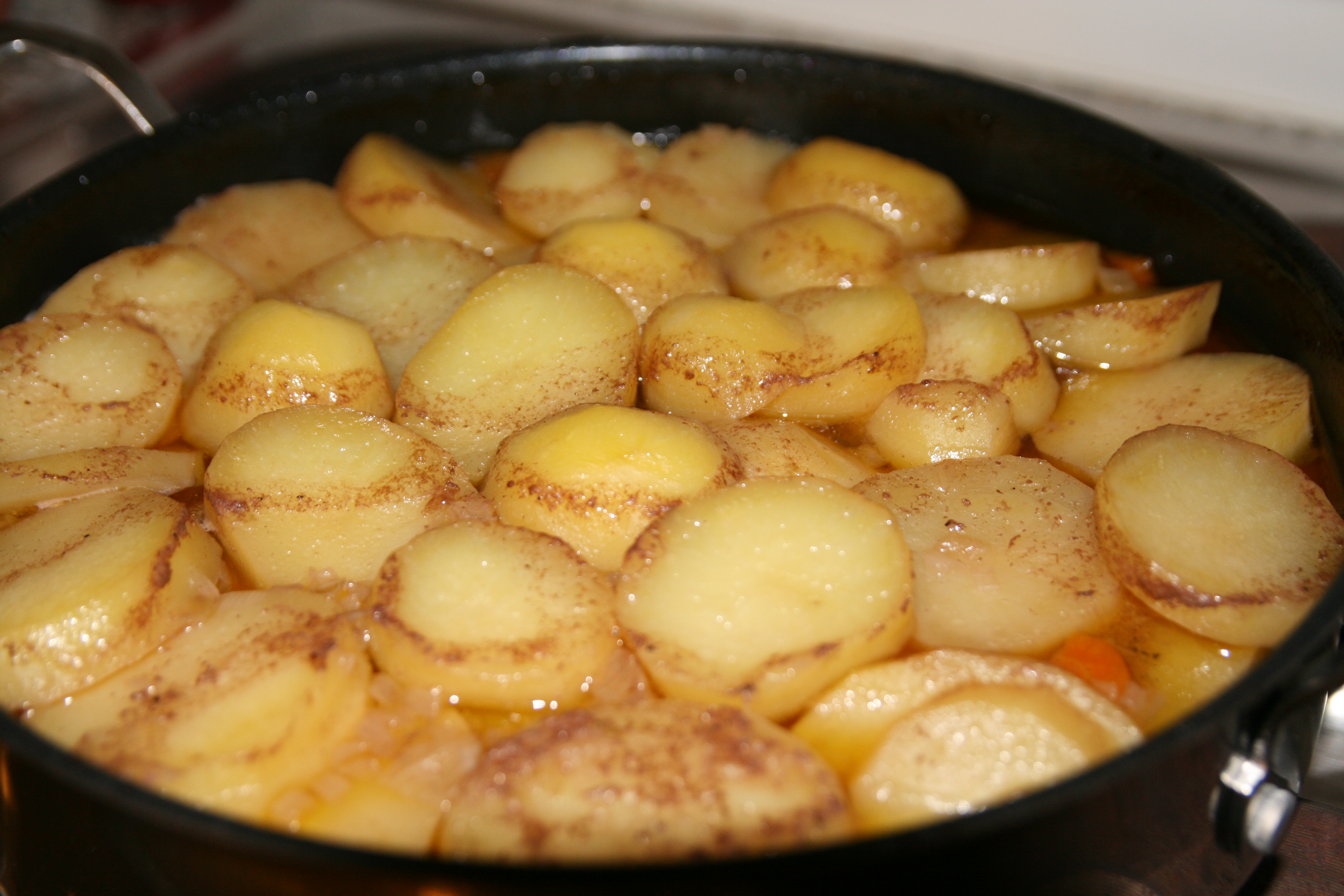 Kartoffelscheiben - Die Butter verteile ich über den Eintopf und lege anschließend die Kartoffelscheiben wie bei einem Gratin darüber.