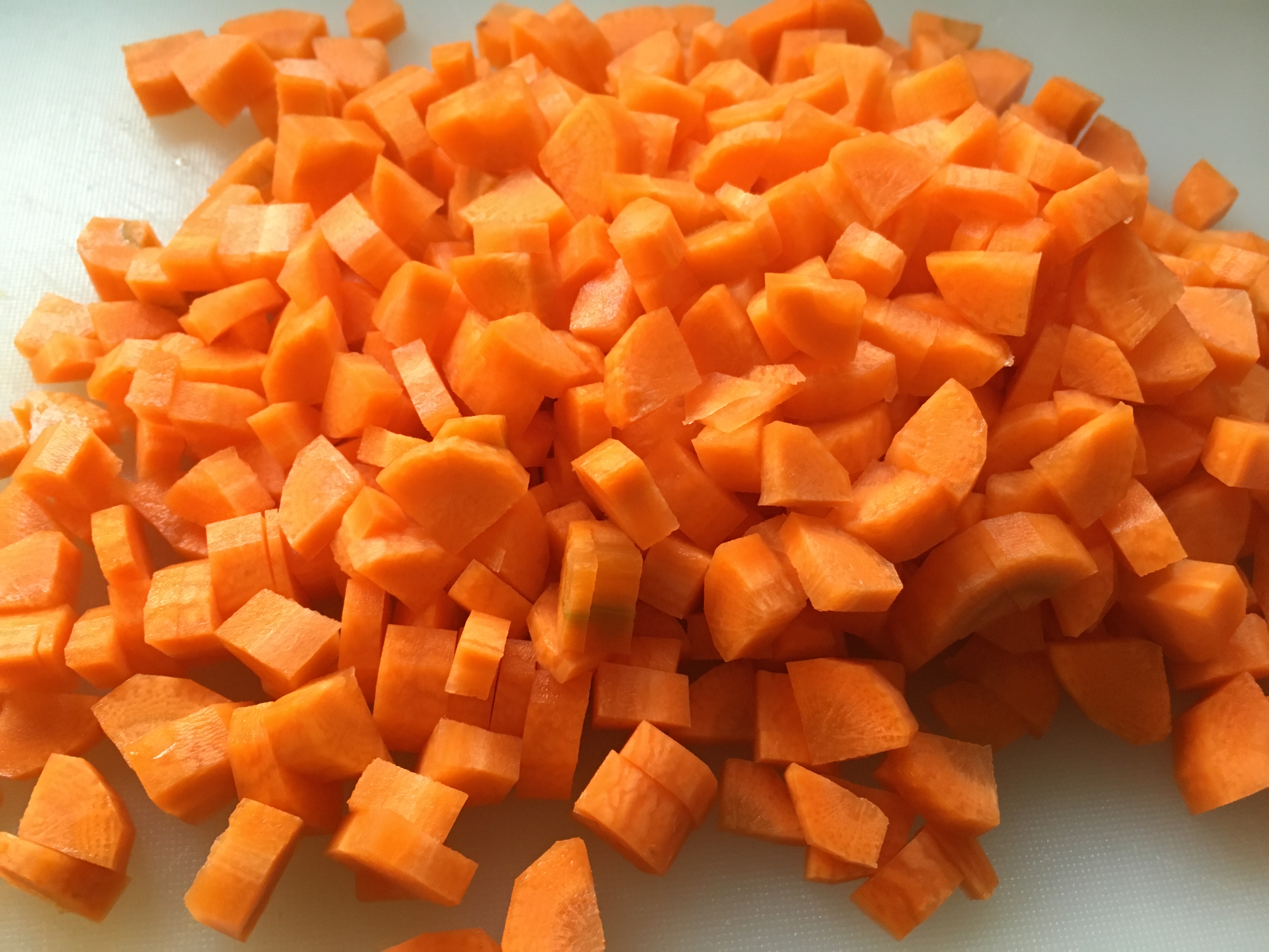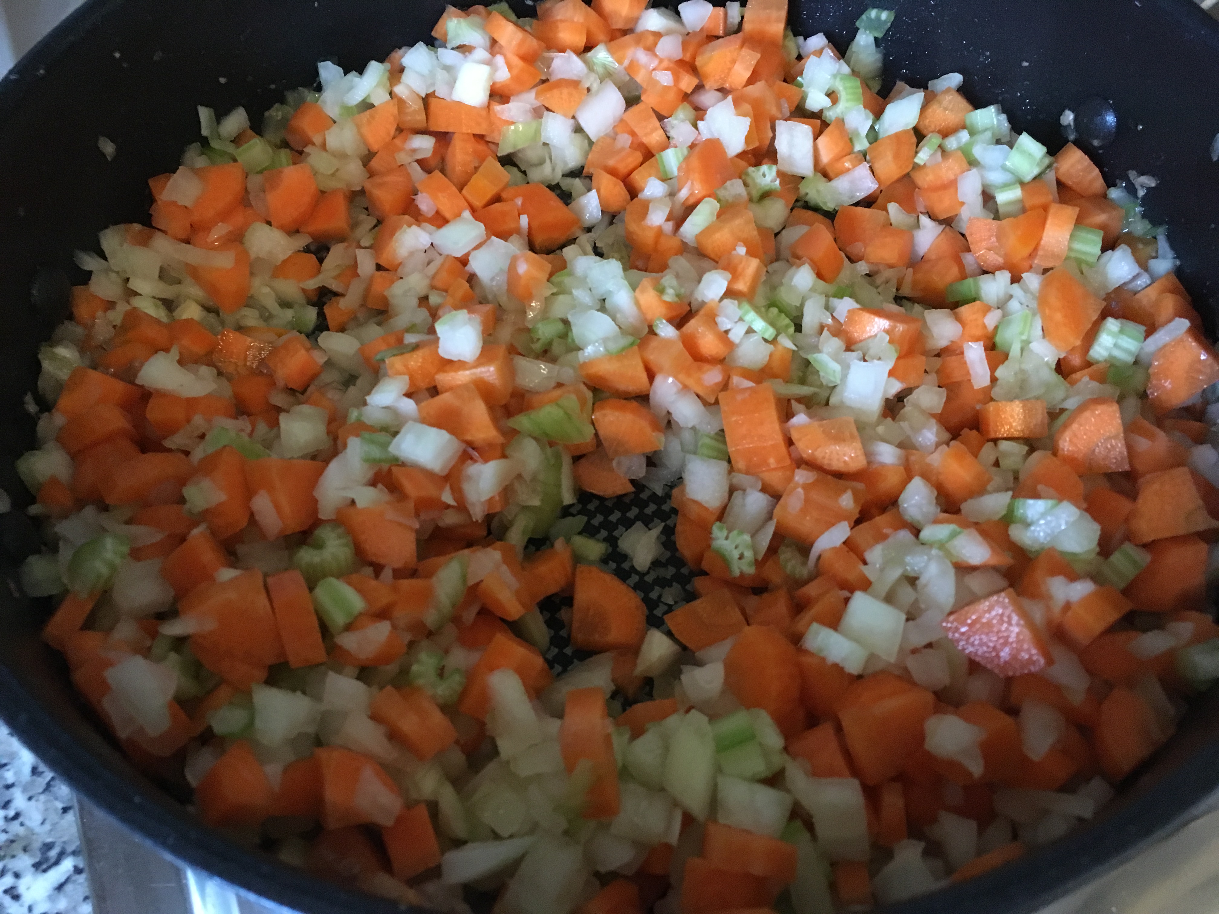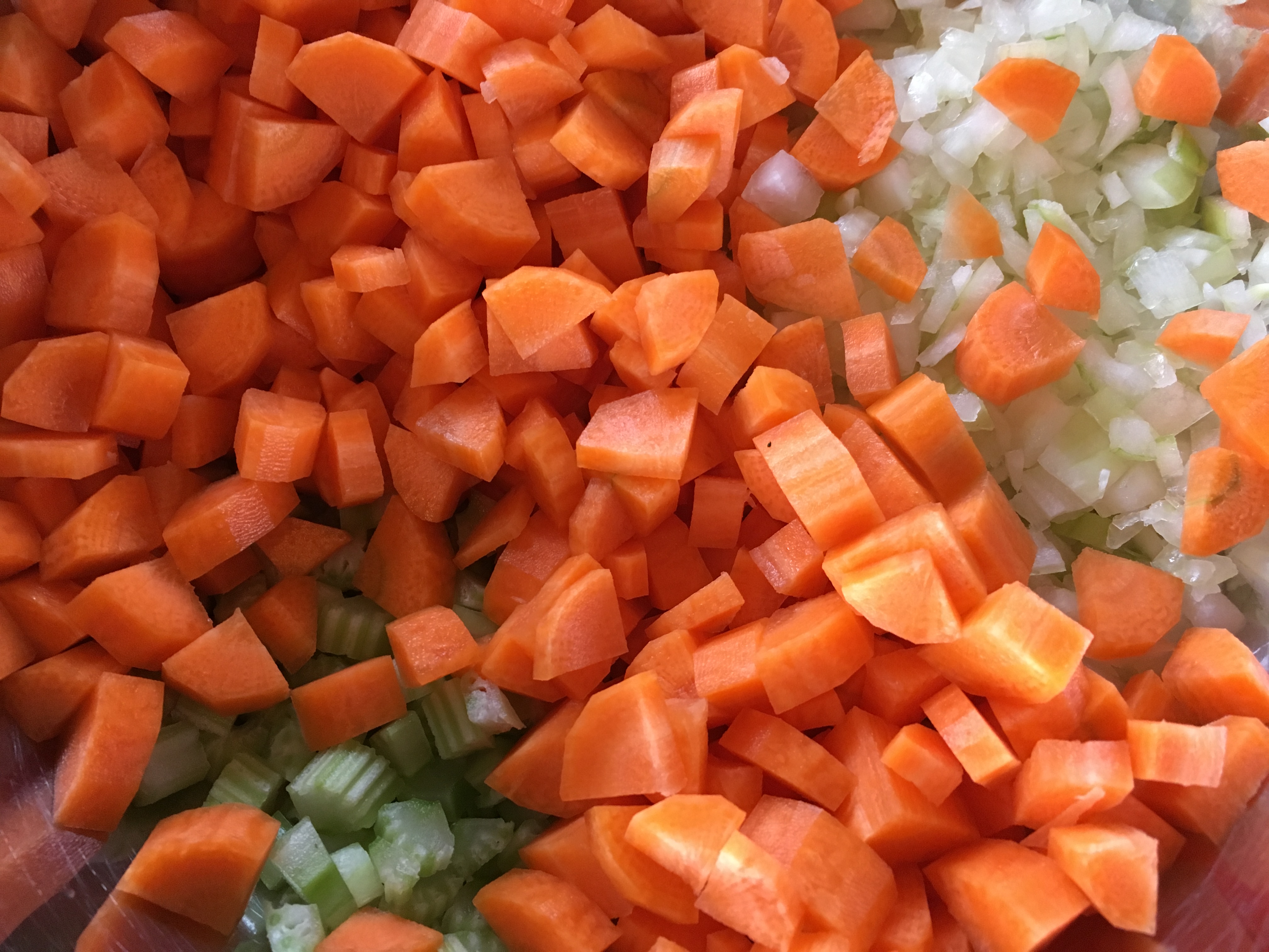 - Die Zwiebeln, Karotten und den Staudensellerie schäle ich und schneide das Gemüse anschließend in kleine Würfel.