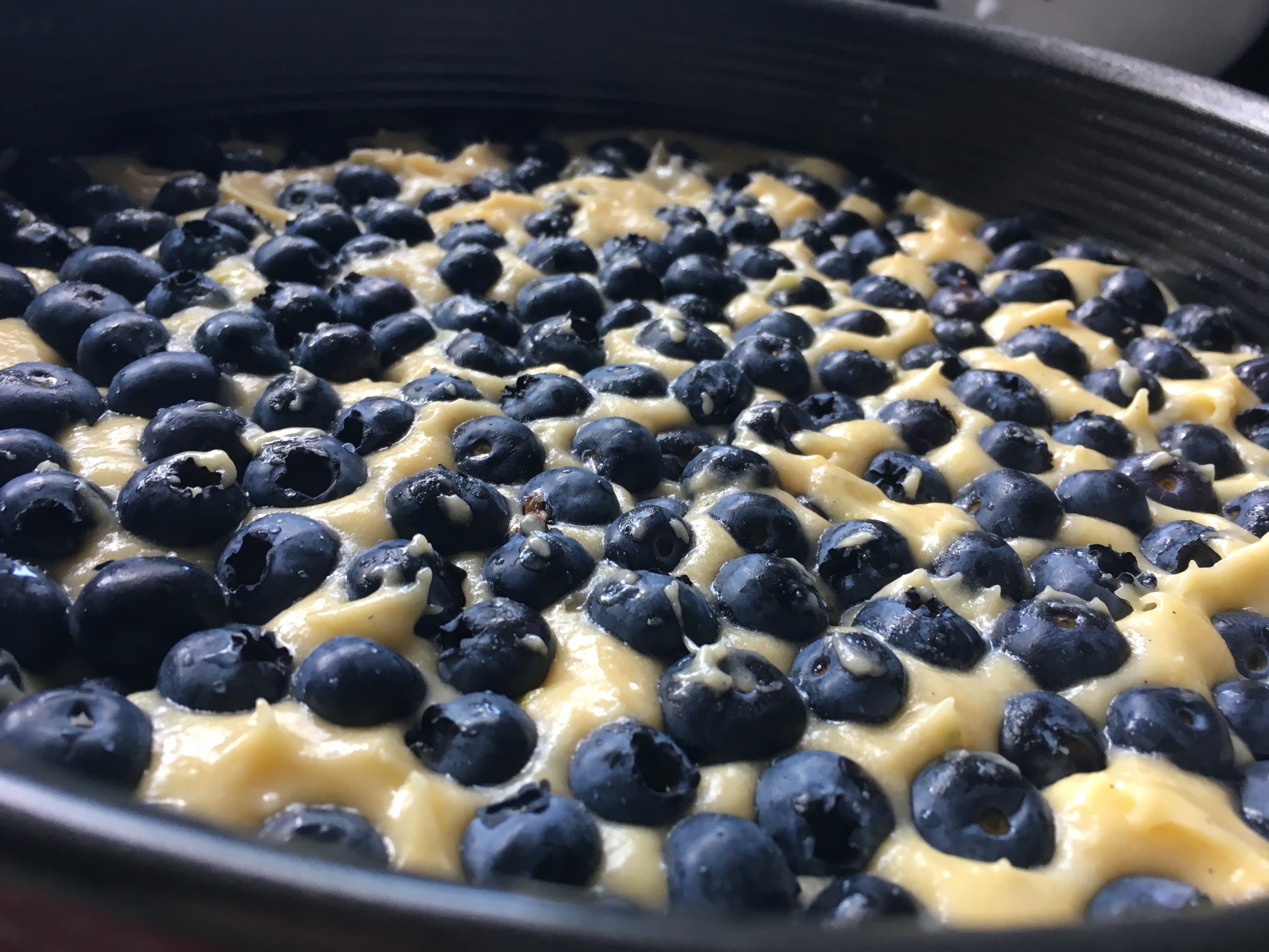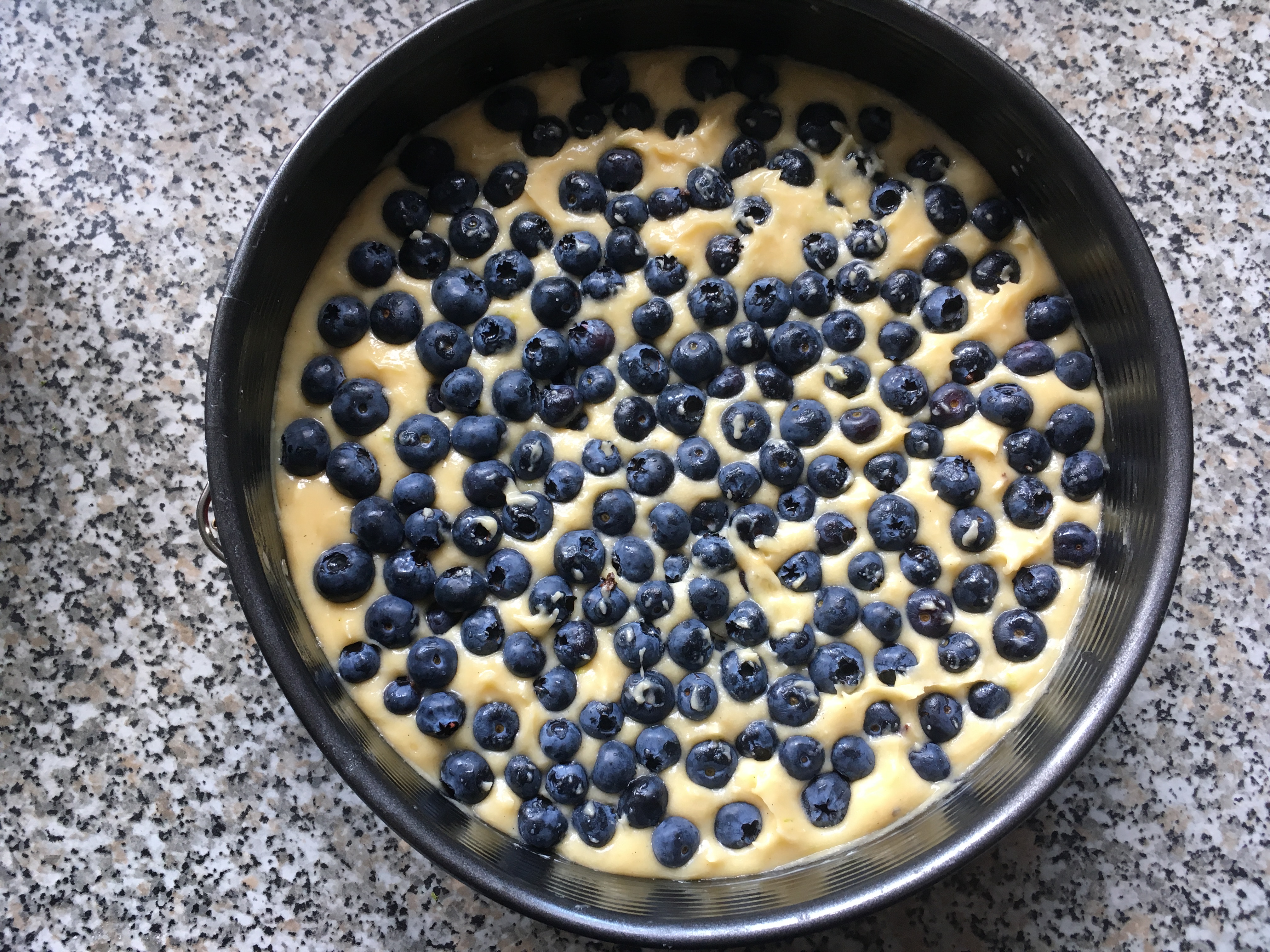Backform füllen Backform gefüllt - Die Blaubeeren waschen und vorsichtig trocken. Nun die Beeren über den Teig geben und nur ein wenig „hineindrücken“.