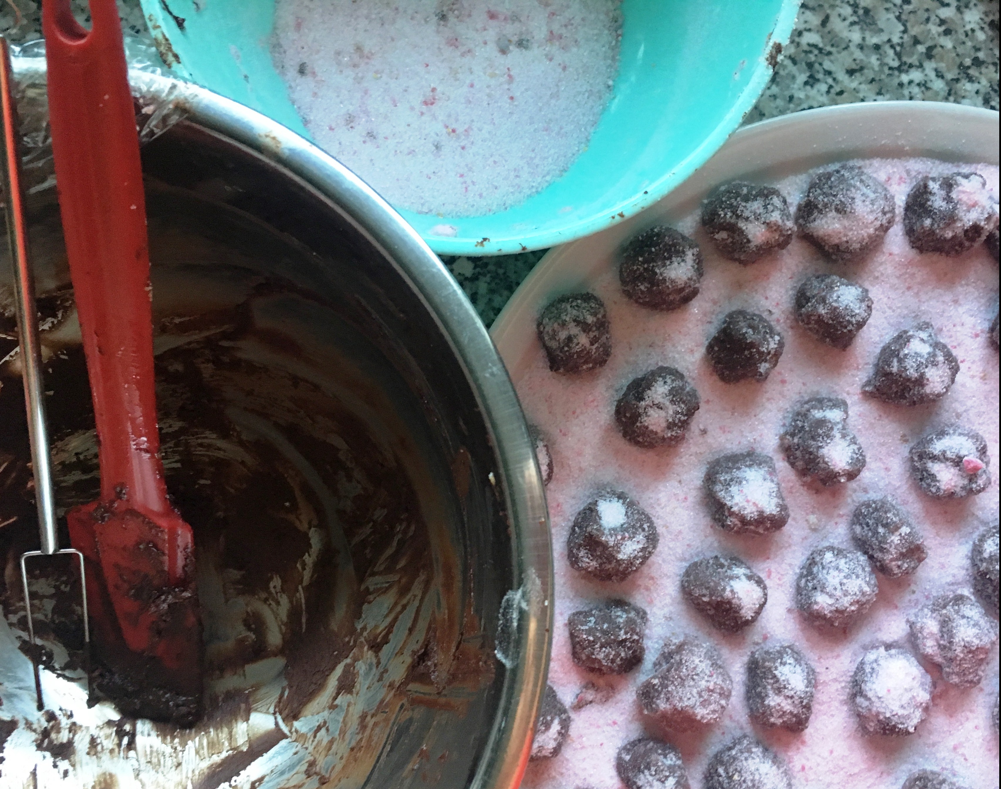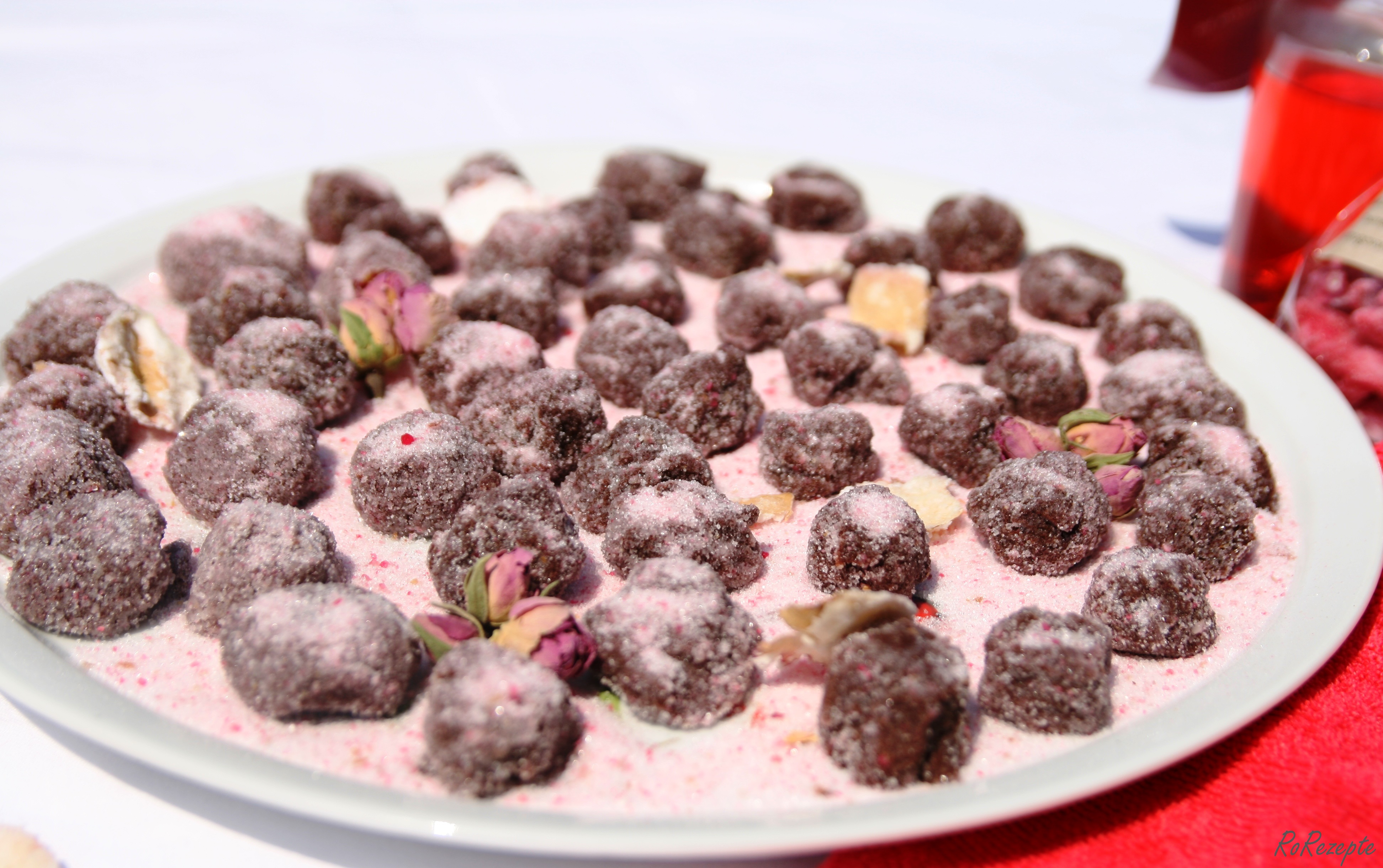 mit Zucker vermengen - und darin Kugeln aus der Rosenganache wälzen.
