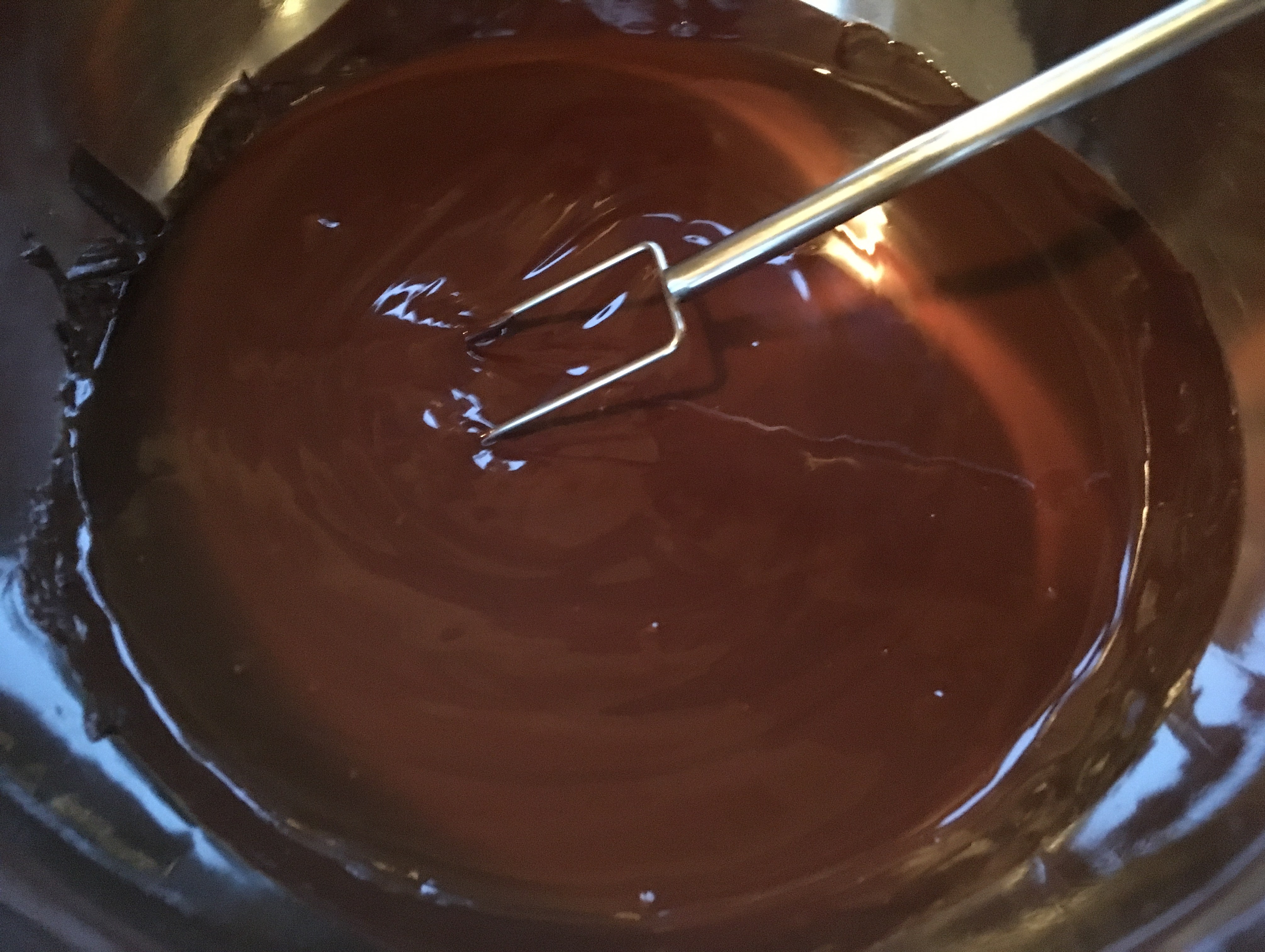 - 250g Zartbitterkuvertüre (65% Kakaoanteil) schmelzen.