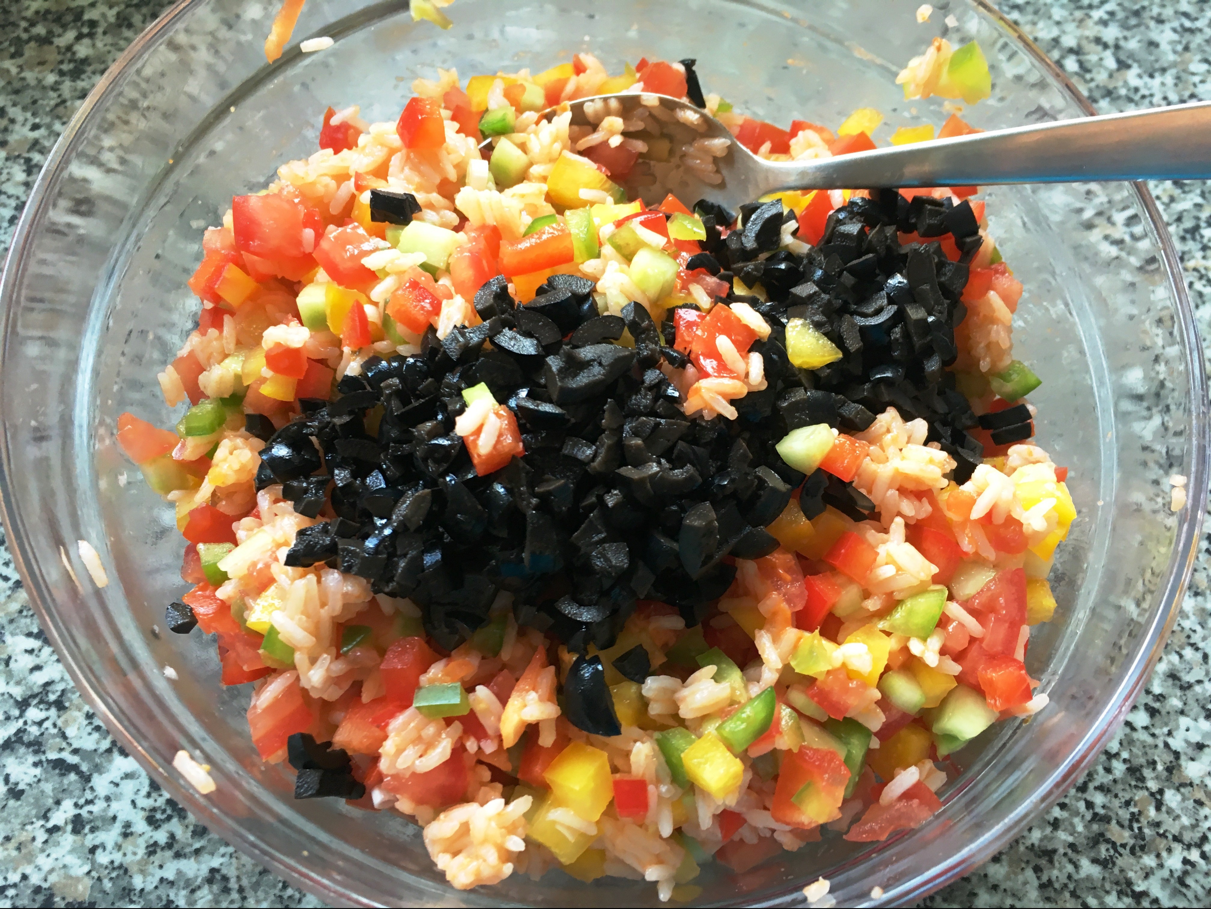 Reis und Gemüse vermengen gewürfelte Oliven dazugeben