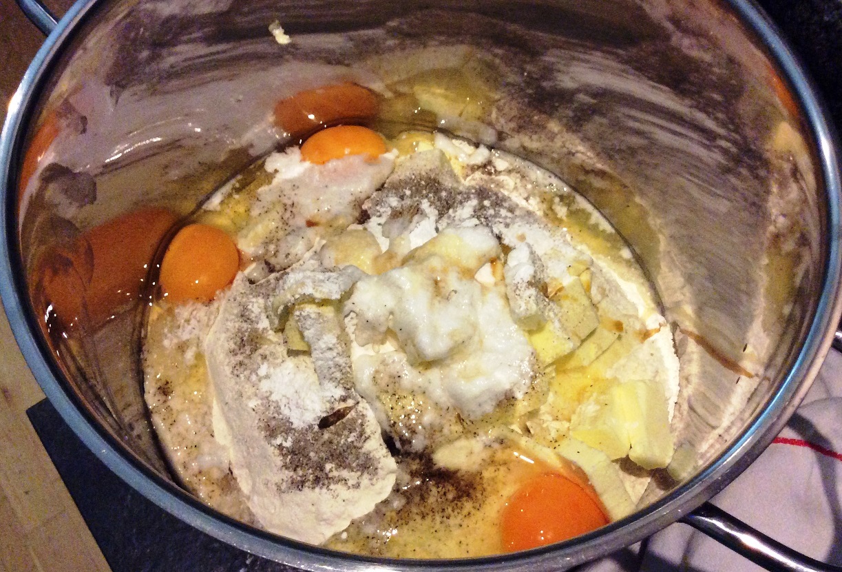 Zutaten Teig Teigboden ausrollen - Für die Creme Schmand, Zucker und Vanillepuddingpulver mit dem Handmixer verrühren. Anschließend die Mandarinen mit dem Handmixer so unterrühren, dass die Früchte leicht zerpflückt werden.