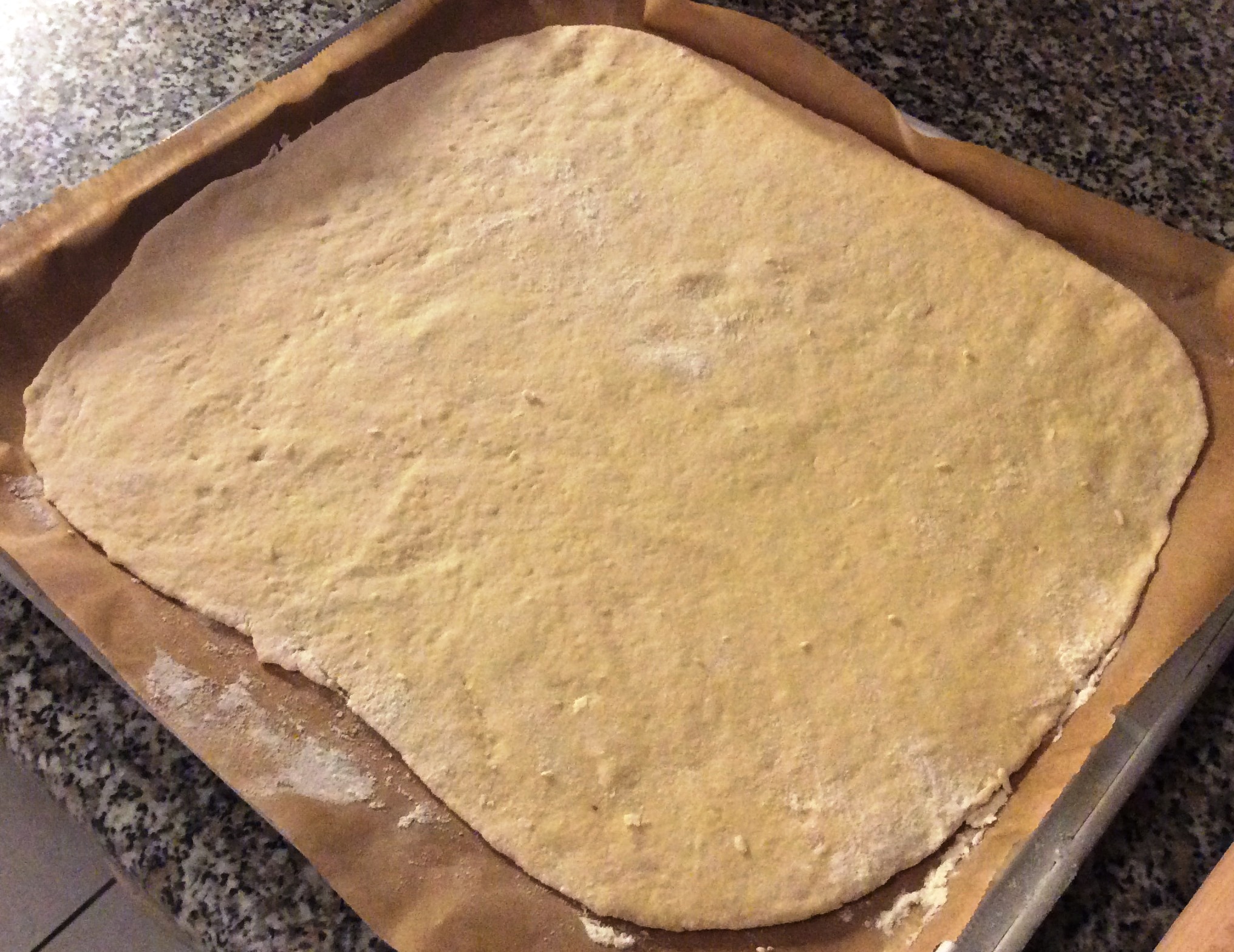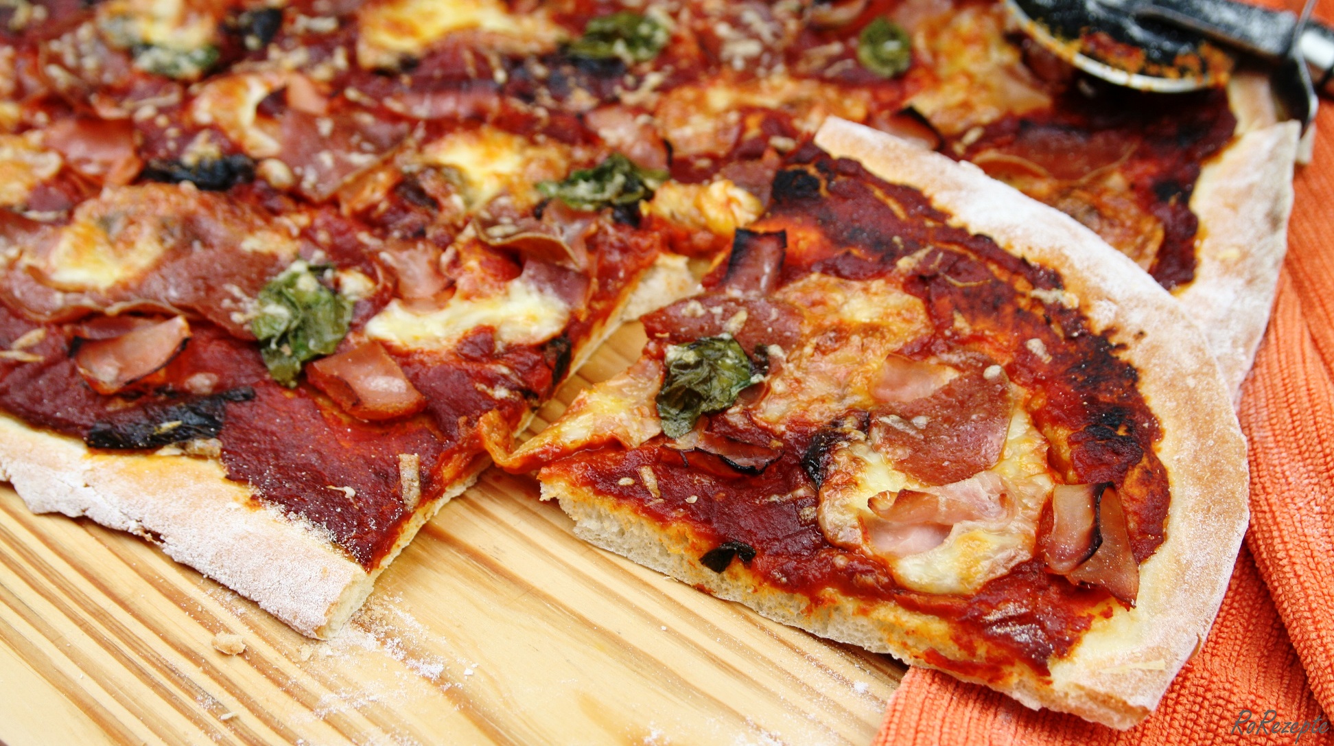 - Den Teig rolle ich dünn aus, gebe ihn auf ein mit Backpapier ausgelegtes Blech und bestreiche ihn mit der Tomatensauce. Darauf kommt der klein geschnittene Mozzarella, erst danach folgt der restliche Belag. Den Mozzarella ruhig noch kleiner schneiden und mehr verteilen.