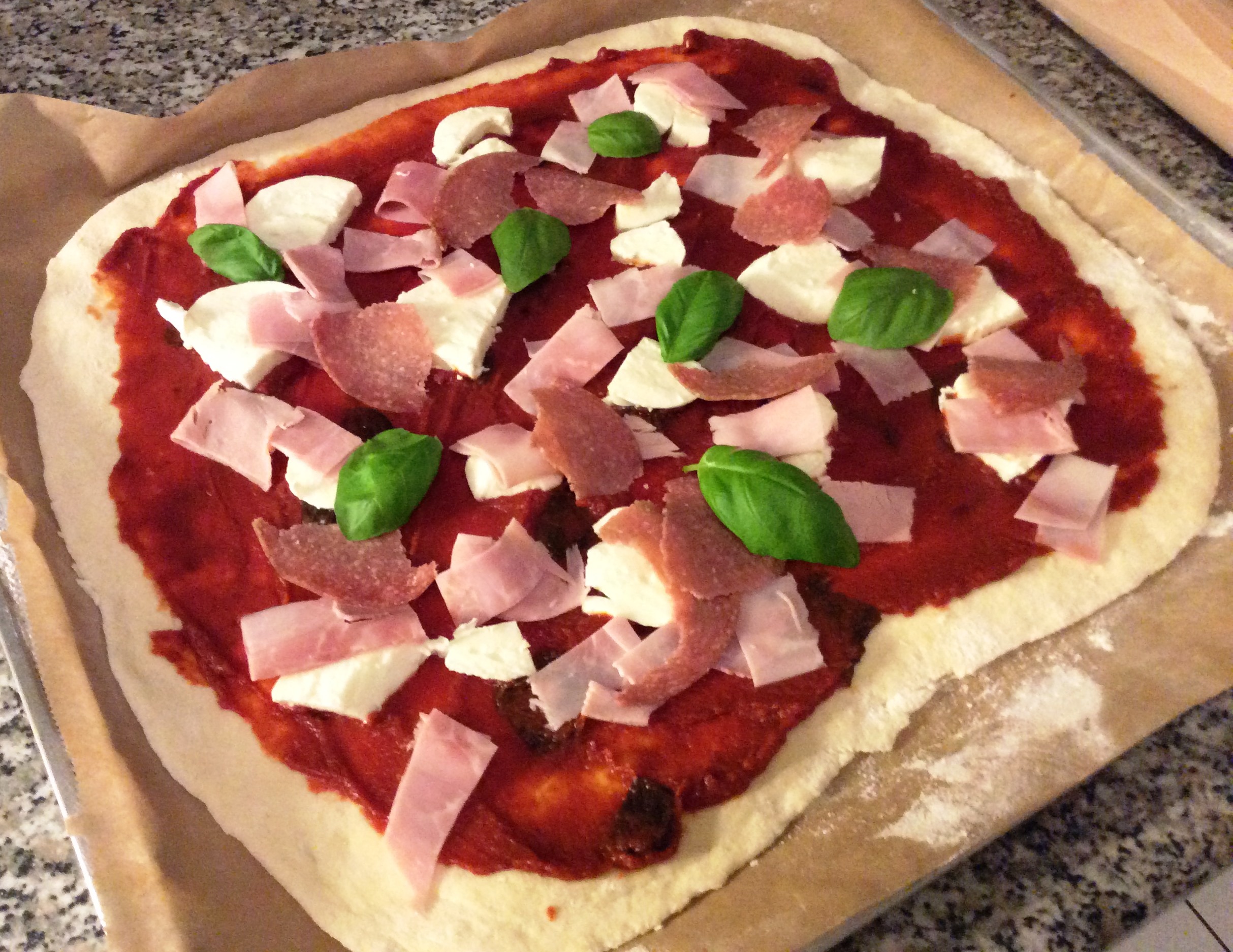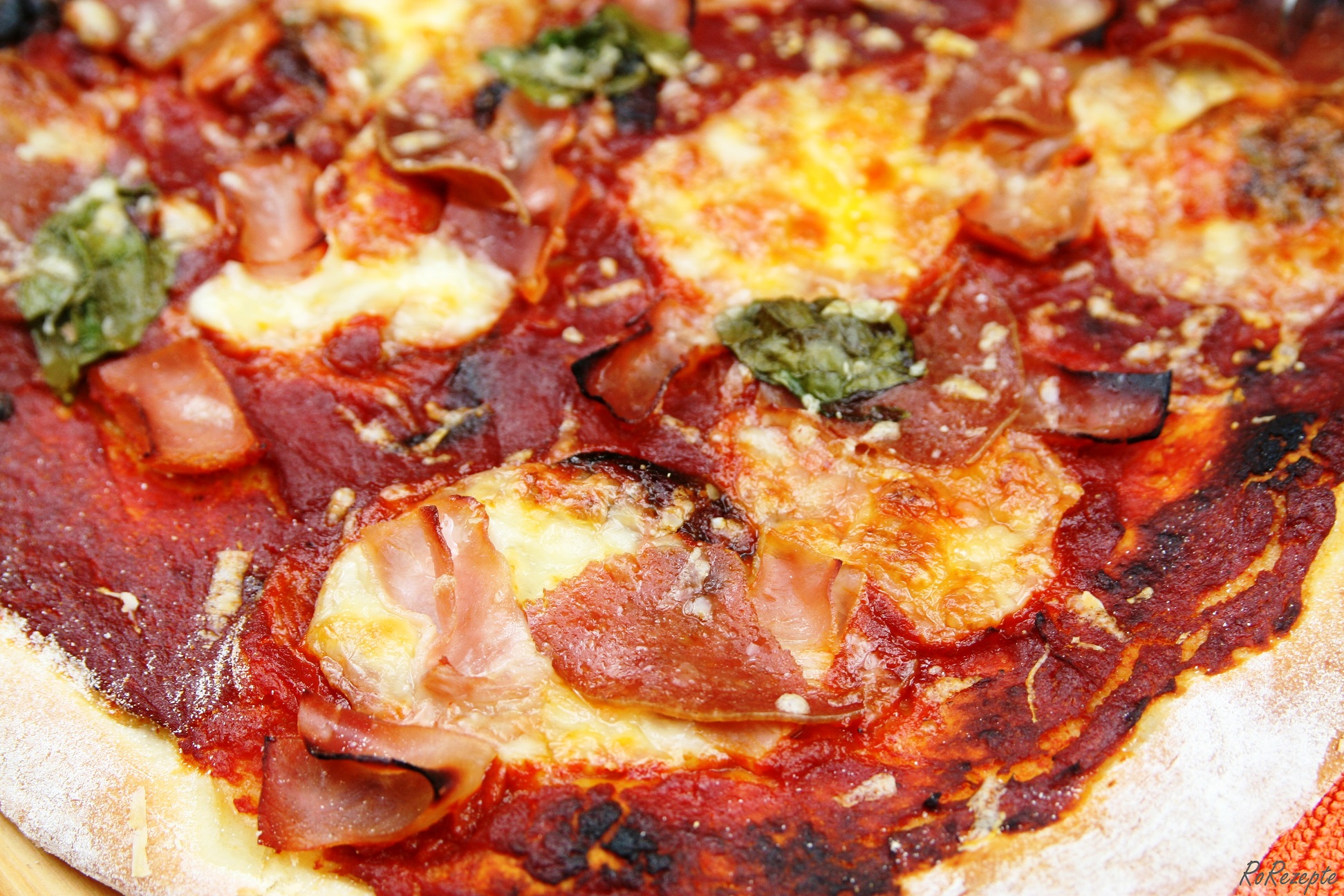 Teig ausrollen mit Tomatensoße bestreichen belegen - Auf der untersten Schiene backe ich die Pizza 8 bis 10 Minuten.