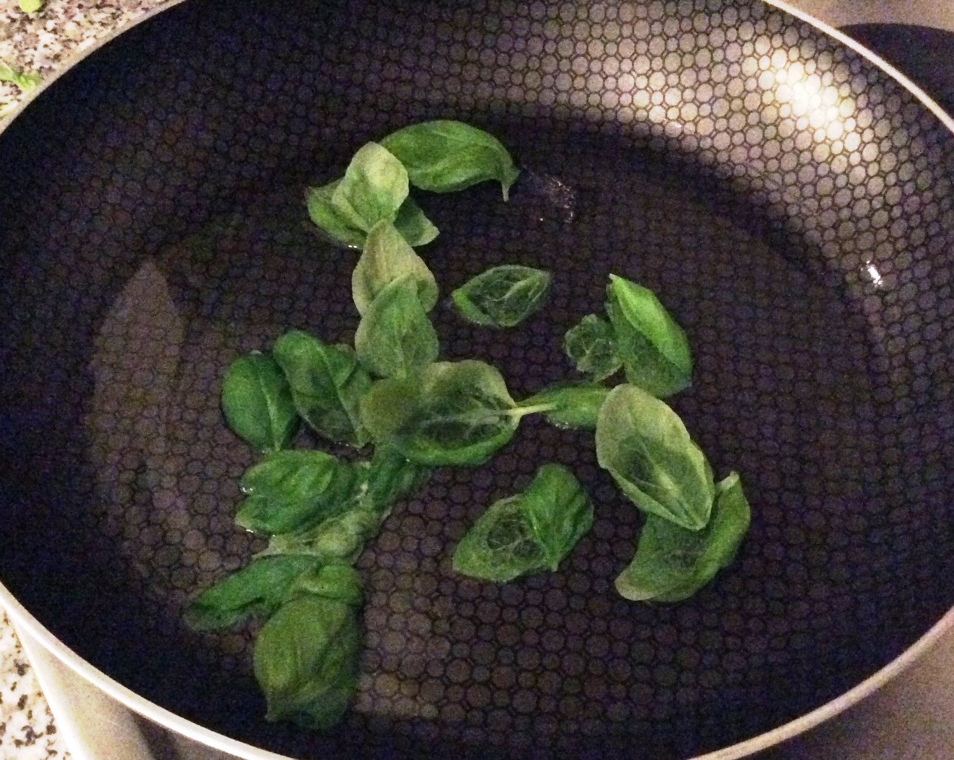 Grieß, Mehl, Salz und Hefegemisch vermengen Teig gehen lassen - In der Zwischenzeit erhitze ich das Olivenöl in einer Pfanne und brate zuerst kurz das Basilikum an,