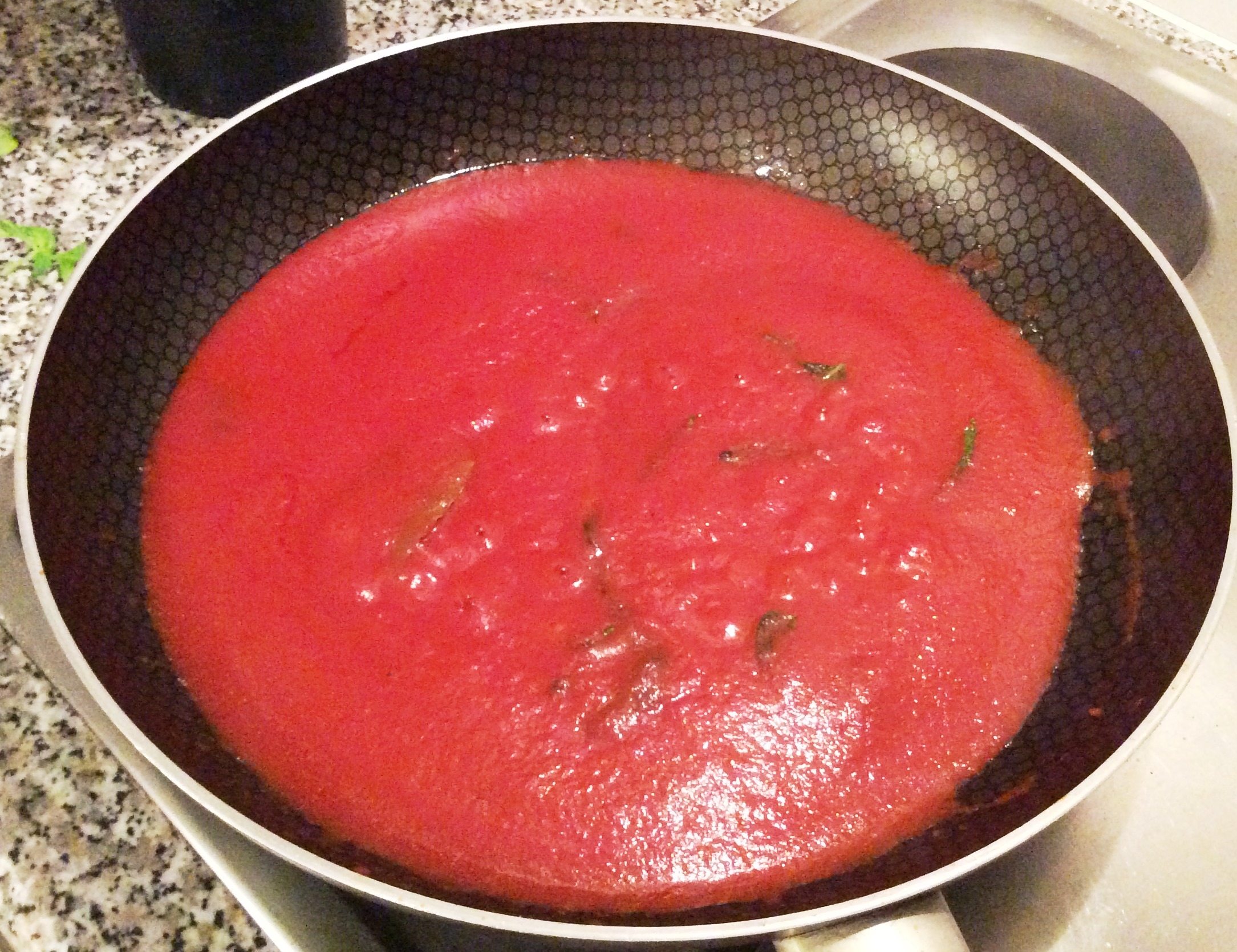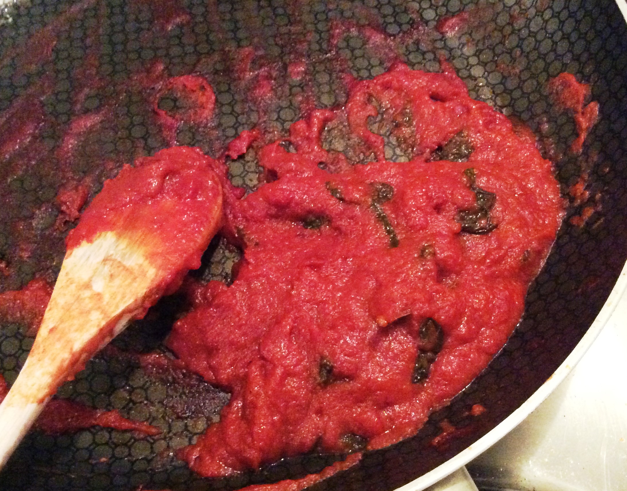 Basilikum anrösten - bevor ich das Tomatenmark und die Dosentomaten hinzugebe. Dann kommen Salz, Pfeffer, die Chilischote sowie das Lorbeerblatt in die Pfanne. Das Ganze lasse ich auf kleiner Flamme eine gute Stunde lang kochen. Zum Schluss fische ich Chili und Lorbeer heraus.