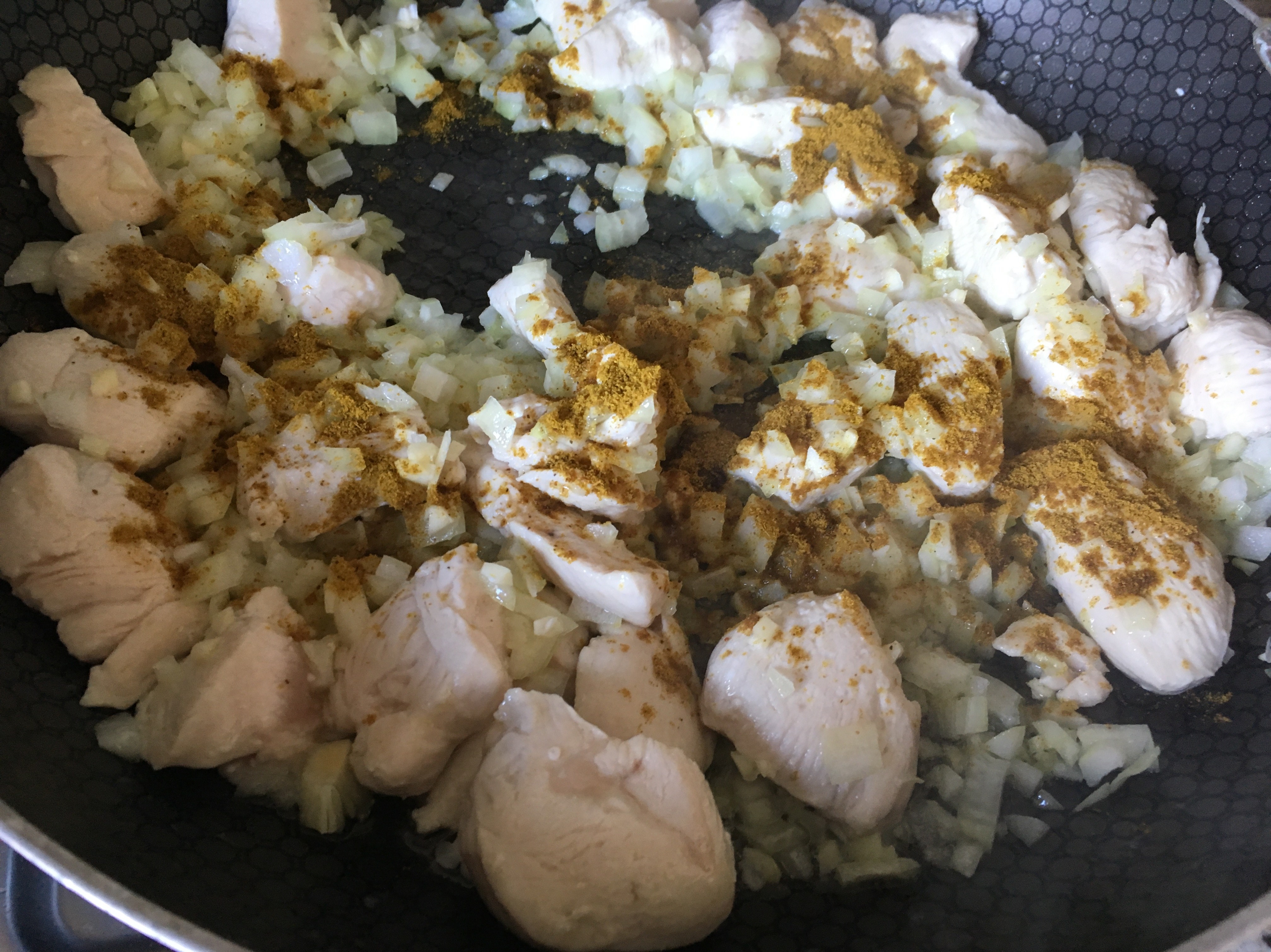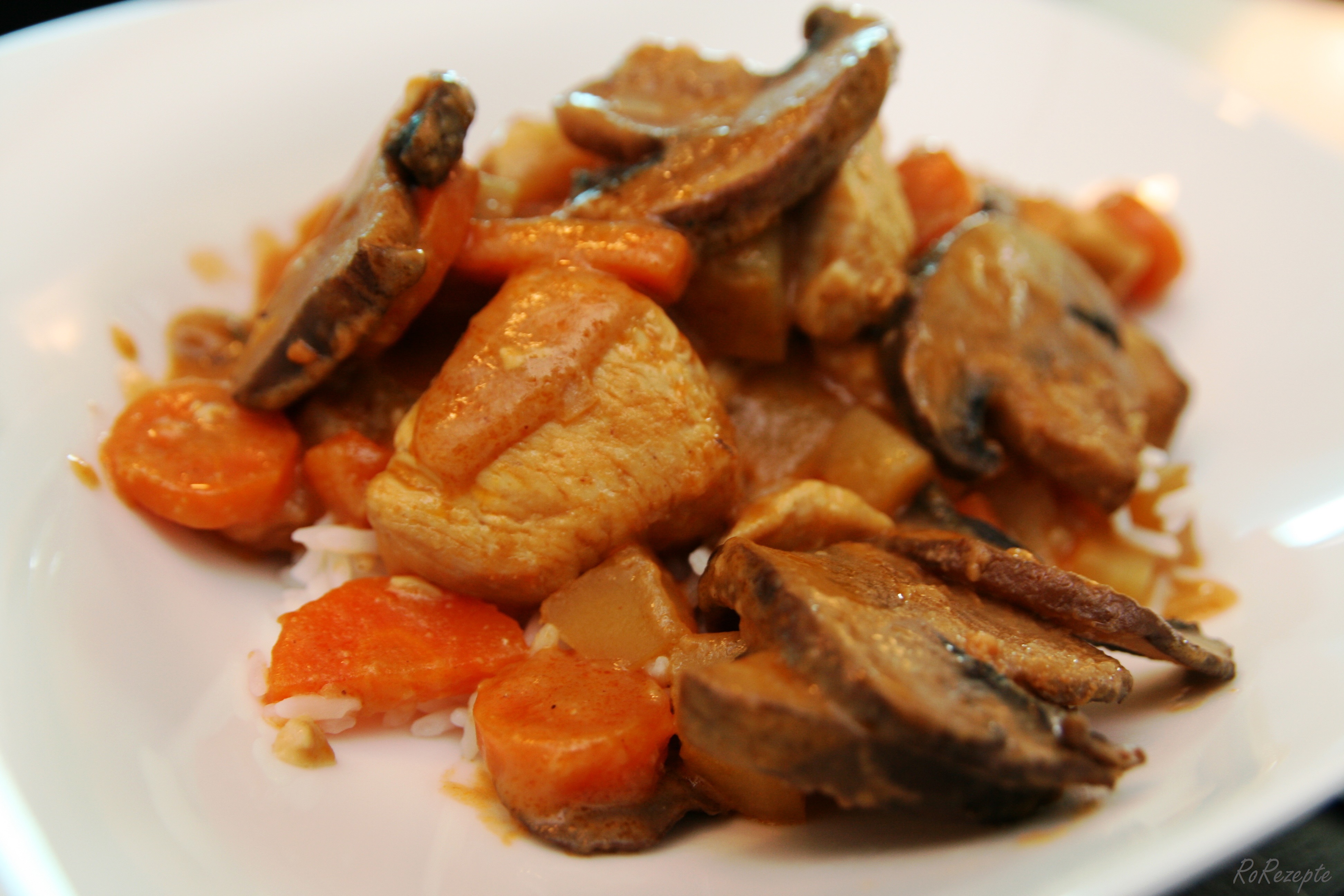Vorbereitung - Das Öl in einem Topf erhitzen und die Fleischstücke anbraten, dann die gewürfelten Zwiebel mit dem gepressten Knoblauch und dem Currypulver dazugeben und kurz mitbraten,
