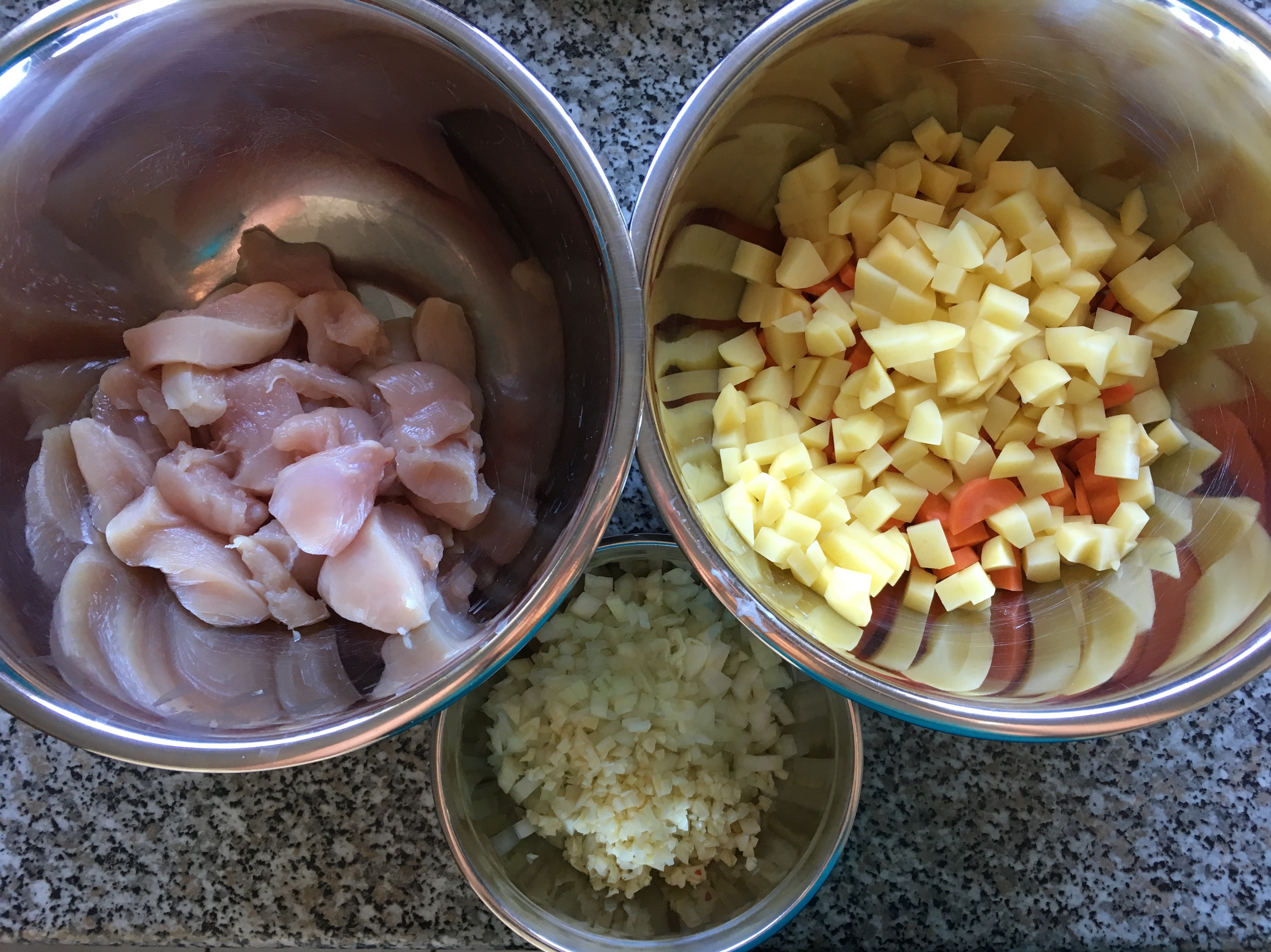 - Das Fleisch in Stücke schneiden, das Gemüse putzen und ebenfalls in Stücke schneiden, Zwiebeln würfeln, Knoblauch pressen.