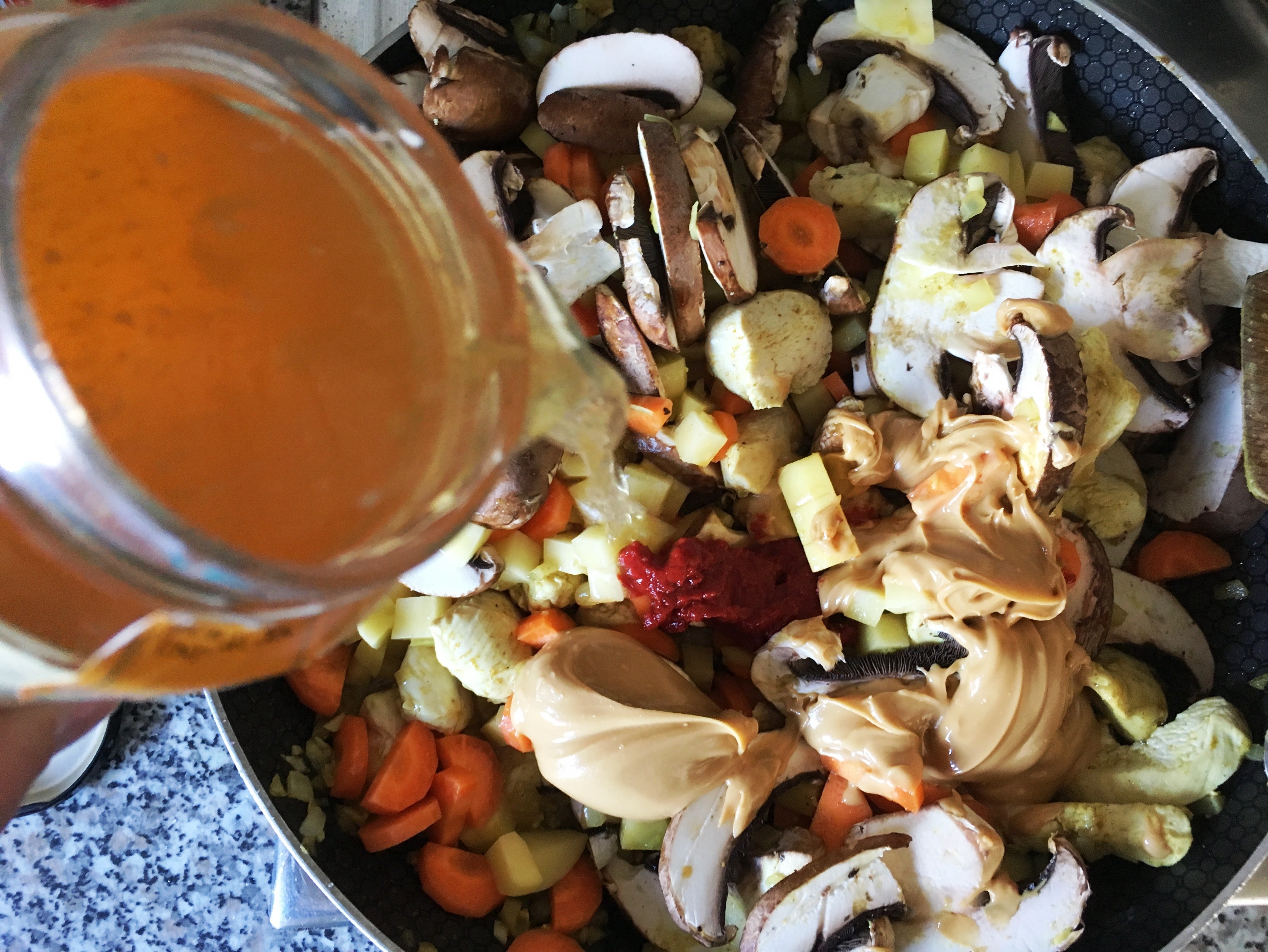 Brühe, Erdnussbutter, Tomatenmark, Sojasoße zugeben - Aufkochen, zudecken und bei kleiner Hitze 20 – 30 Minuten kochen lassen, bis Fleisch und Gemüse gar sind, dabei immer wieder umrühren, damit nichts ansetzt.