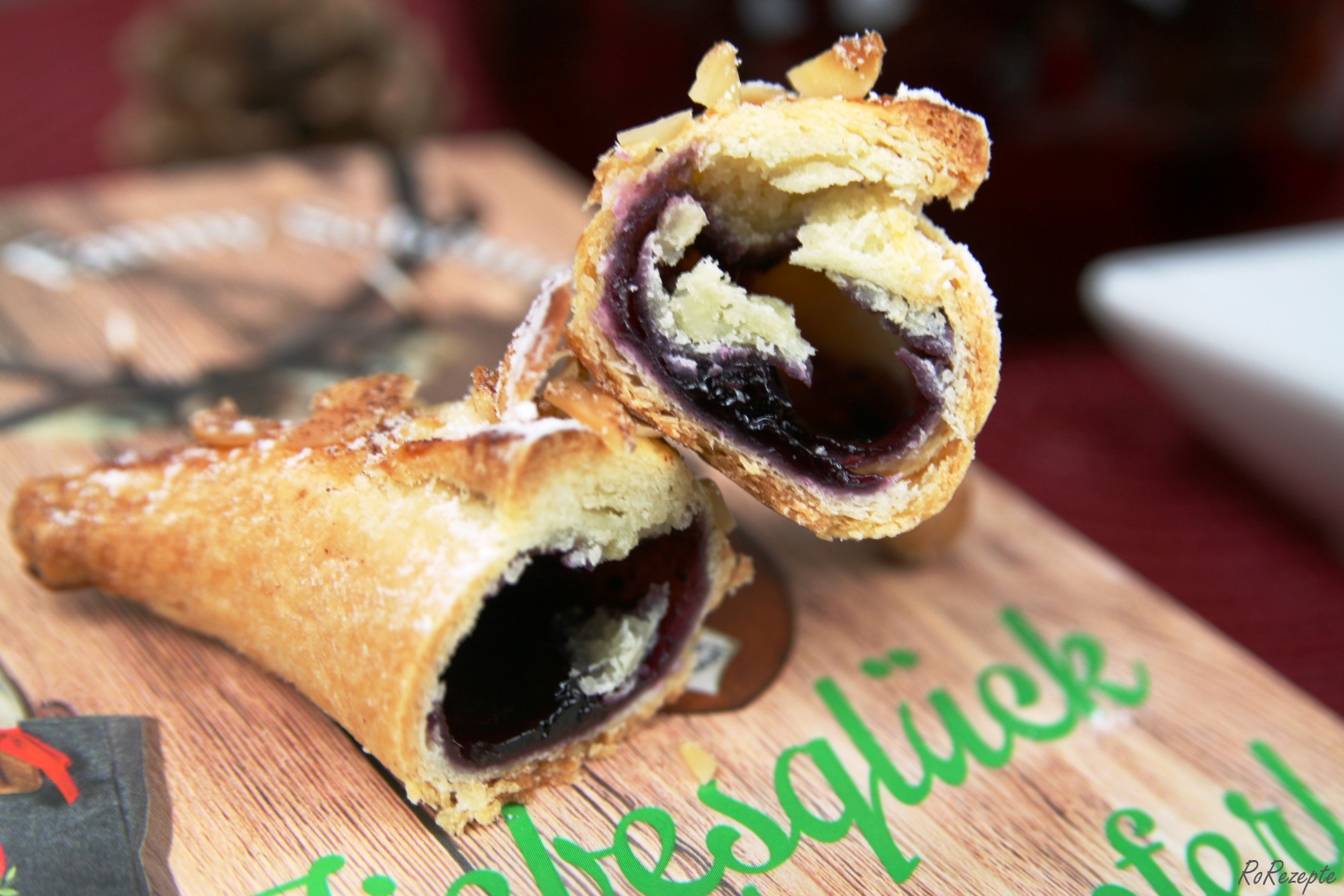 Die mit Heidelbeermarmelade gefüllten Kipferl sind, besonders warm serviert, richtig lecker. Auch wenn der Teig ungebacken einen zweifeln lässt, überrascht die Quark-Heidelbeere-Kombination auf voller Linie.