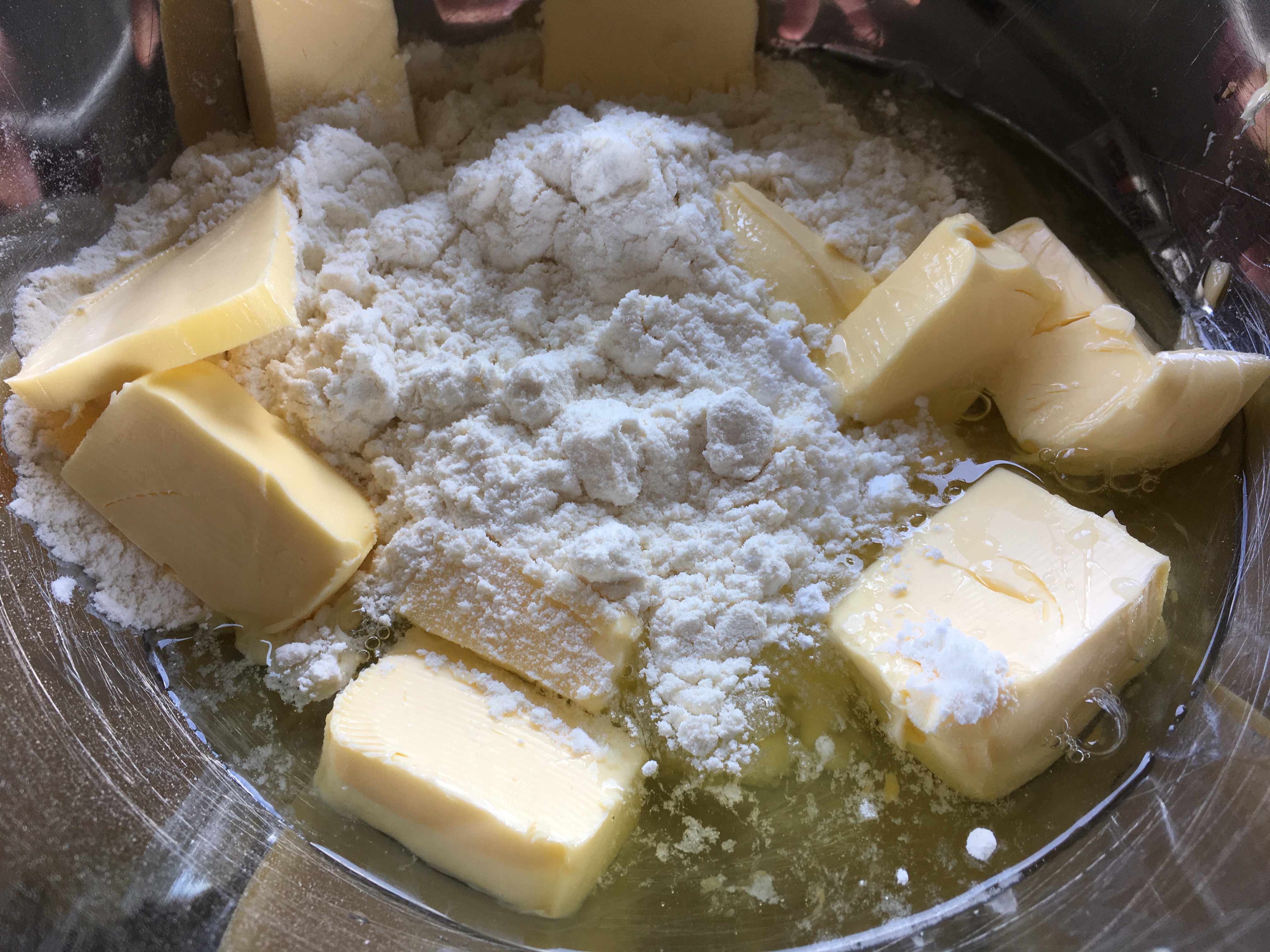 Butter mit Mehl und Puderzucker Butter mit Mehl, Puderzucker und Eiweiß - Bei 180 Grad im vorgeheizten Backofen backe ich die Biscuits, bis die Ränder goldbraun sind.
