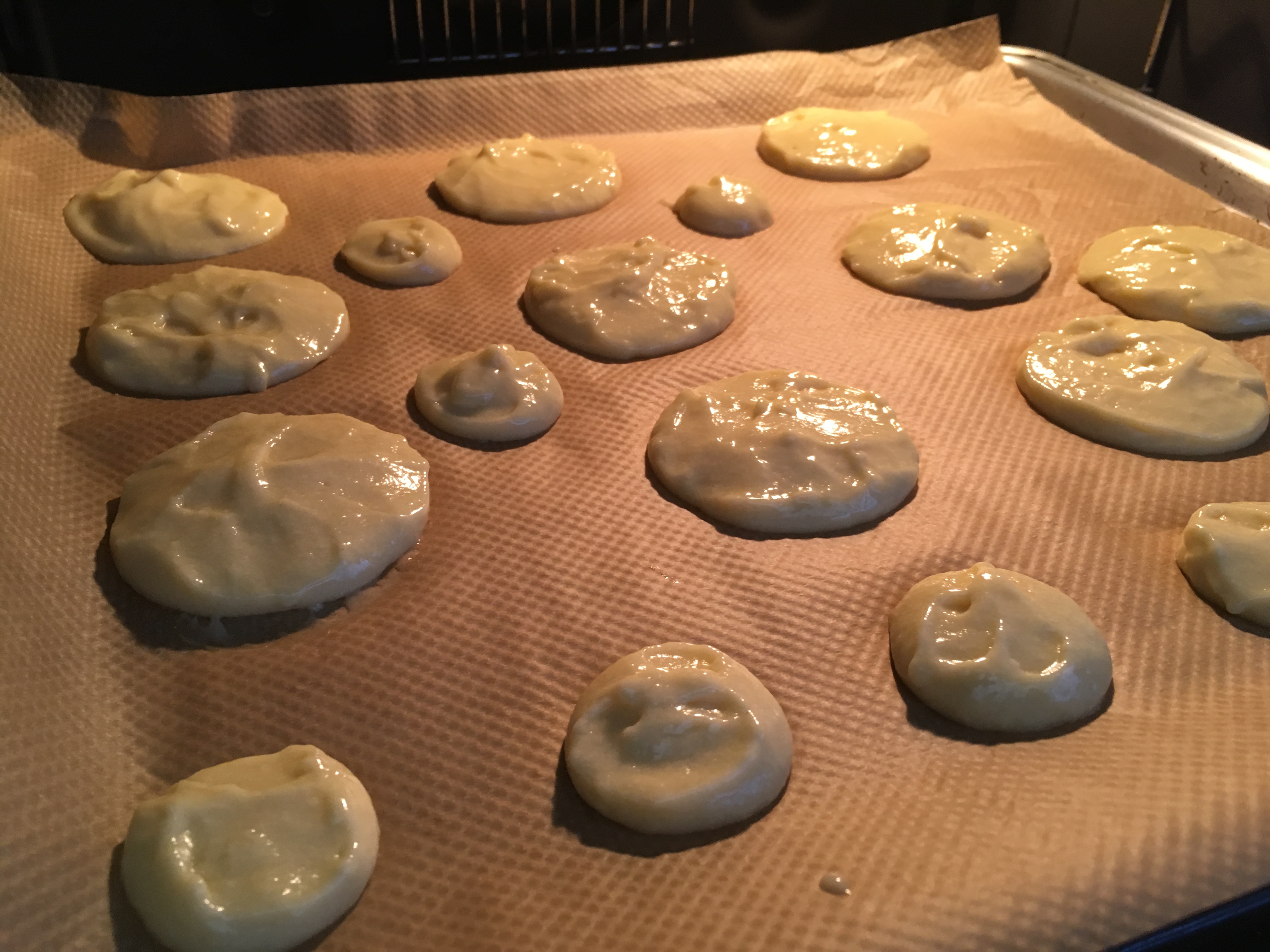- Ich habe mich hier gefragt, wann genau ich nun die Biscuits aussteche… Da ich die schönen goldbraunen Ränder an jedem Biscuit wollte, habe ich den Teig ca. eine halbe Stunde in den KĂĽhlschrank “zum Fester werden” gestellt um ihn anschlieĂźend mit Hilfe von Ausstechern den Teig in Form zu bringen. Lustigerweise durfte ich dann im Ofen feststellen, dass ich mir das Ganze hätte sparen können – sie zerliefen. Nur die kleinen blieben in einem halbwegs guten Radius. Aber fĂĽr die Zukunft und fĂĽr alle Ăśberlegenden: Streicht den Teig als ganzes dĂĽnn aus und stecht die Formen nach dem Backen aus. 🙂