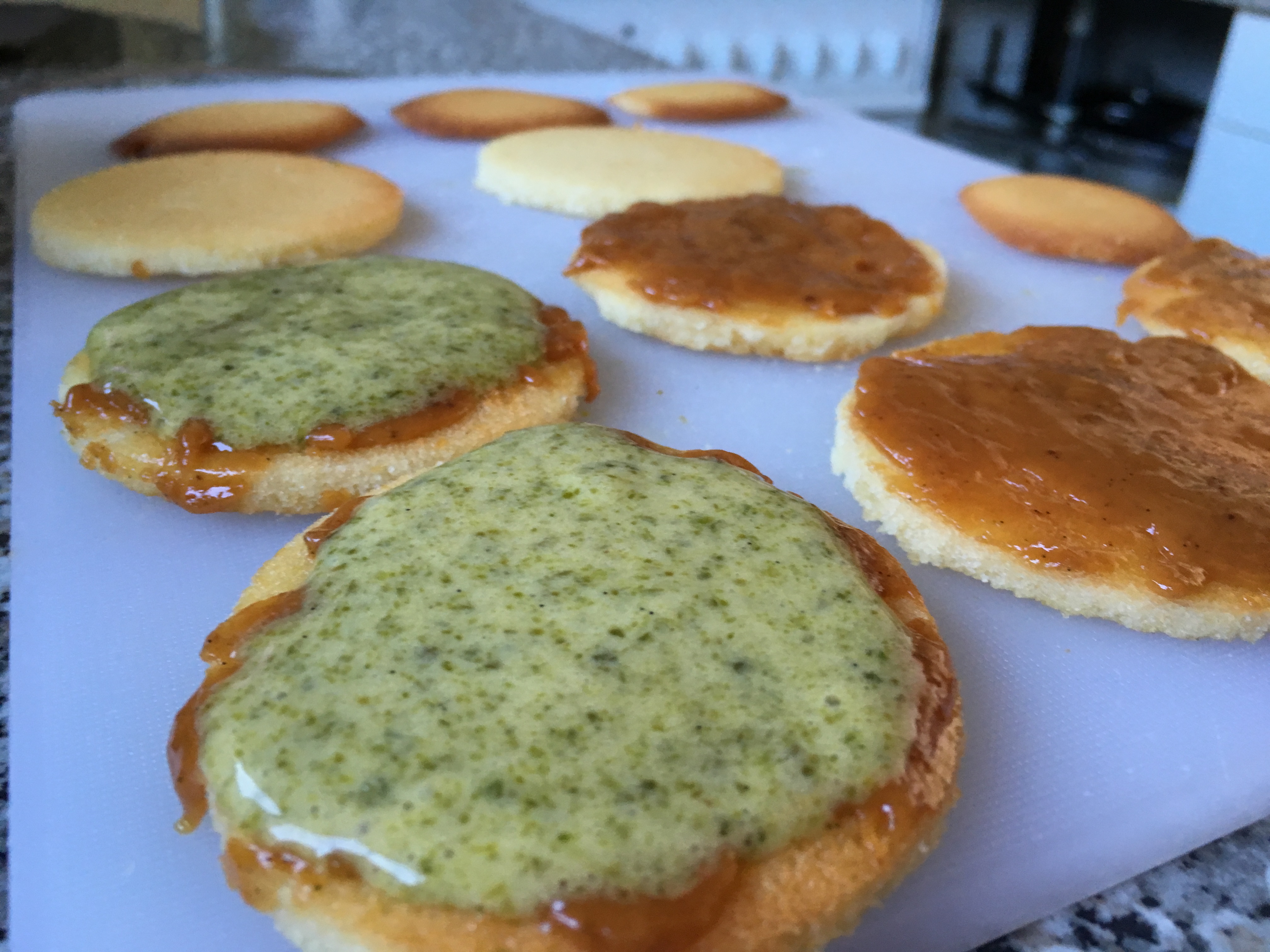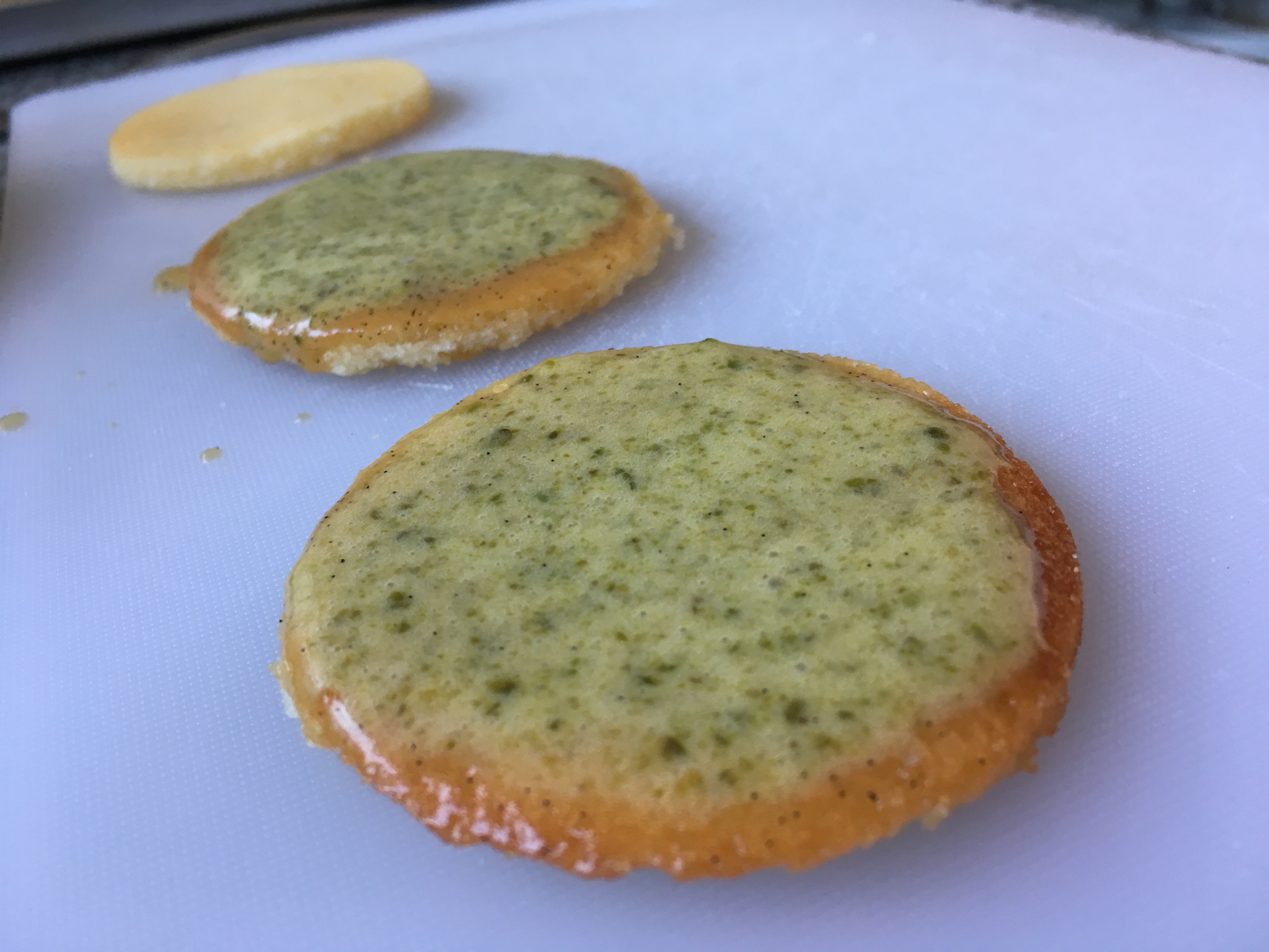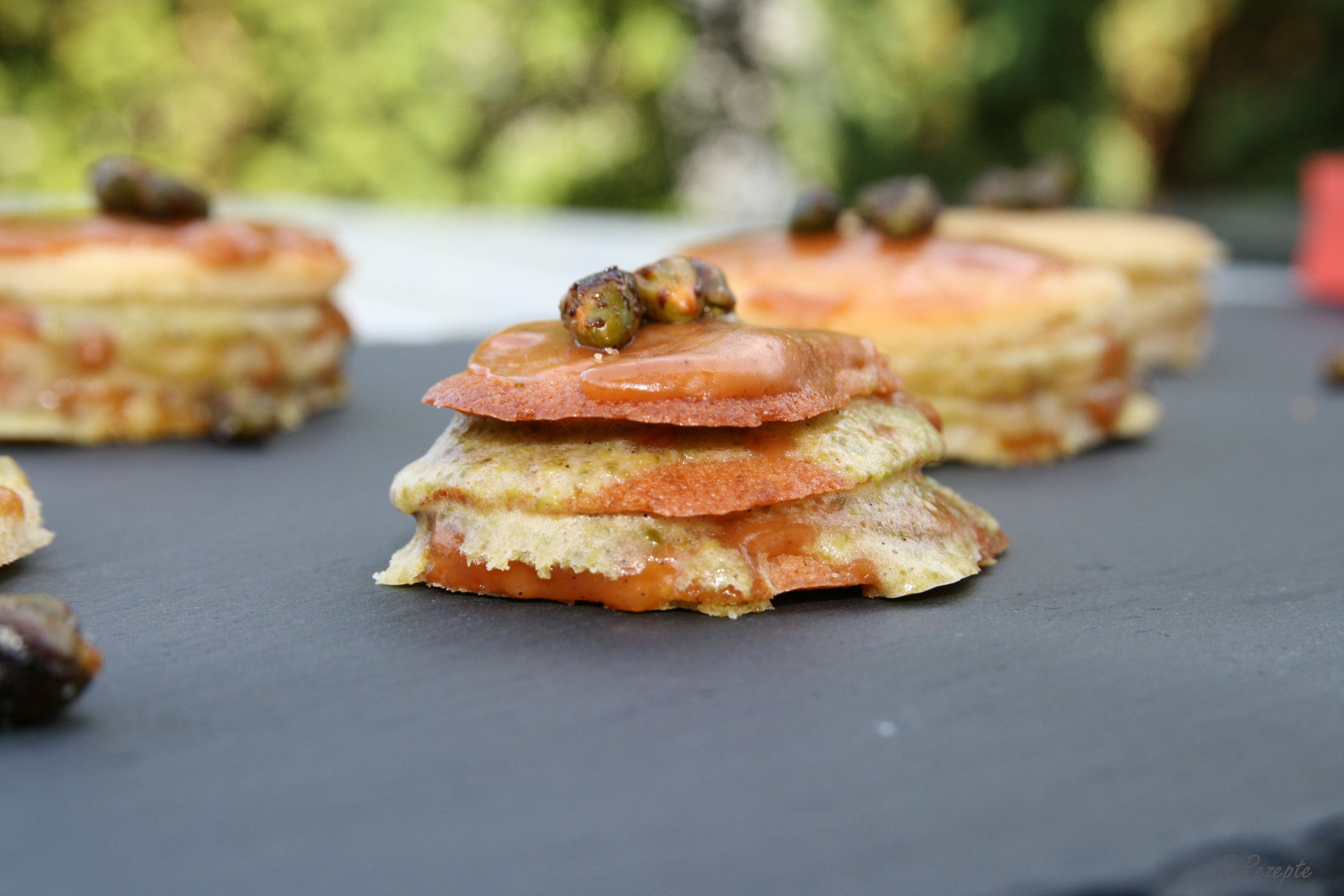 - Dann nehme ich jeweils drei der dĂĽnnen Biscuits und schichte sie abwechselnd mit dem gesalzenen Karamell und dem Pistazienmousse.
