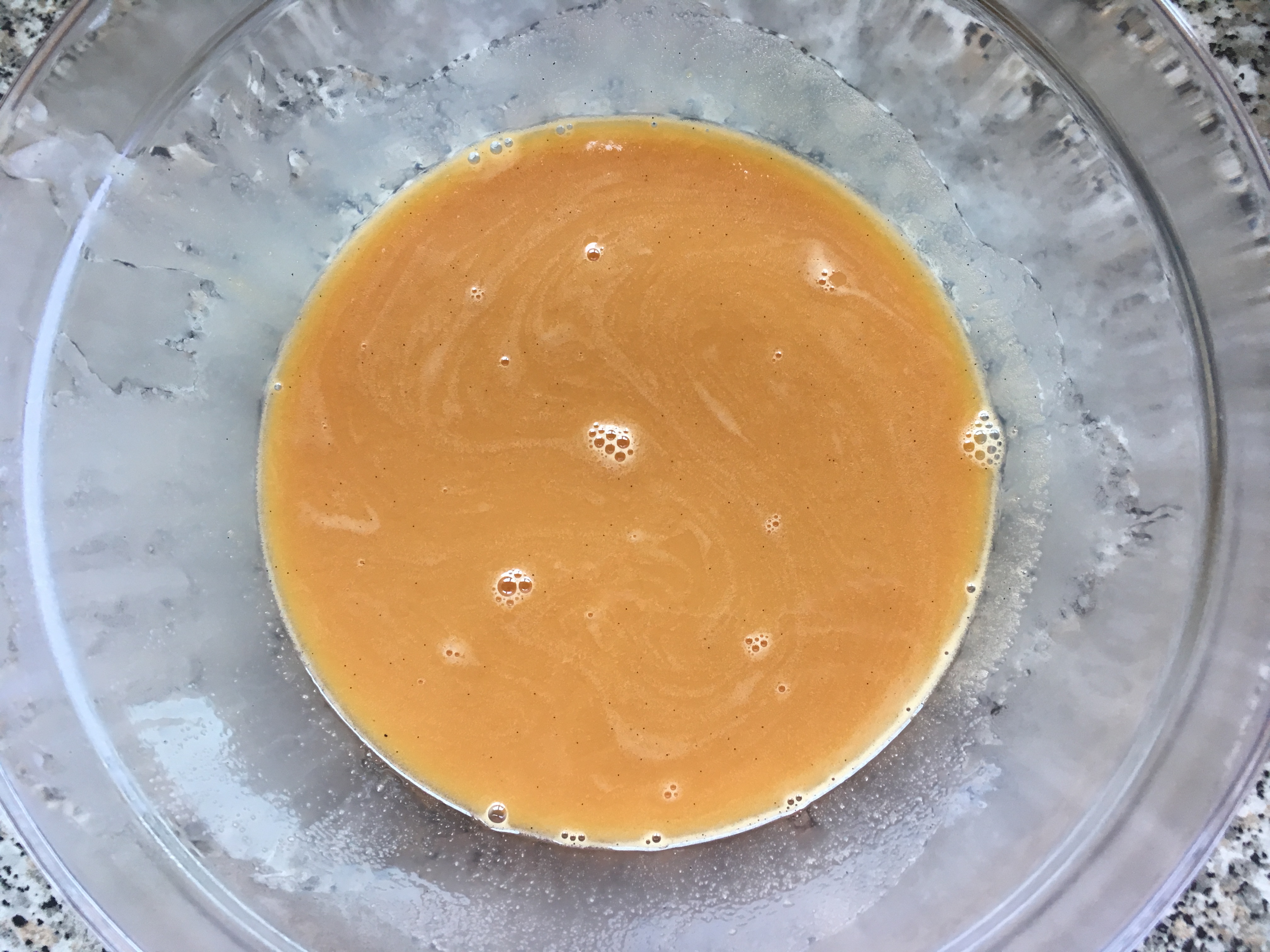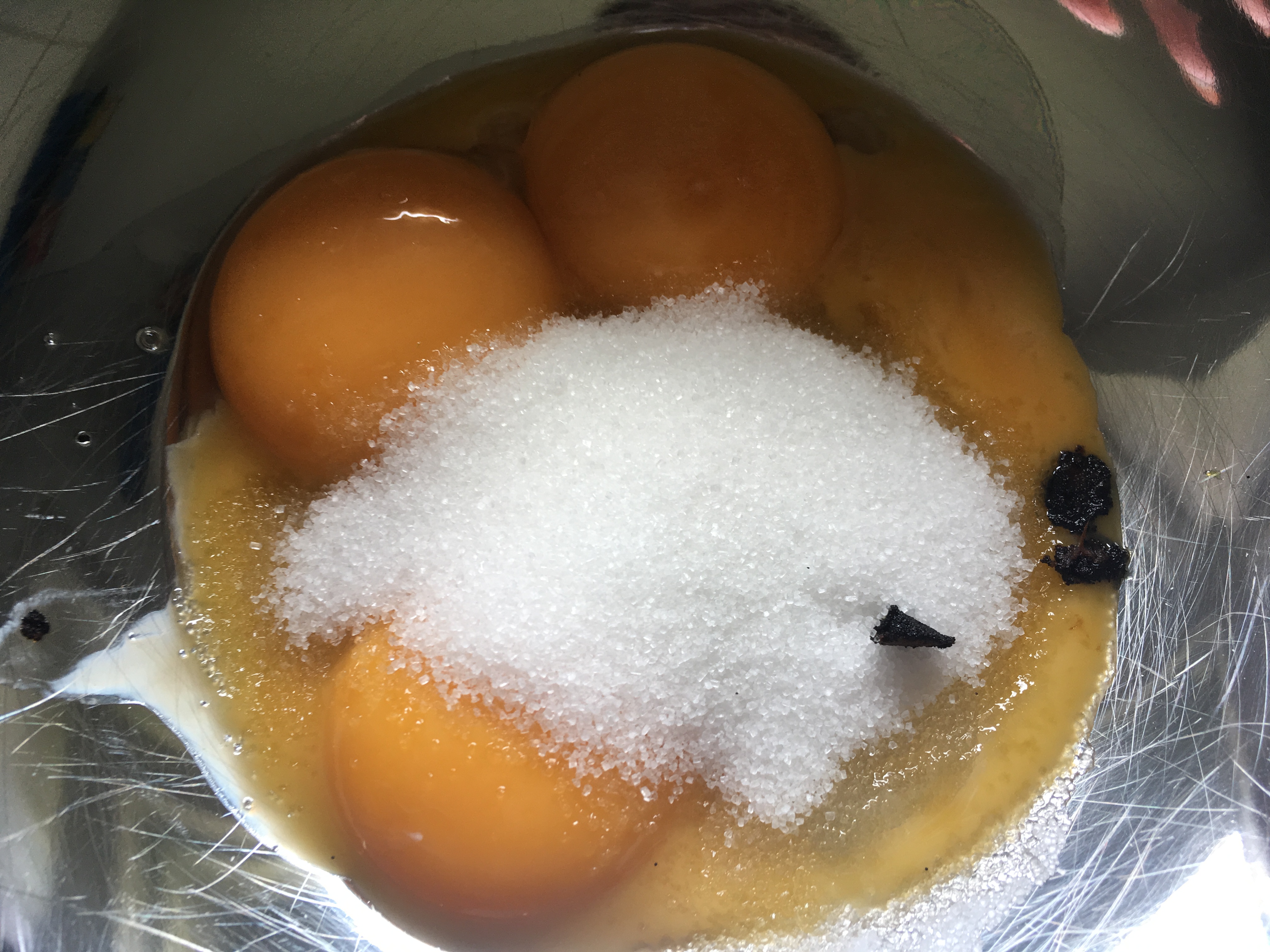 - In einer separaten SchĂĽssel schlage ich das Eigelb mit dem Zucker und dem Vanillemark cremig. Dies kann bis zu zehn Minuten dauern.