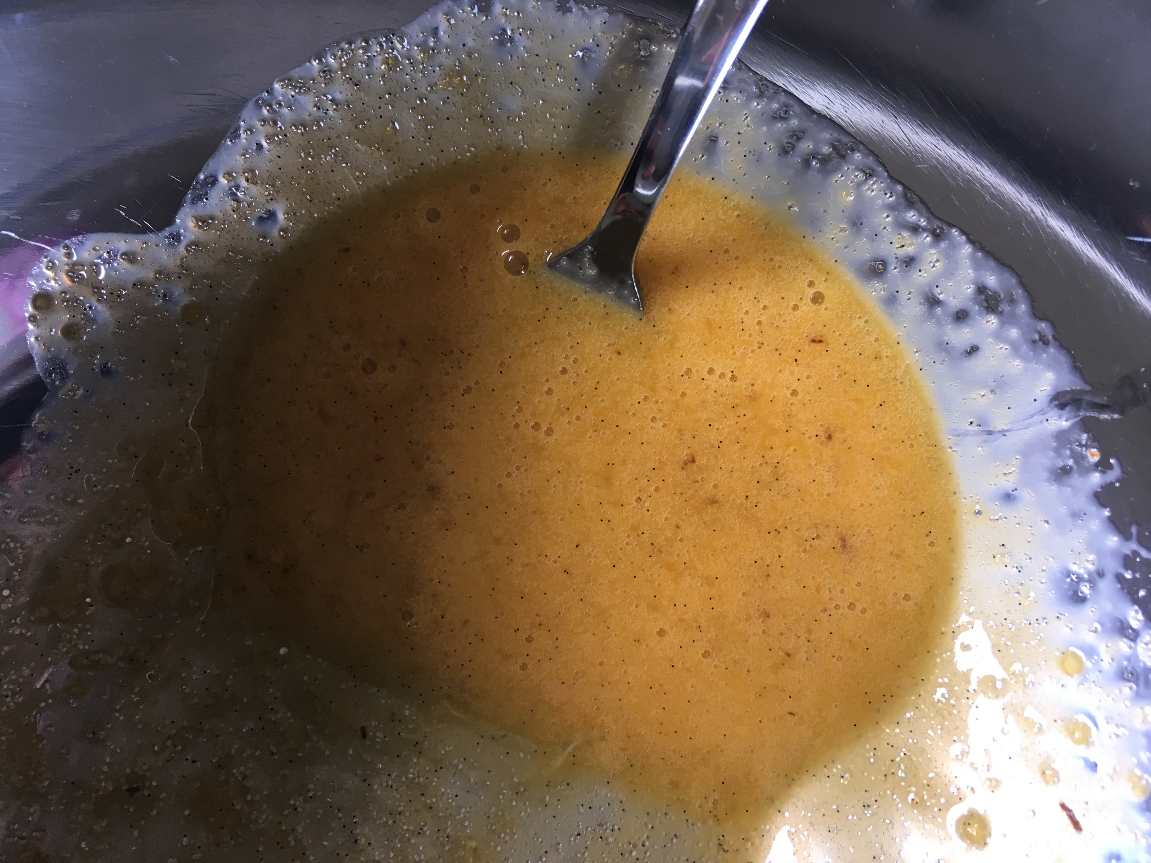 Zucker karamelisieren - Die ausgekratzte Vanilleschote gebe ich zusammen mit der Sahne in die Pfanne. Ständiges Rühren nicht vergessen!