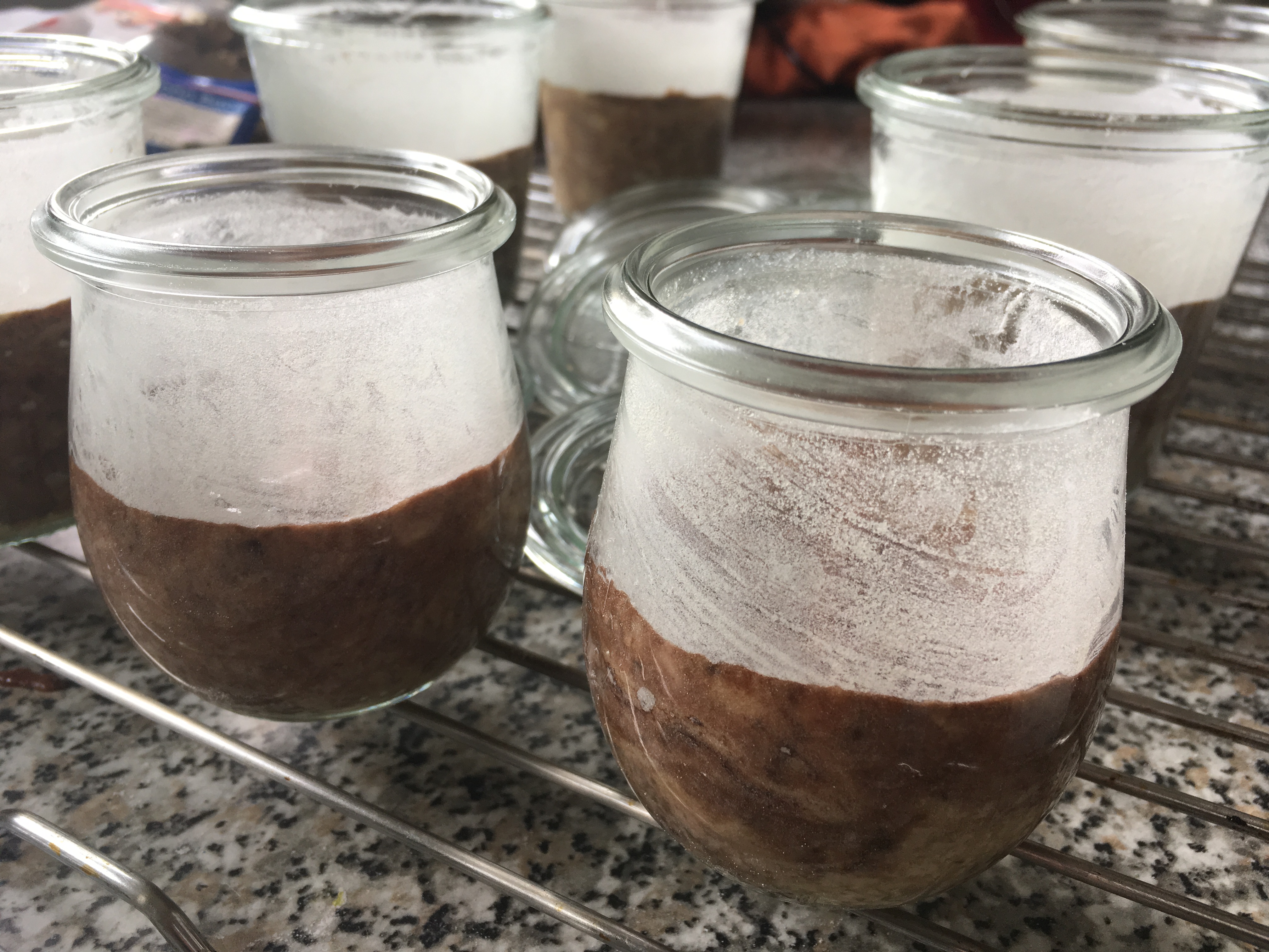 - Den Backofen auf 180 Grad Umluft vorheizen. 6 Weck-Sturzgläser mit 250ml Inhalt einfetten und mit Mehl ausstreuen. Das überschüssige Mehl abschütteln. Achtet darauf, dass der Rand der Gläser sauber bleibt. Die Dichtungsringe der Weck-Gläser in einem Topf mit heißem Wasser legen.