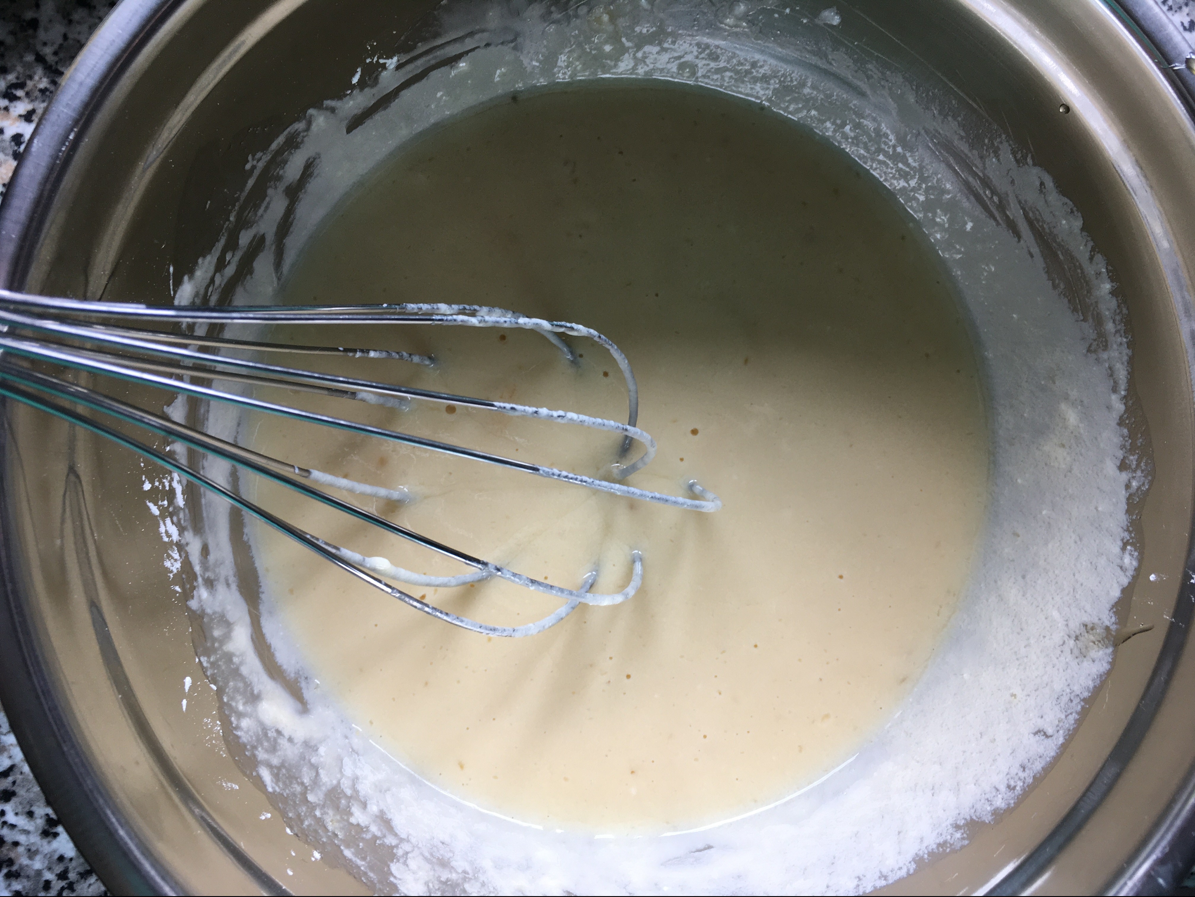 Backblech mit Teig - Eier mit Honig, saurer Sahne und der Speisestärke für den Guss verquirlen.