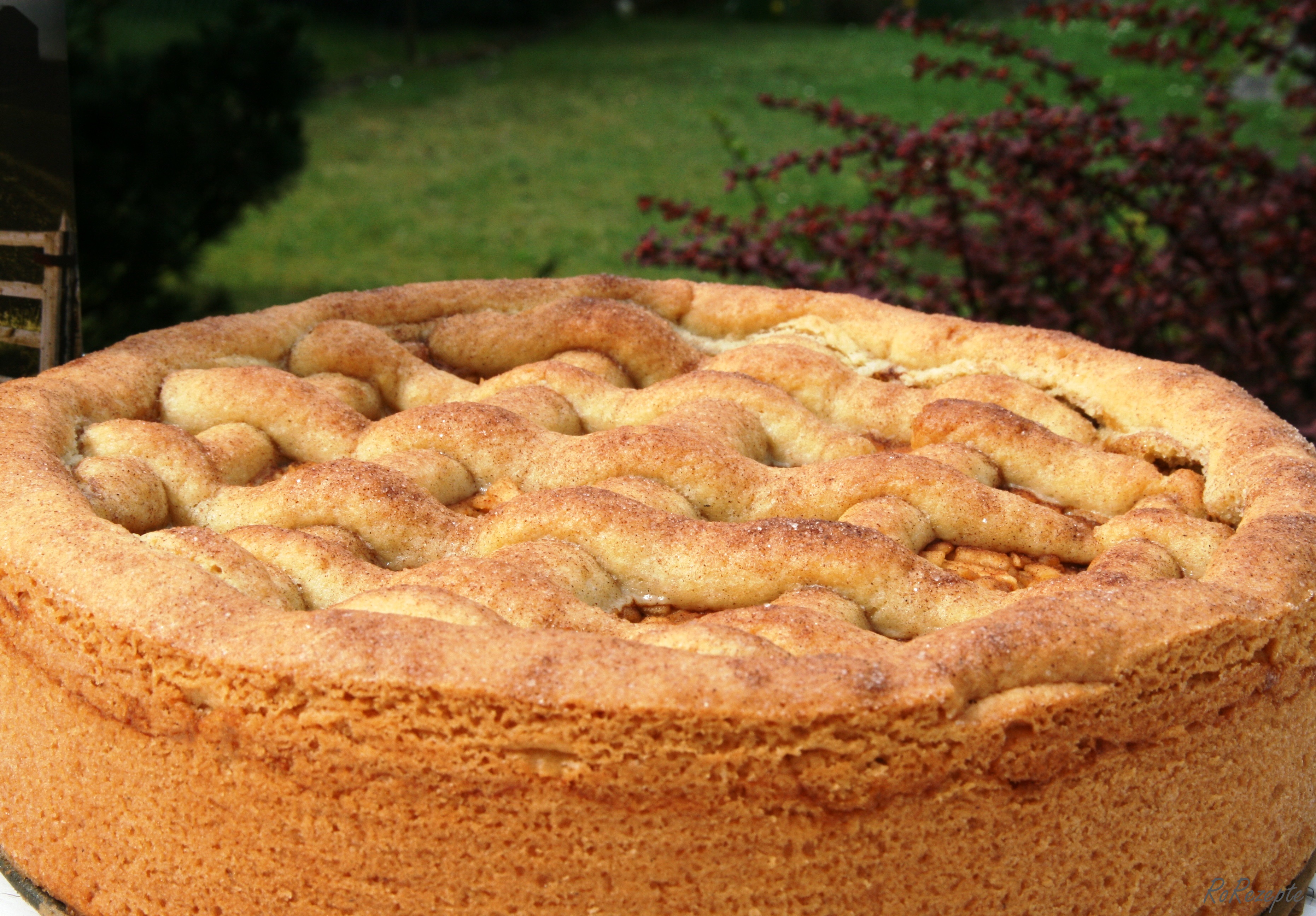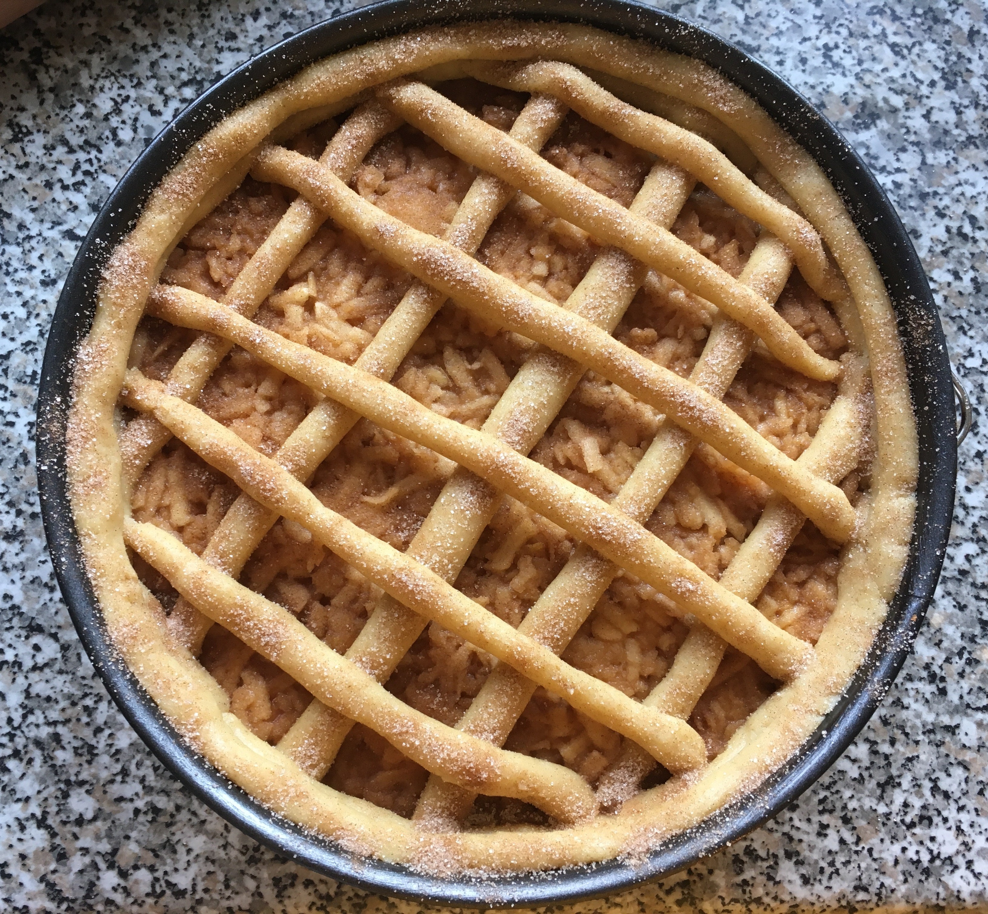 Vanillepudding befüllen Apfelraspel zugeben, Gitter legen, Zimtzucker bestreuen - Aus dem restlichen Teig das Teiggitter vorbereiten: Lange dünne Teigstangen rollen und diese auf der Apfelfüllung zu einem Gitter legen. Teigrollen auch an den Rand der Springform legen. Zimtzucker darüberstreuen und den Kuchen im Backofen bei 180°C Umluft ca. 40 Minuten backen. Nach 20 Minuten den Kuchen mit Backpapier abdecken, damit das Gitter nicht zu braun wird. Nach dem Backen den Kuchen noch etwas im Backofen ruhen lassen und anschließend mit Puderzucker bestäuben.