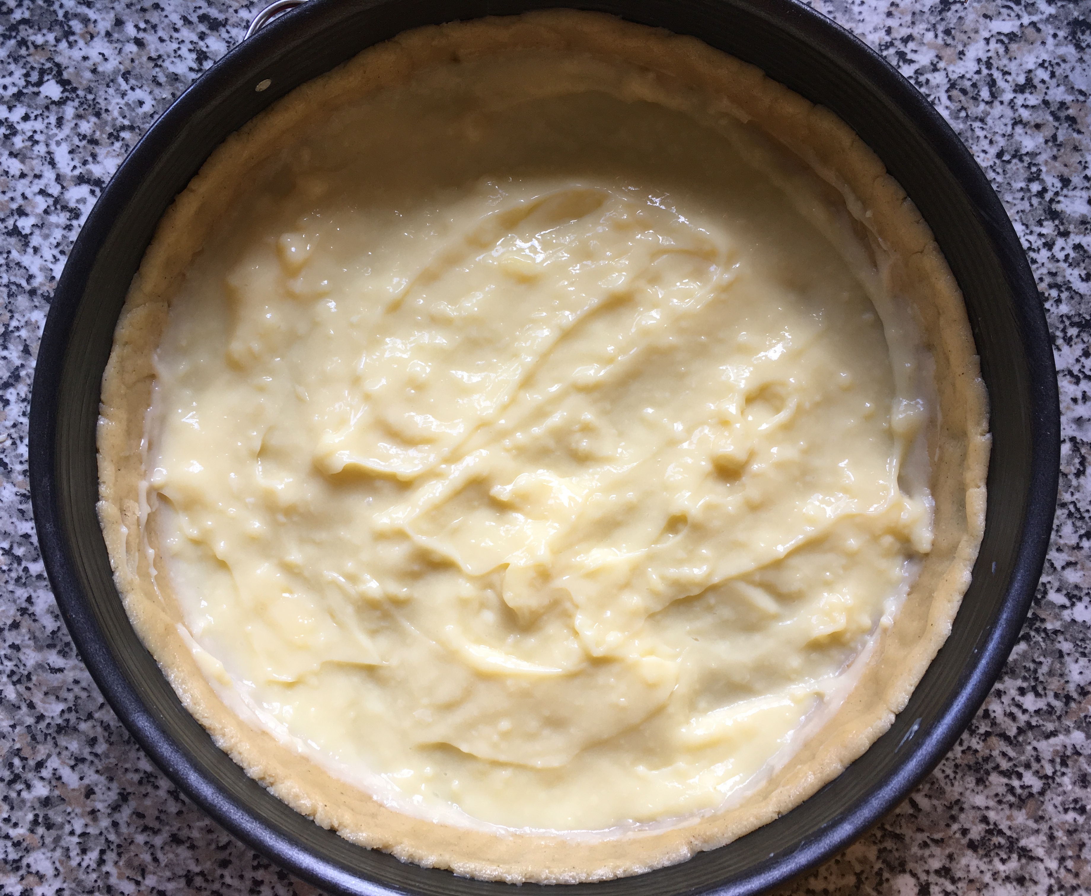 Springform mit Backpapier auslegen mit Teig den Boden und Rand bedecken - Auf den Boden den gekochten Vanillepudding geben, darauf die geraspelten Äpfel.