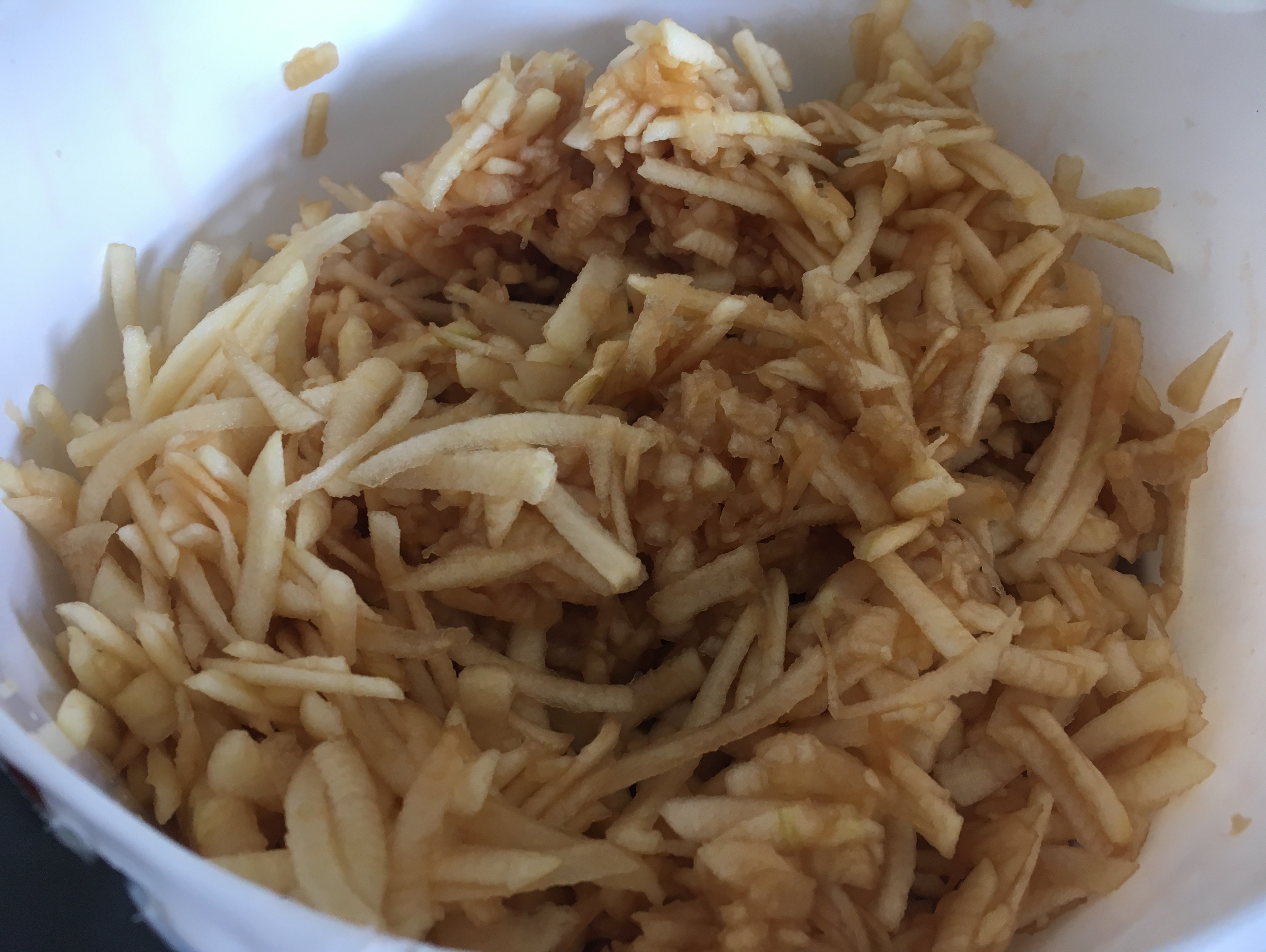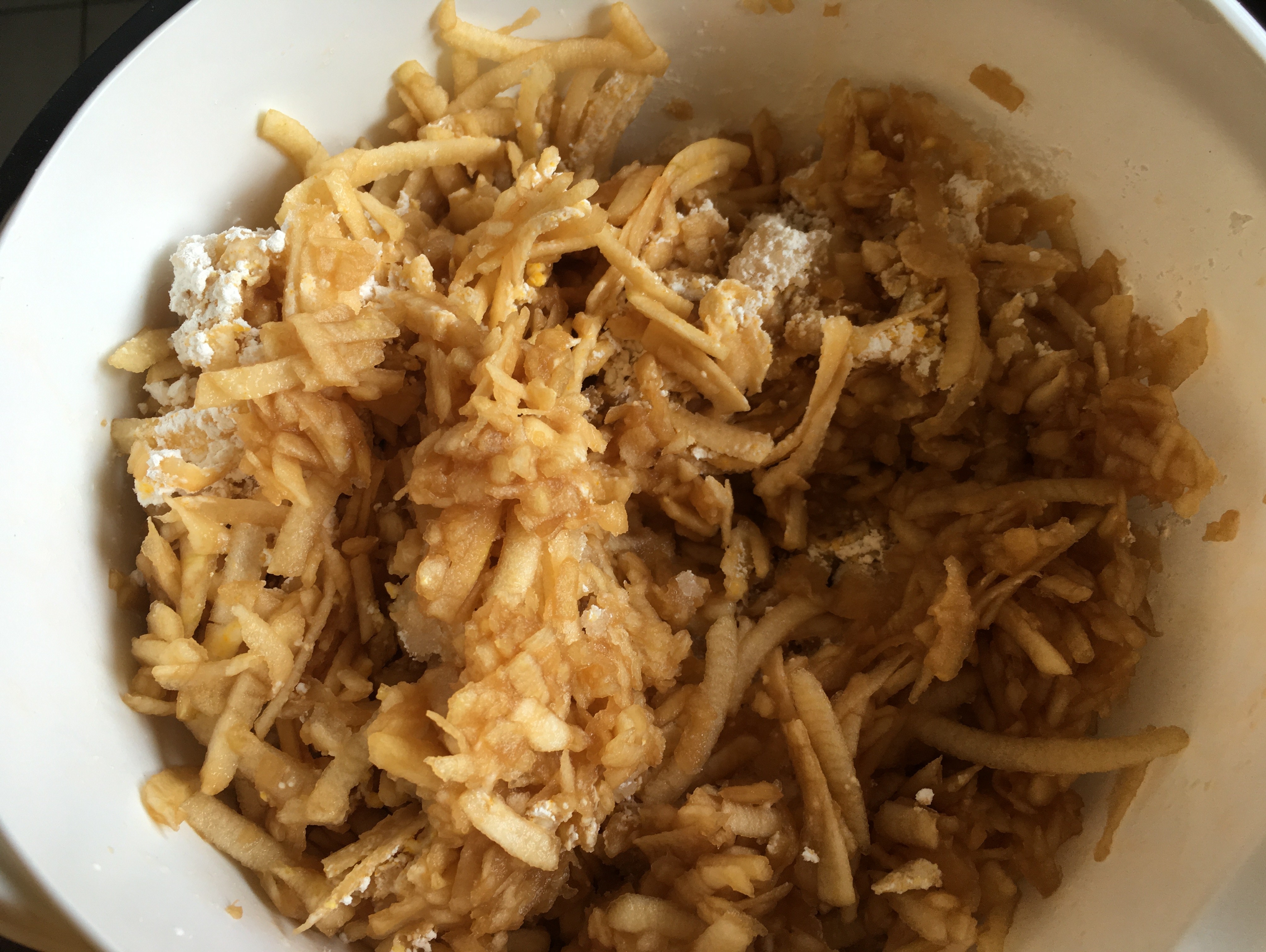 Apfelraspel zugeben, Gitter legen, Zimtzucker bestreuen Backschutz