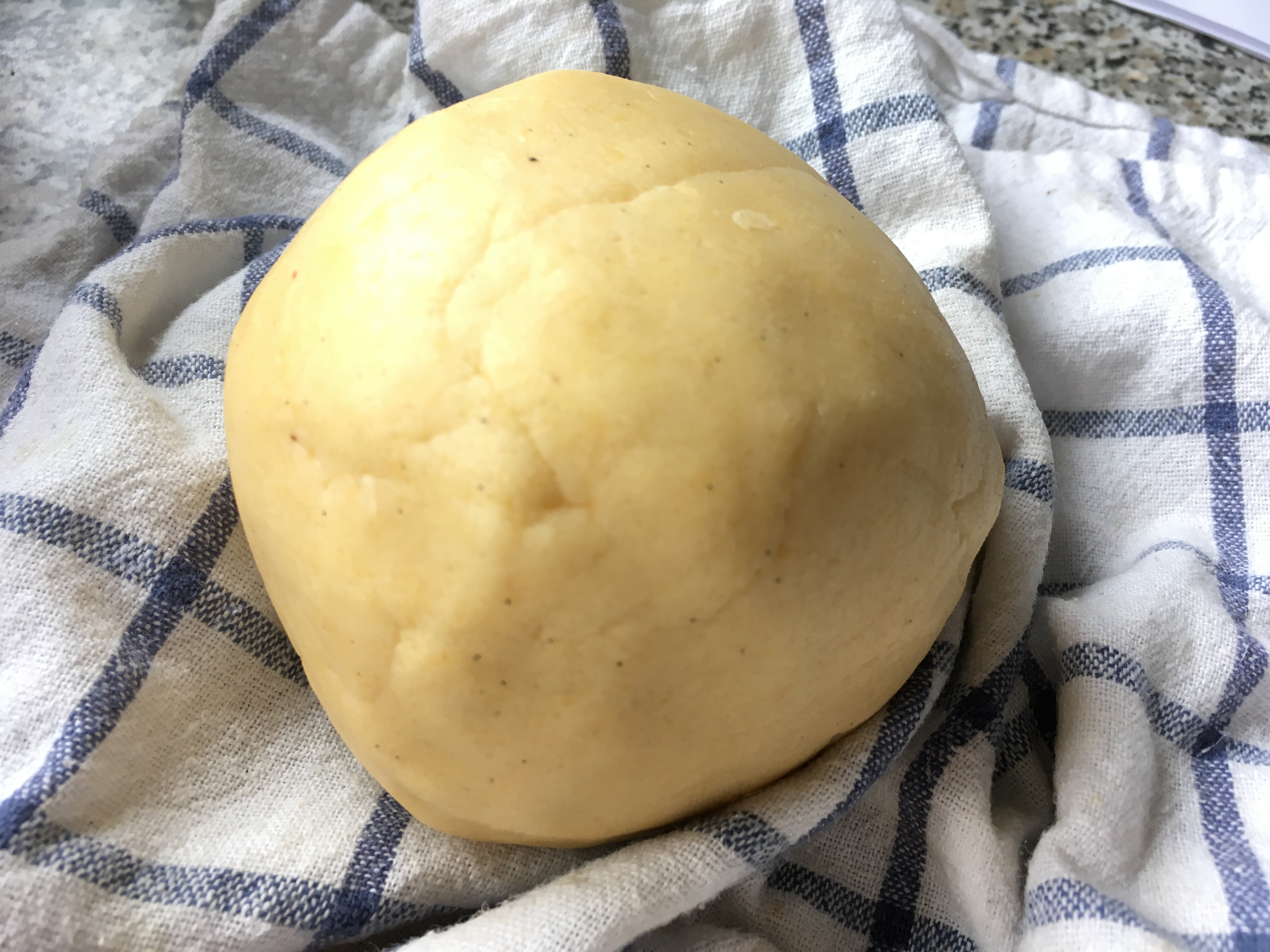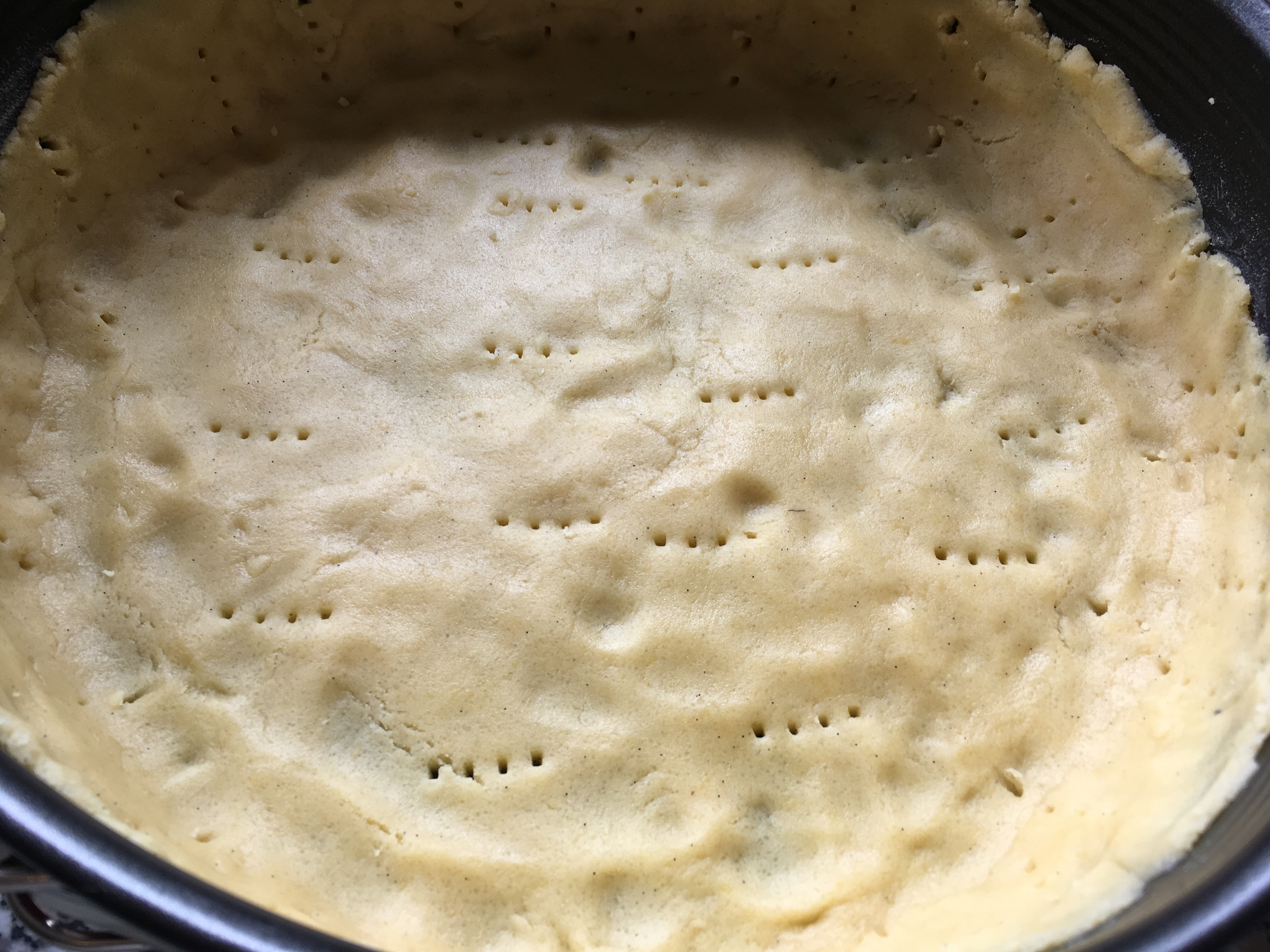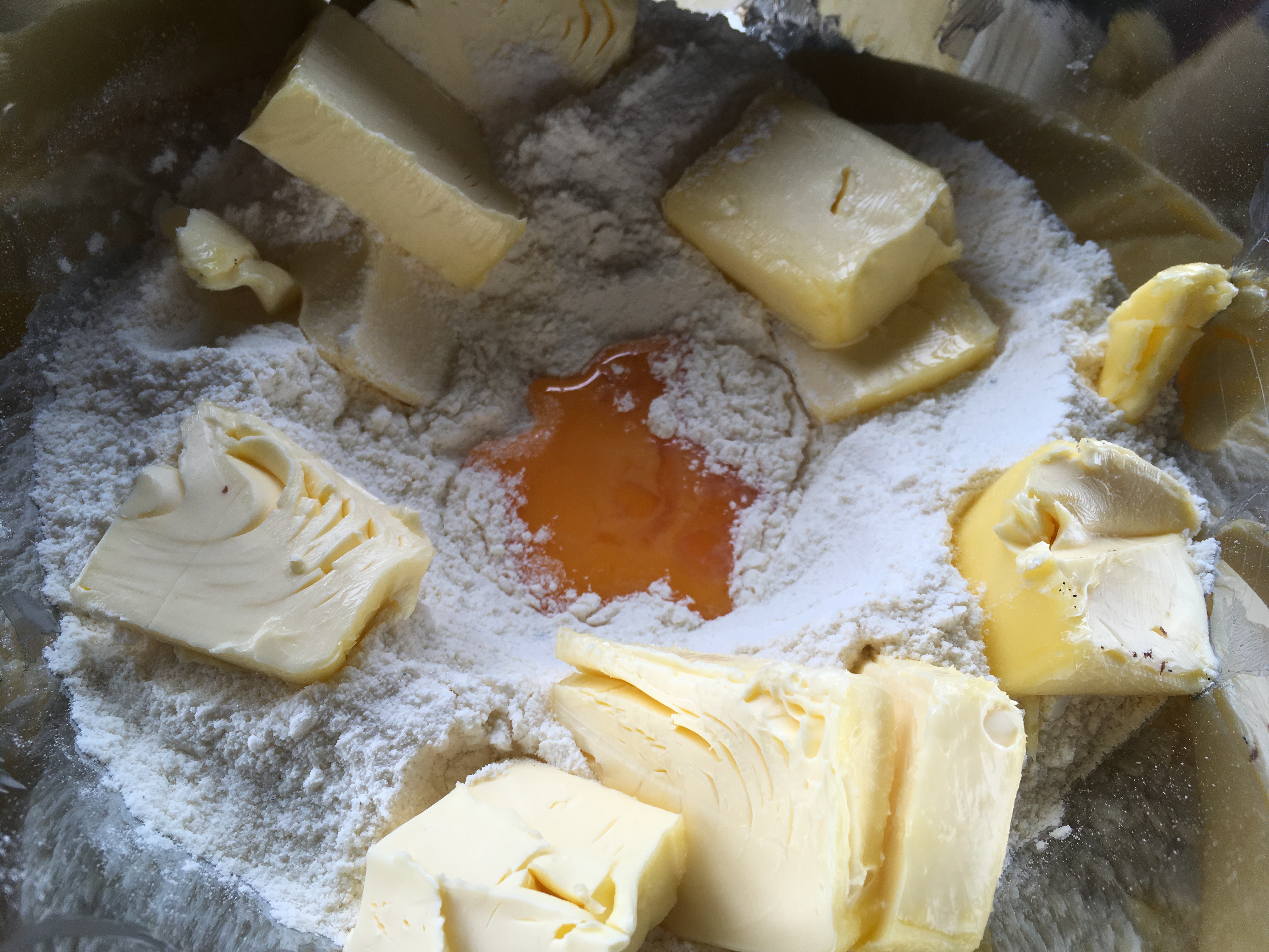- In einer Schüssel das Mehl, den Zucker, das Mark der Vanilleschote und das Salz vermischen. Eine Mulde in die Mitte drücken und die Eigelbe und das Bittermandel-Aroma hineingeben, die Butter in kleine Stückchen auf dem Rand verteilen und alles rasch zu einem Mürbeteig verkneten. Den Teig zu einer Kugel formen, in Frischhaltefolie wickeln und für 1 Stunde im Kühlschrank ruhen lassen. Im Originalrezept wurde das Bittermandel-Aroma bzw. der Amaretto nicht mehr erwähnt, sodass ich diesen nur noch leicht über den fertigen Teig gestrichen hatte. Also, nicht vergessen 🙂