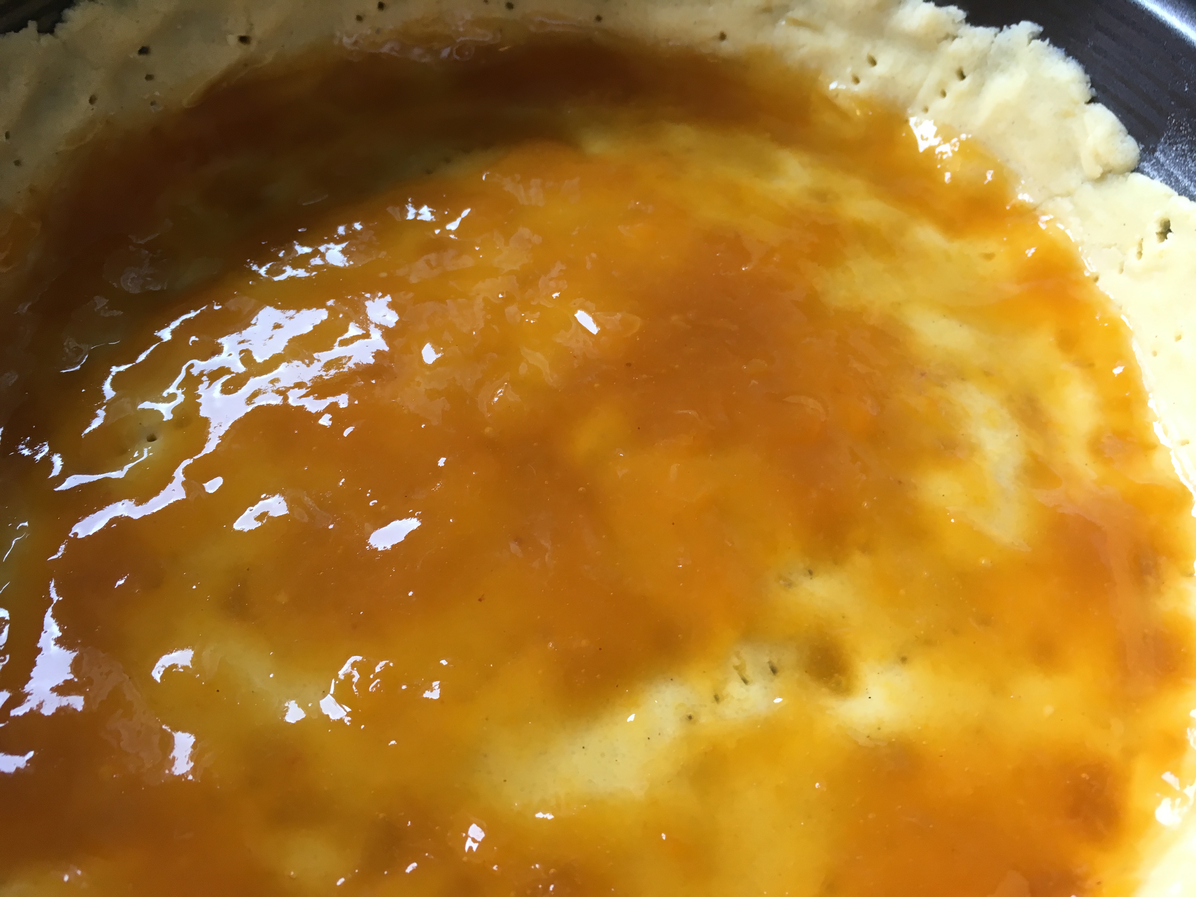 - Den Teig teilen: 2/3 ausrollen und die Springform damit auslegen. Die Ränder an den Seiten ca. 5cm hochziehen, den Boden mit einer Gabel mehrmals einstechen und mit 2 EL Aprikosenmarmelade bestreichen. Die Aprikosen gleichmäßig darauf verteilen.