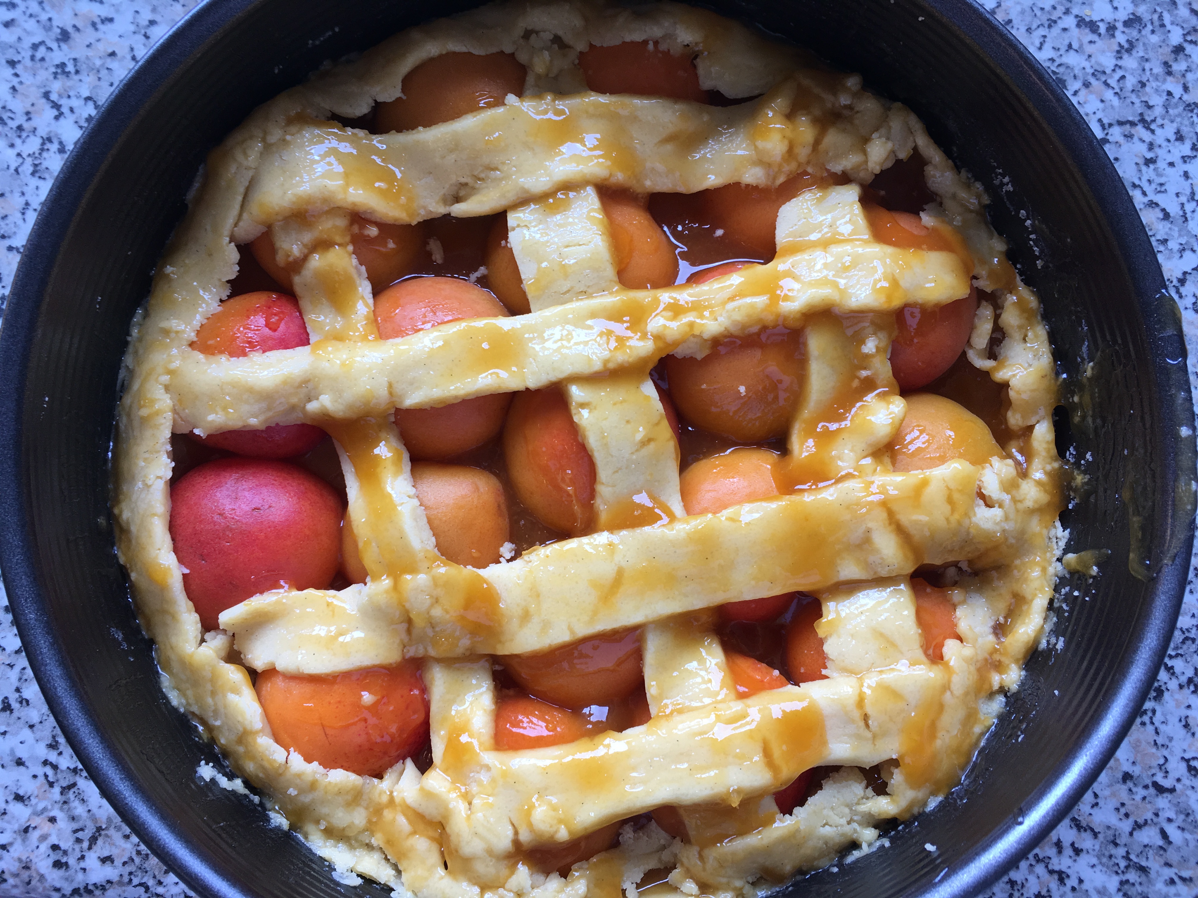 - Den restlichen Teig ausrollen, in ca. 1cm breite Streifen schneiden und diese wie ein Gitter immer über Kreuz auf dem Kuchen auslegen, alle Streifen mit 1 EL Aprikosenmarmelade bestreichen.