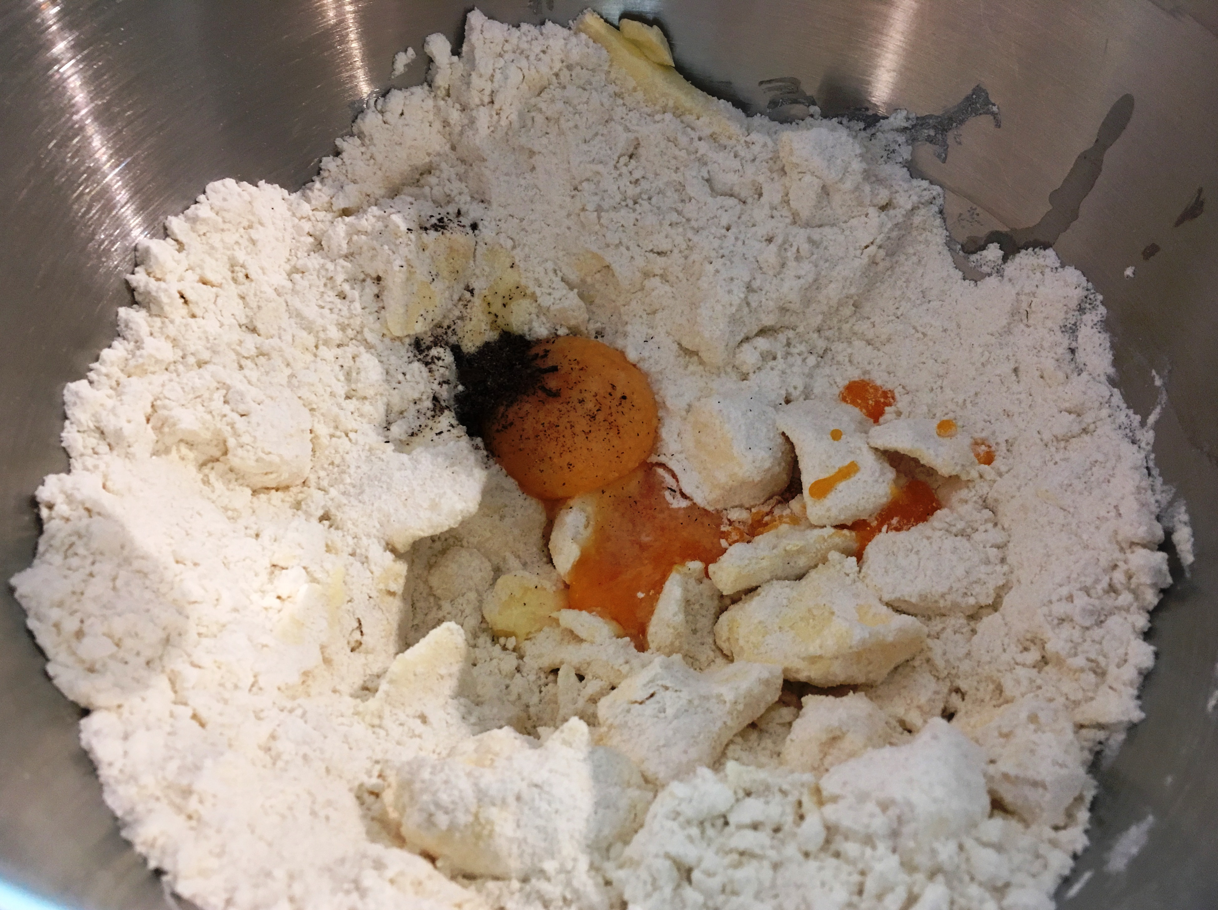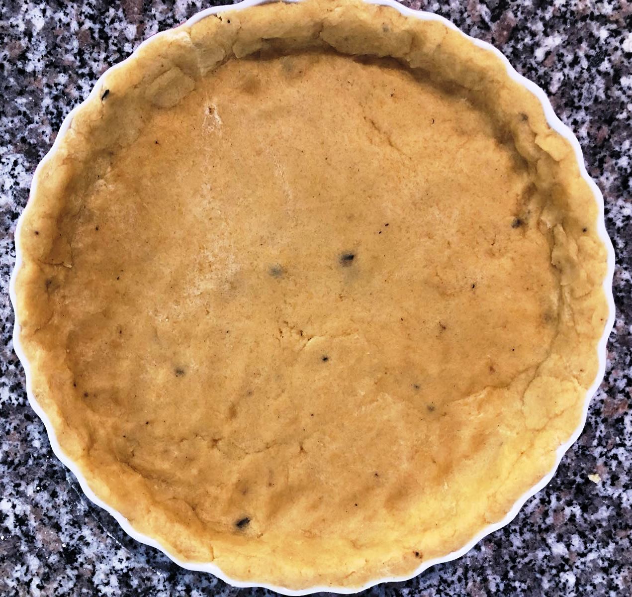 Butter, Zucker Mehl, Salz, Eigelb, Vanille vermengen - Den Teig ausrollen und eine gebutterte Tarteform damit auslegen. Achtung: Da der Teig weniger Mehl als ein klassischer Mürbeteig enthält, muss er besonders zügig verarbeitet werden, weil er sehr schnell weich und klebrig wird. Den Backofen auf 200°C vorheizen und den Boden 15-20 Minuten mit Hülsenfrüchten blindbacken, d.h. ein Backpapier auf den Teig legen, Hülsenfrüchte darauf und damit backen. Anschließend den Boden aus dem Backofen herausnehmen.