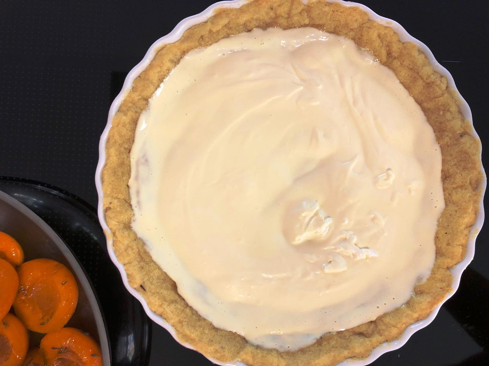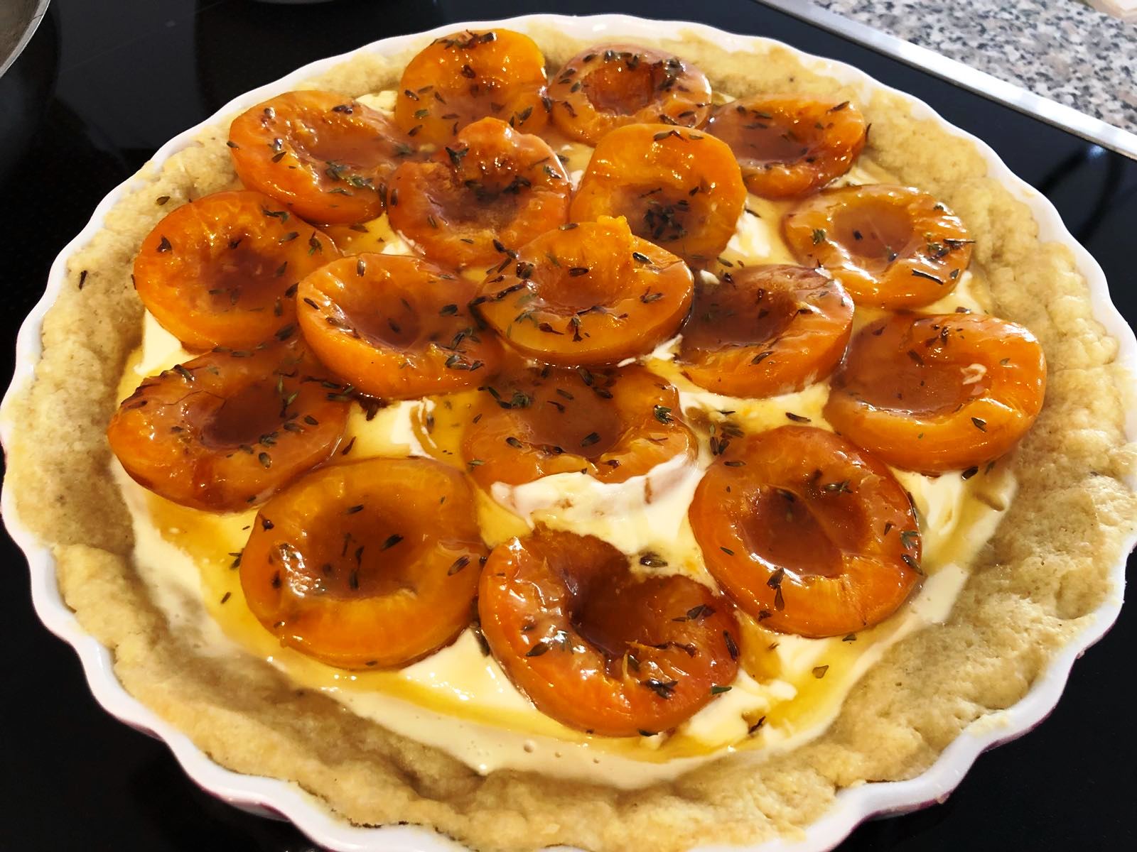 Honig, Butter und Lavendel Aprikosenhälften garen - Crème fraîche mit dem Eigelb vermengen und die Eimasse auf dem vorgebackenen Teig verstreichen.