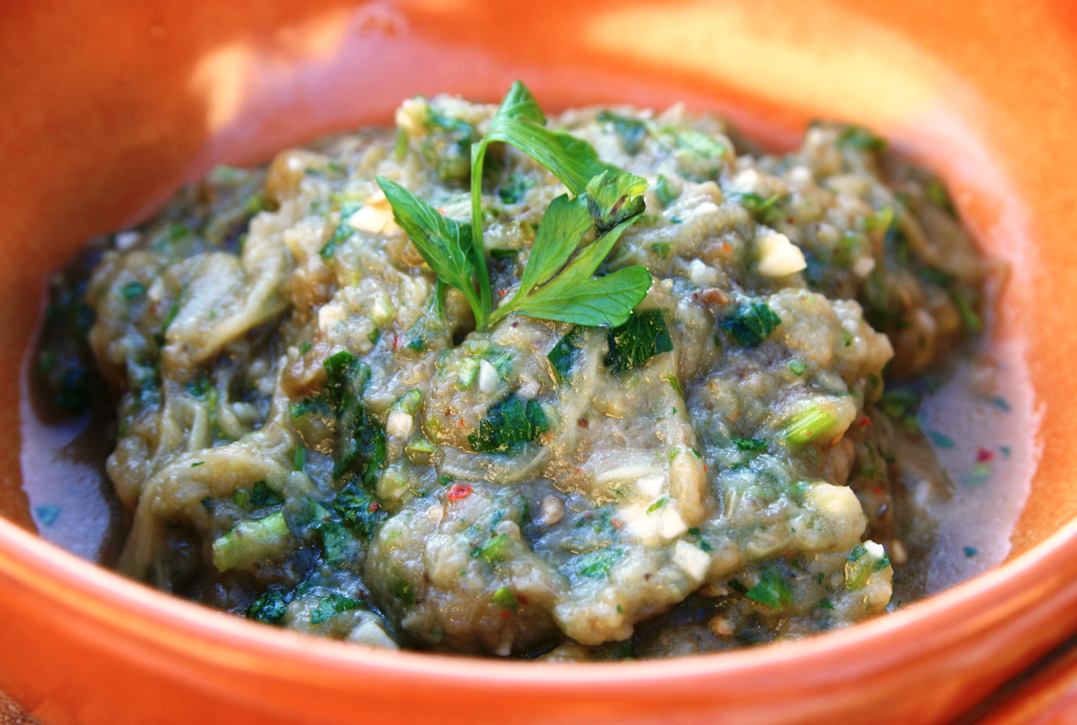 aufschneiden Fleisch auskratzen - Die Knoblauchzehen und die Petersilie mit einem großen Messer klein hacken und mit dem Olivenöl zu dem Auberginenmus geben und mit einer Gabel vermischen.