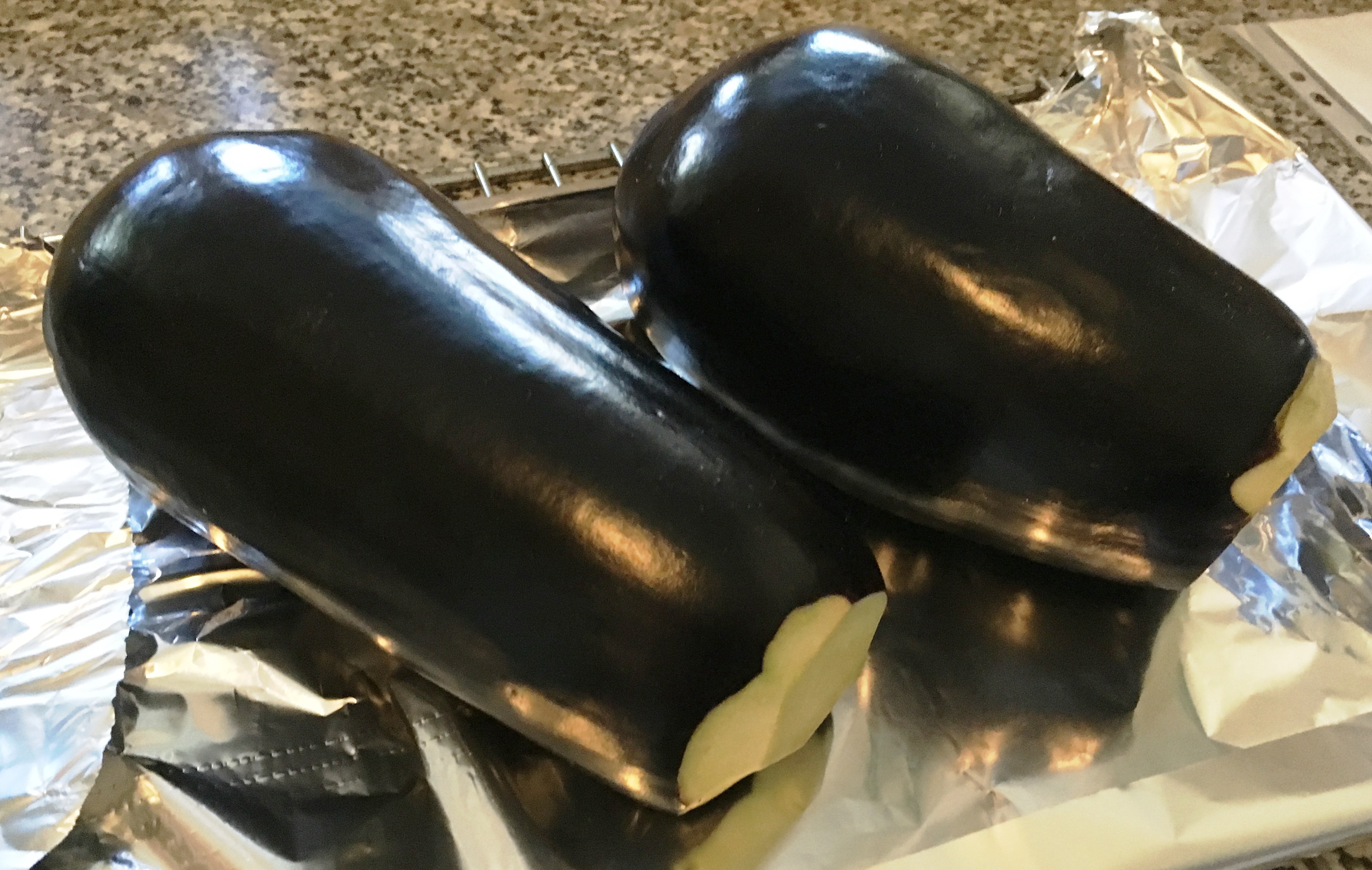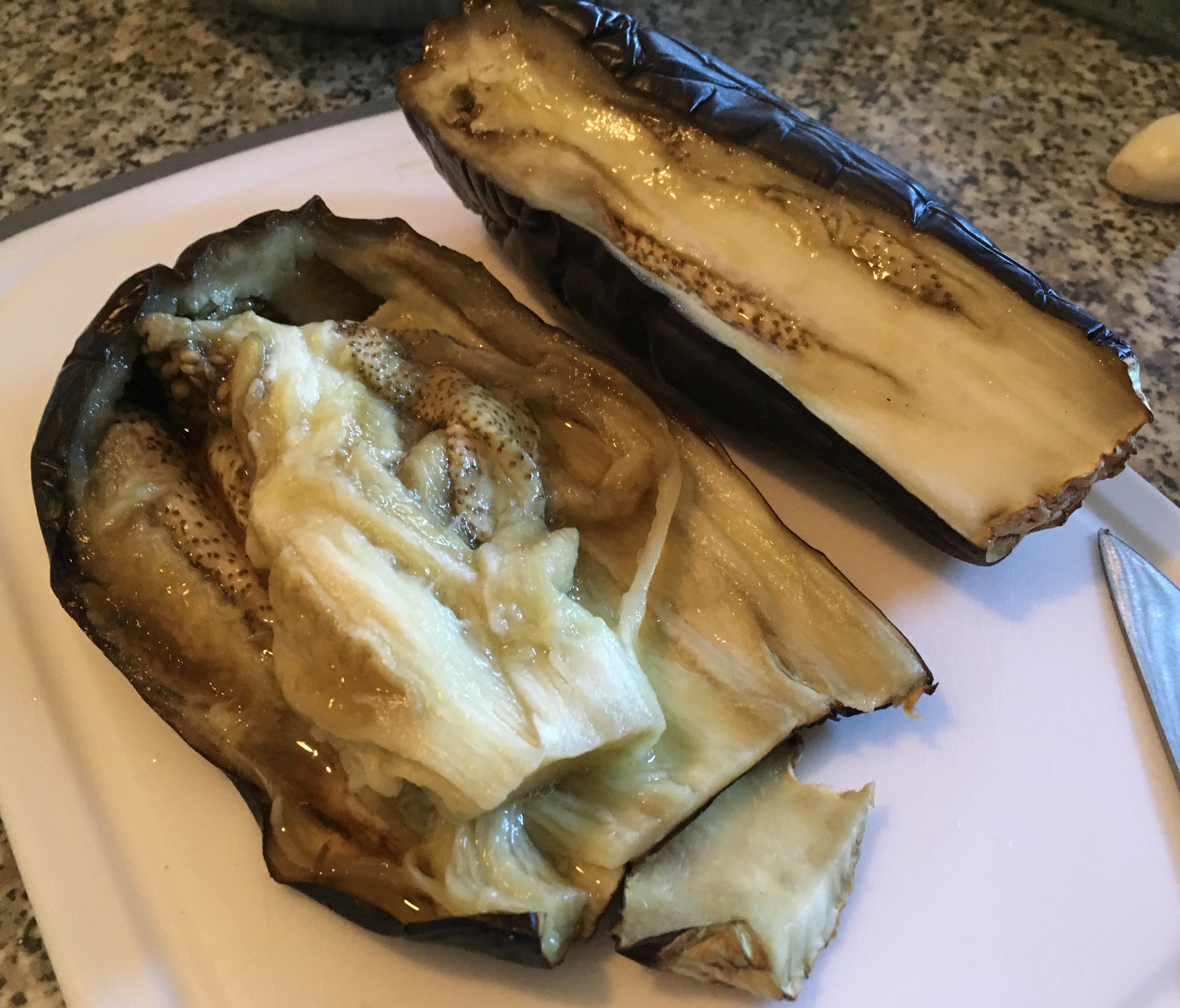 Aubergine backen - Im Ofen circa 40 bis 50 Minuten, je nach Größe der Auberginen rösten, bis sie absolut weich sind. Dabei immer wieder drehen, damit die Hitze gleichmäßig ins Innere gelangt.