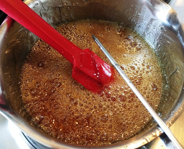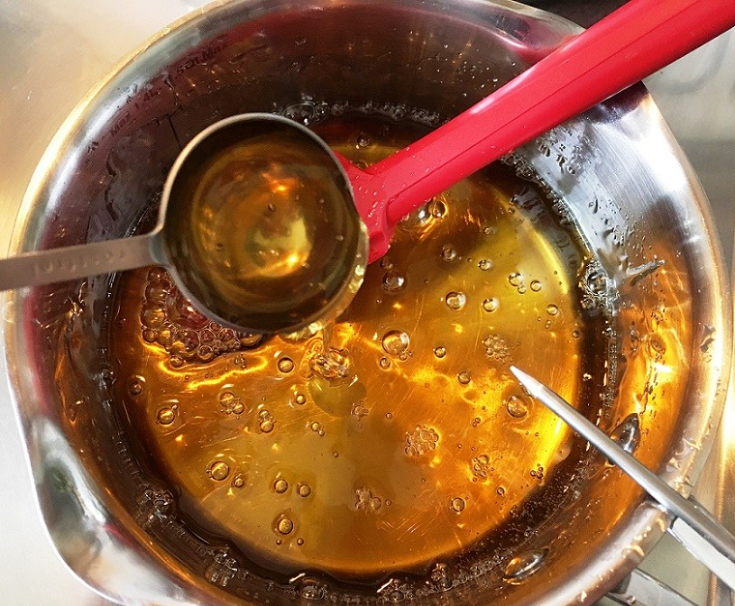 Zucker, Traubenzucker und Wasser vermengen auf 165° erwärmen Grundsubstanz - Topf vom Herd nehmen und den Honig zugeben. Die Zuckermasse wird dadurch kräftig aufschäumen. Etwas abkühlen und den Schaum zurückgehen lassen, dann vorsichtig und unter ständigem Rühren nochmals auf etwa 160°C bringen. Die Masse brennt jetzt leicht an, also aufpassen!