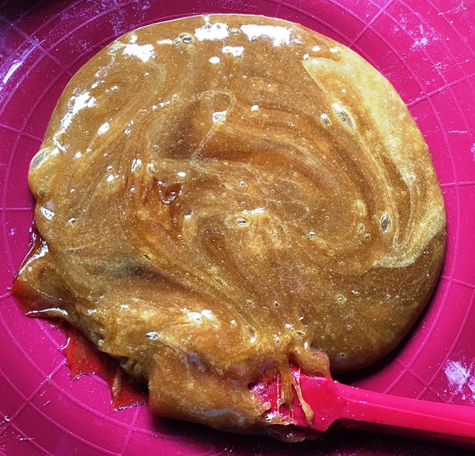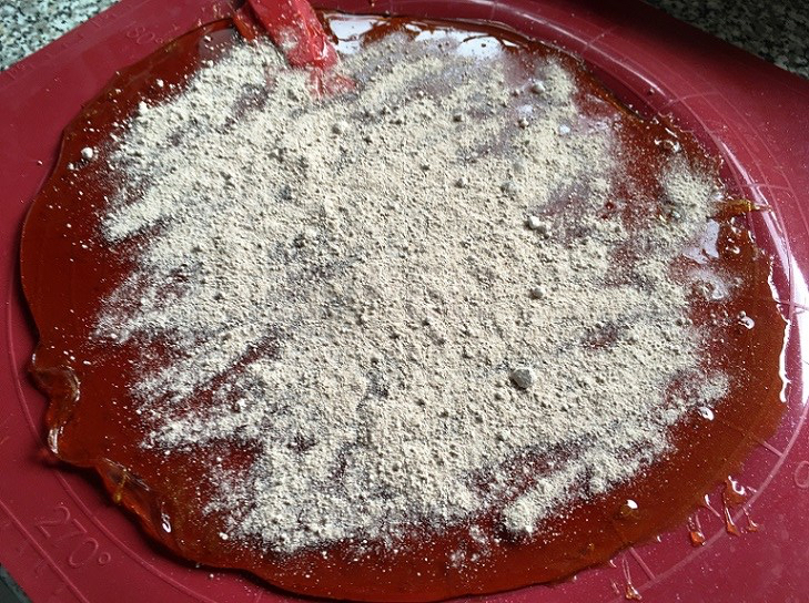 Honig zufügen einrühren, neu erwärmen - Die Menge auf die mit Öl eingepinselte Silikonmasse geben und mindestens zehn (nicht so lange warten, wir “Normalos” haben keine Wärmeplatte, daher kühlt die Masse deutlich schneller ab und härtet ebenso schnell schon aus) Minuten abkühlen lassen, ehe man das Salmiakpulver zugibt, da es sonst verbrennt! Die Masse so lange ziehen und strecken, bis sie die Farbe von Perlmutt hat. Anschließend die Bonbons formen. Nicht zu lange ziehen, sonst härtet die Masse durch die kühle Luft aus.