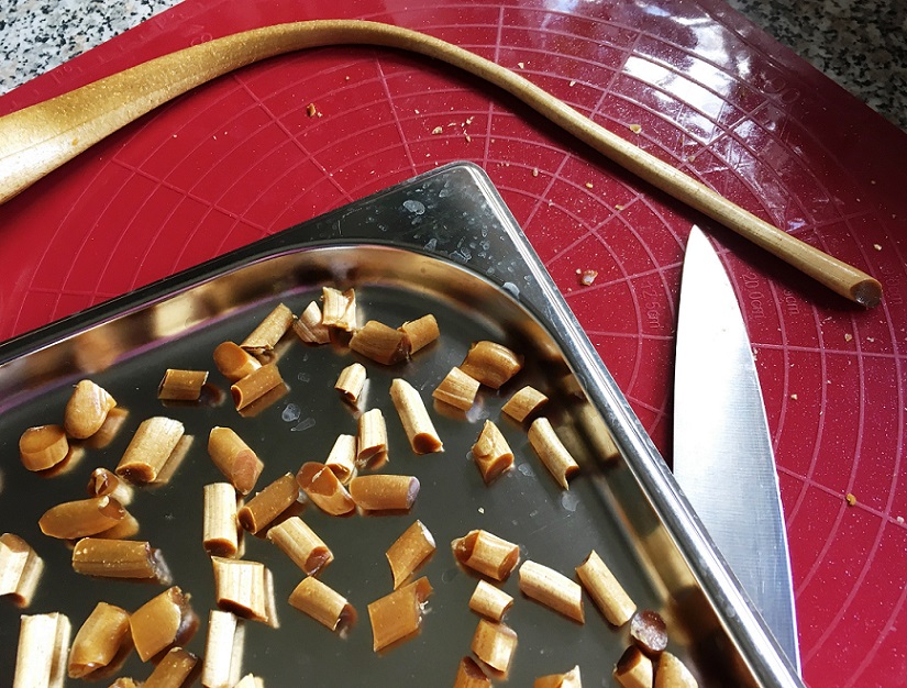 ausgießen Salmiakpulver zugeben untermengen, ziehen Bonbons schneiden