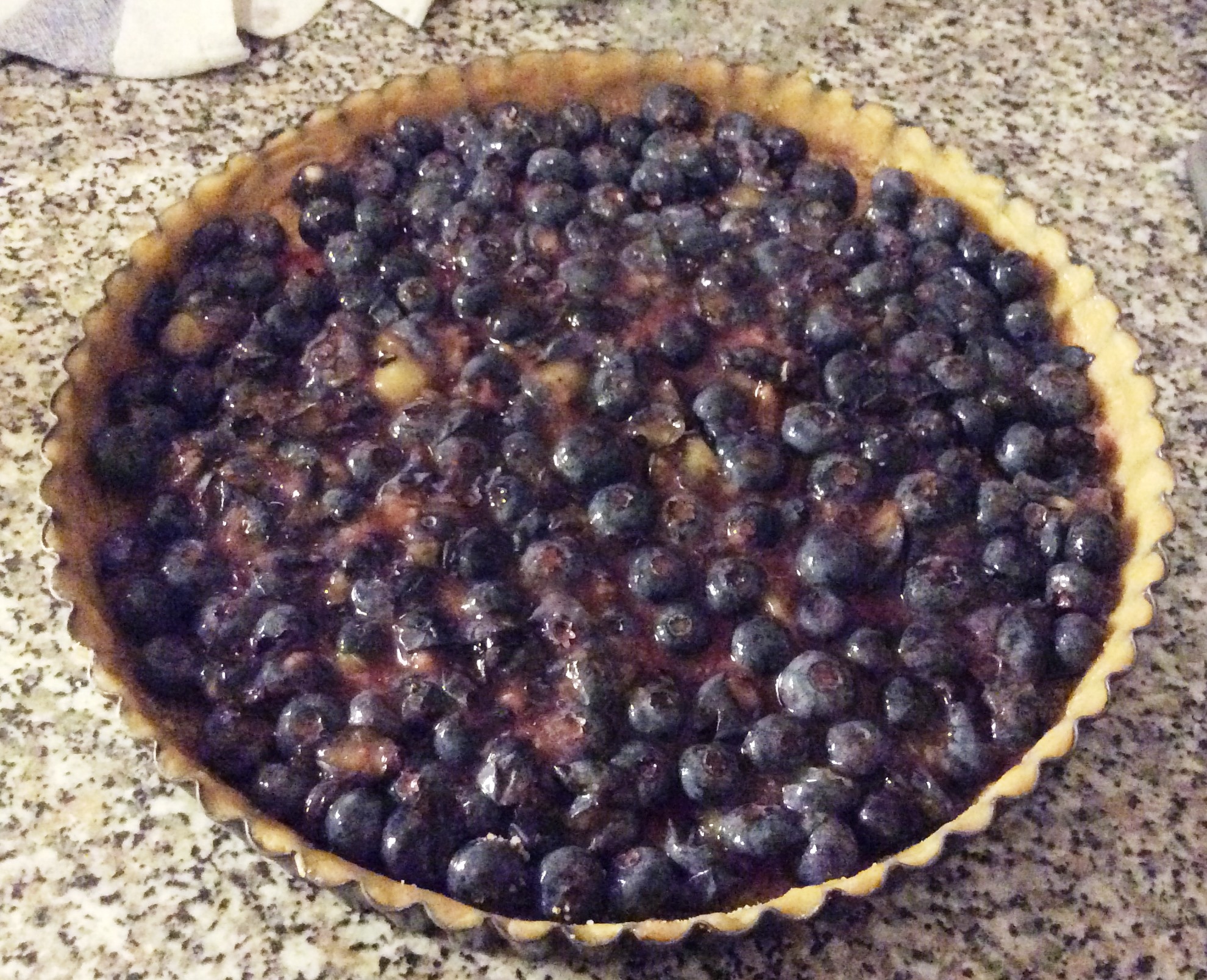 Mehl und Backpulver sieben und zugeben halber Teig - Mein Tipp, erst als Schritt Nr. 2: Die Pieform mit wenig Butter einfetten. Die Arbeitsfläche bemehlen und den Teig etwa 1 Minute leicht kneten. Den Teig halbieren (ruhig etwas mehr für den Teigboden), die eine Hälfte zwischen zwei Bögen Backpapier ausrollen. Die andere Hälfte in Backpapier einschlagen und bis zur Verwendung in den Kühlschrank legen. Den Teig etwa 3 mm dick ausrollen. Das Papier abziehen und den Teigboden mit einer schnellen Bewegung in die Pieform bugsieren, an den Rändern überhängen lassen. Den Teig leicht in die Form drücken. Mit den gemahlenen Mandeln bestreuen, sie nehmen dann beim Backen etwas vom austretenden Blaubeersaft auf. Den Teig mindestens 1 Stunde oder auch über Nacht im Kühlschrank ruhen lassen.