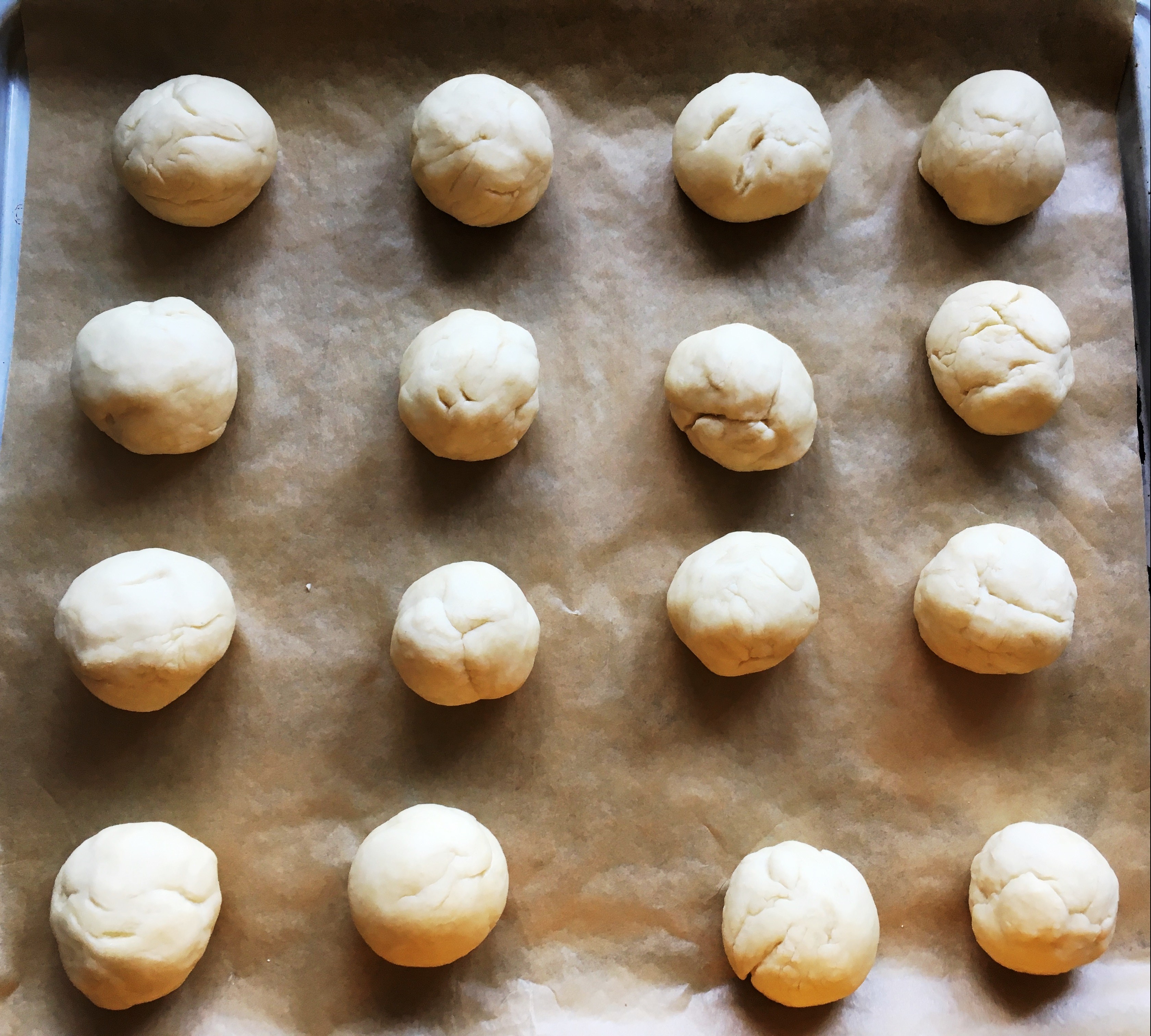 Teig gehen lassen gegangen - Danach den Teig in 16 Portionen teilen (á 46/47g) und diese zu Kugeln rollen. Die Kugeln auf ein Backblech legen (da sie noch etwas wachsen, sollte man dazwischen genügen Platz lassen). Dann noch einmal eine Dreiviertelstunde gehen lassen.
