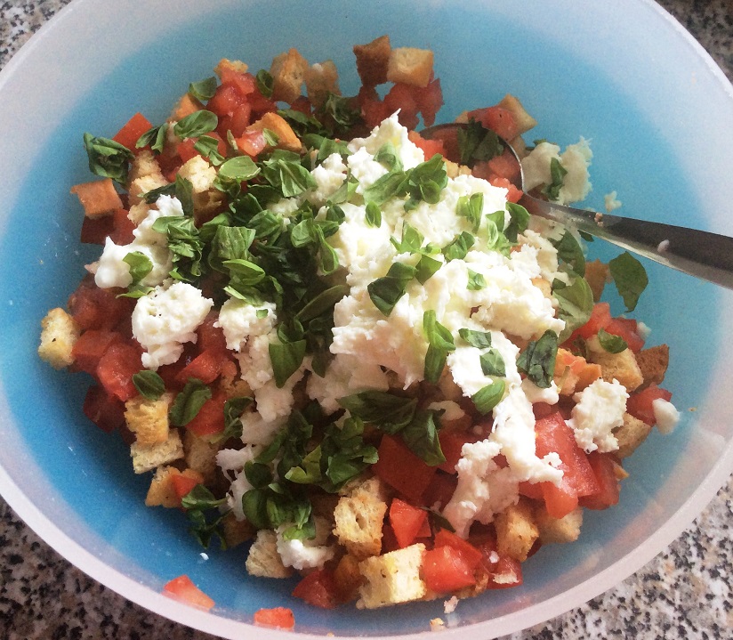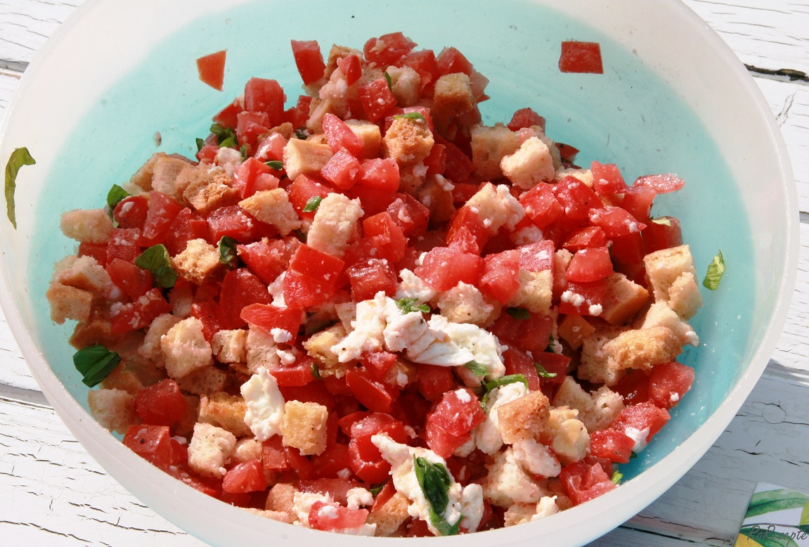 Der Brotsalat ist eigentlich eine italienische Panzanella welche typisch aus gehacktem Brot vom Vortag und Tomaten besteht. Angereichert wird der Salat bei Marco noch durch Büffelmozzarella und Basilikum, abgeschmeckt mit Olivenöl und Zitronensaft. Allerdings gilt für jede Zutat “alles kann, nichts muss”. Denn manchmal änderte Marco auch spontan sein Rezept ab:
