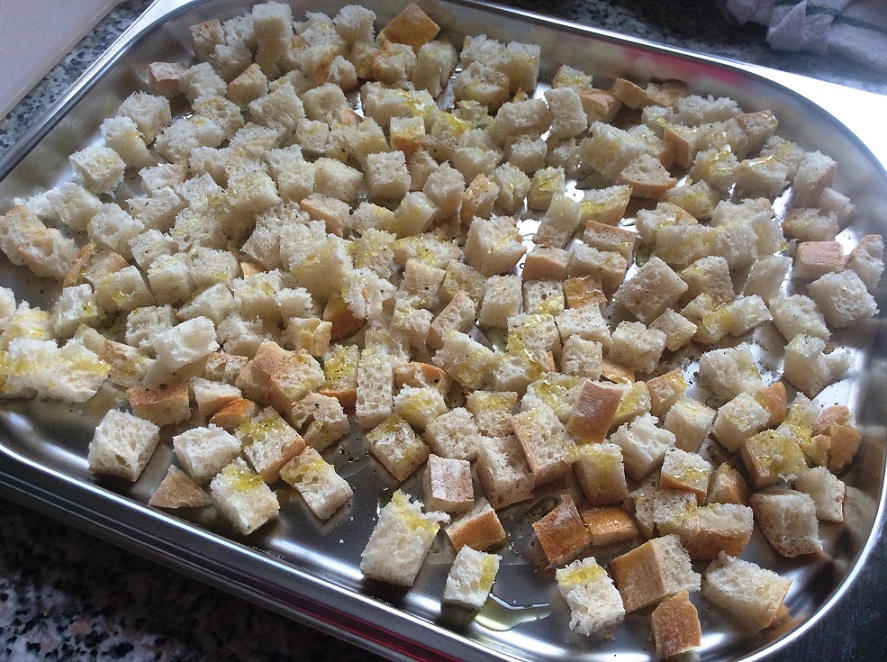 - Einige Scheiben Ciabatta vom Vortag (oder auch Baguette) schneidet Marco in kleine Würfel, vermischt diese mit Olivenöl, Meersalz und Pfeffer und röstet sie ein paar Minuten im Ofen unter dem Grill, bis sie knusprig sind. Wer keine Grillfunktion hat, nutzt Oberhitze bei 200° Grad 🙂