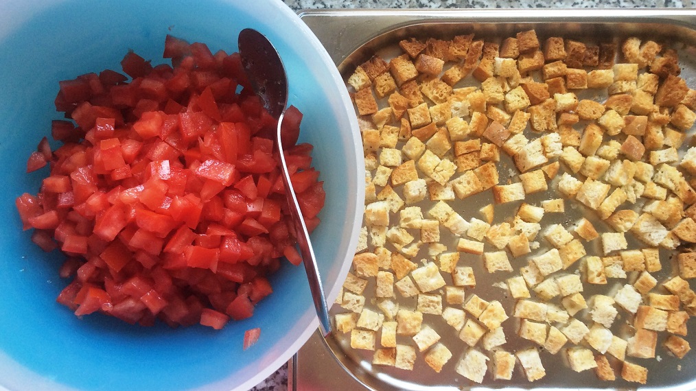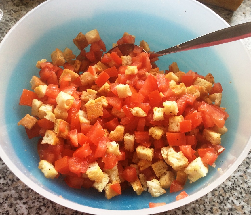 Ciabatta würfeln, in Öl, Salz und Pfeffer vermengt, rösten - Währenddessen schneidet er vier bis fünf aromatische Tomaten, am liebsten San Marzano oder Flaschentomaten, in kleine Stücke und gibt sie zu den Brotwürfeln. Da ich kerne im Salat nicht mag, habe ich diese vor dem Würfeln entfernt.