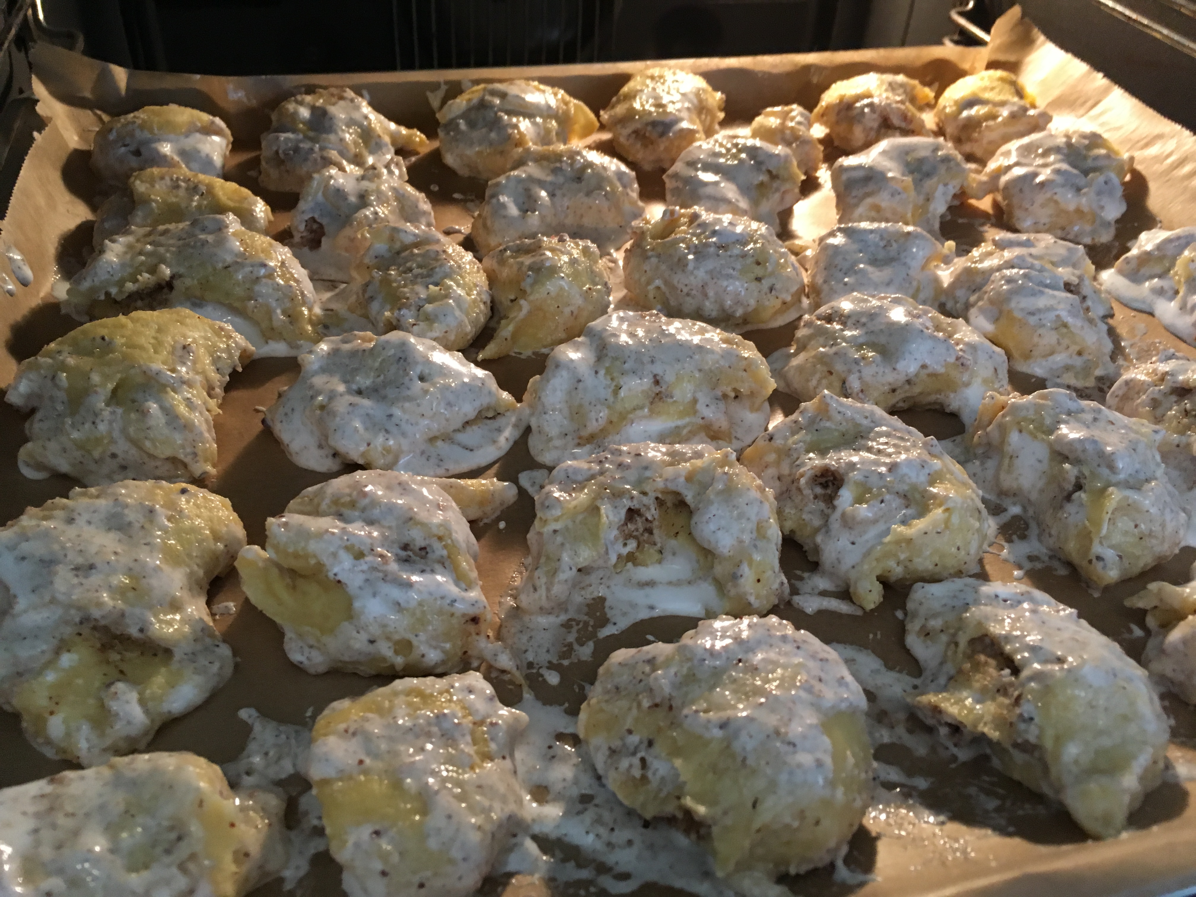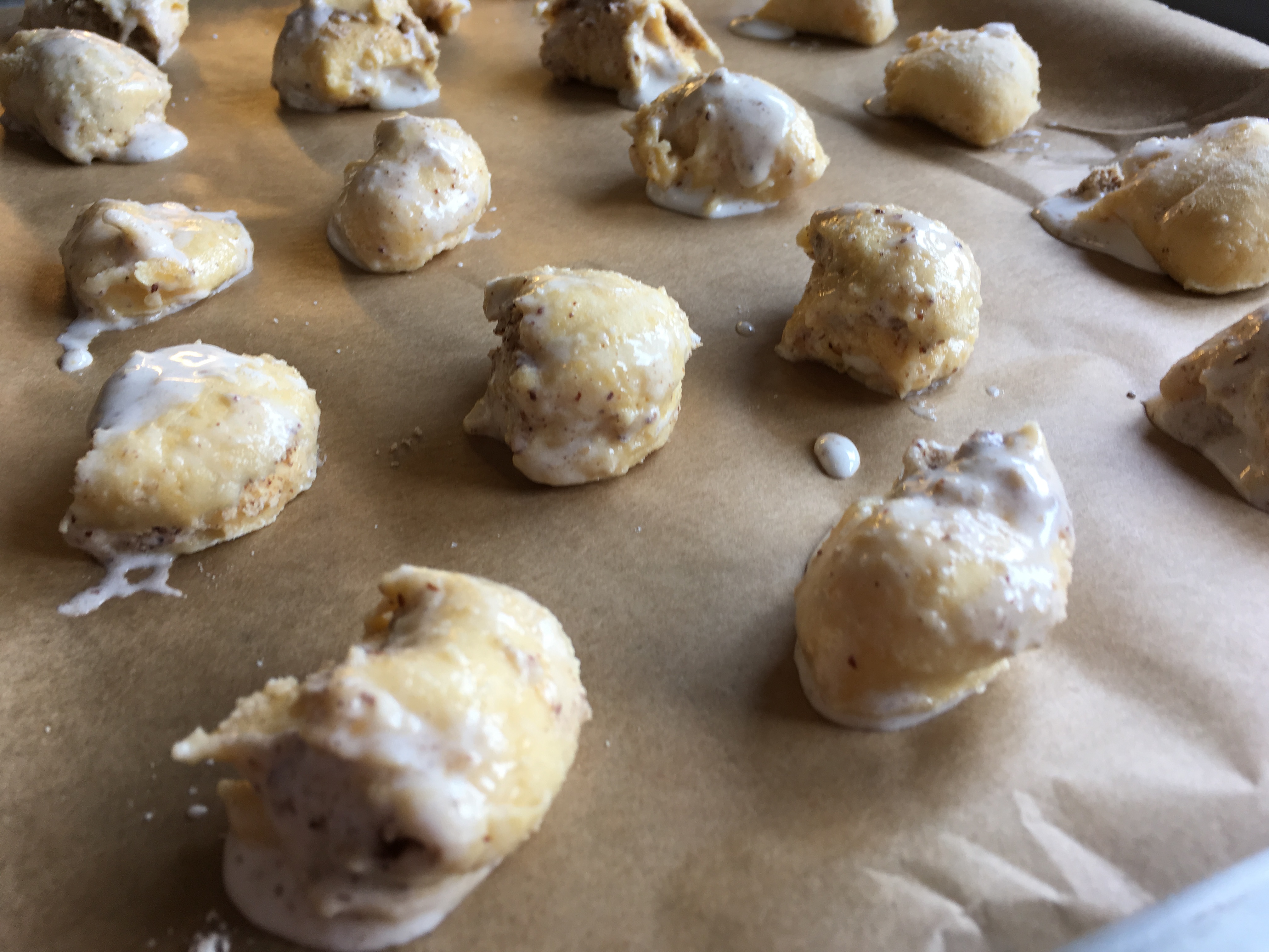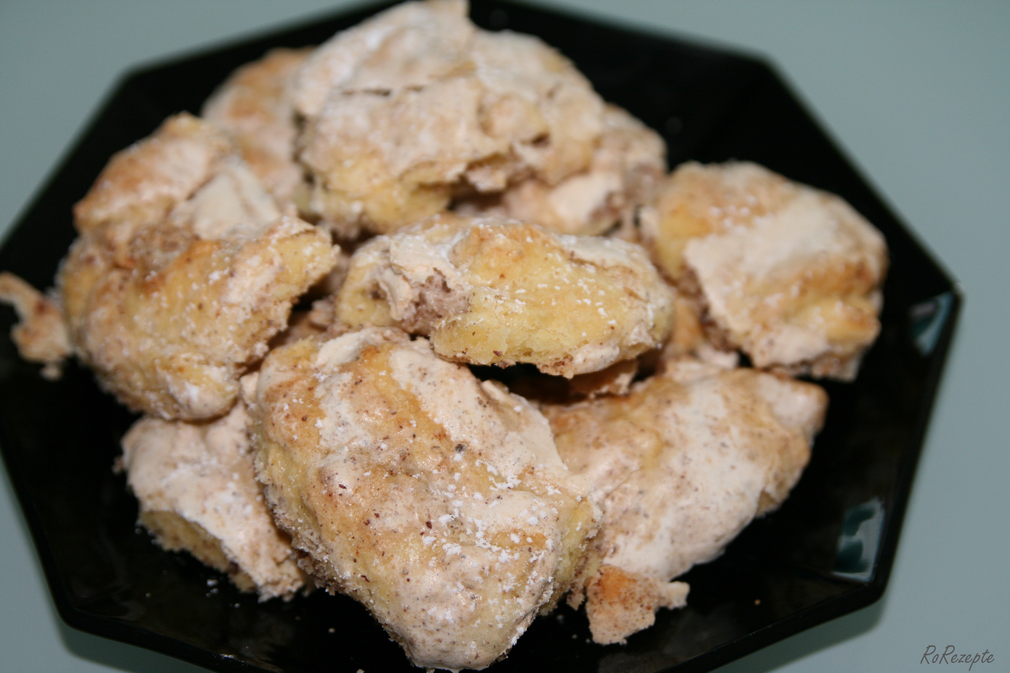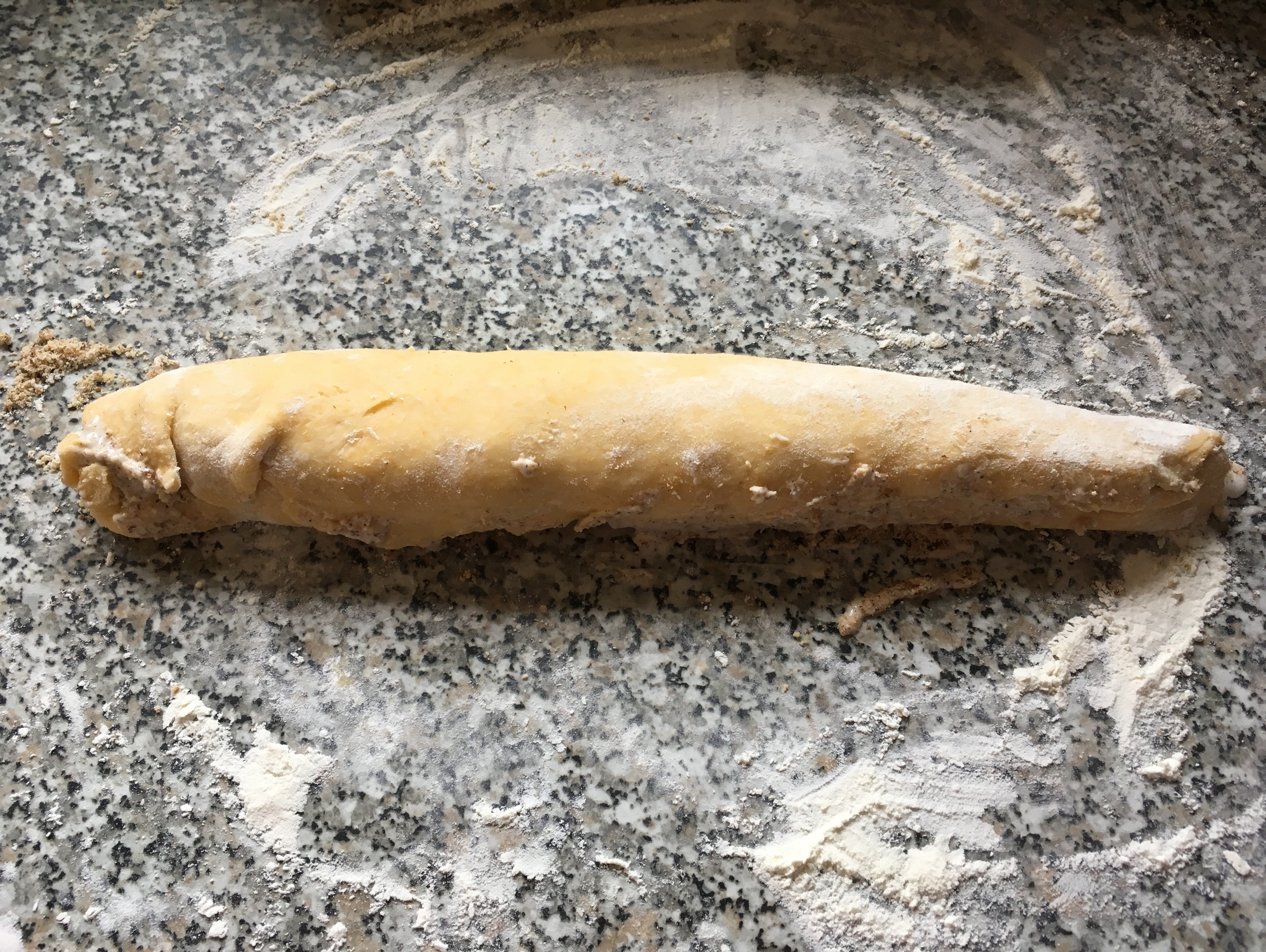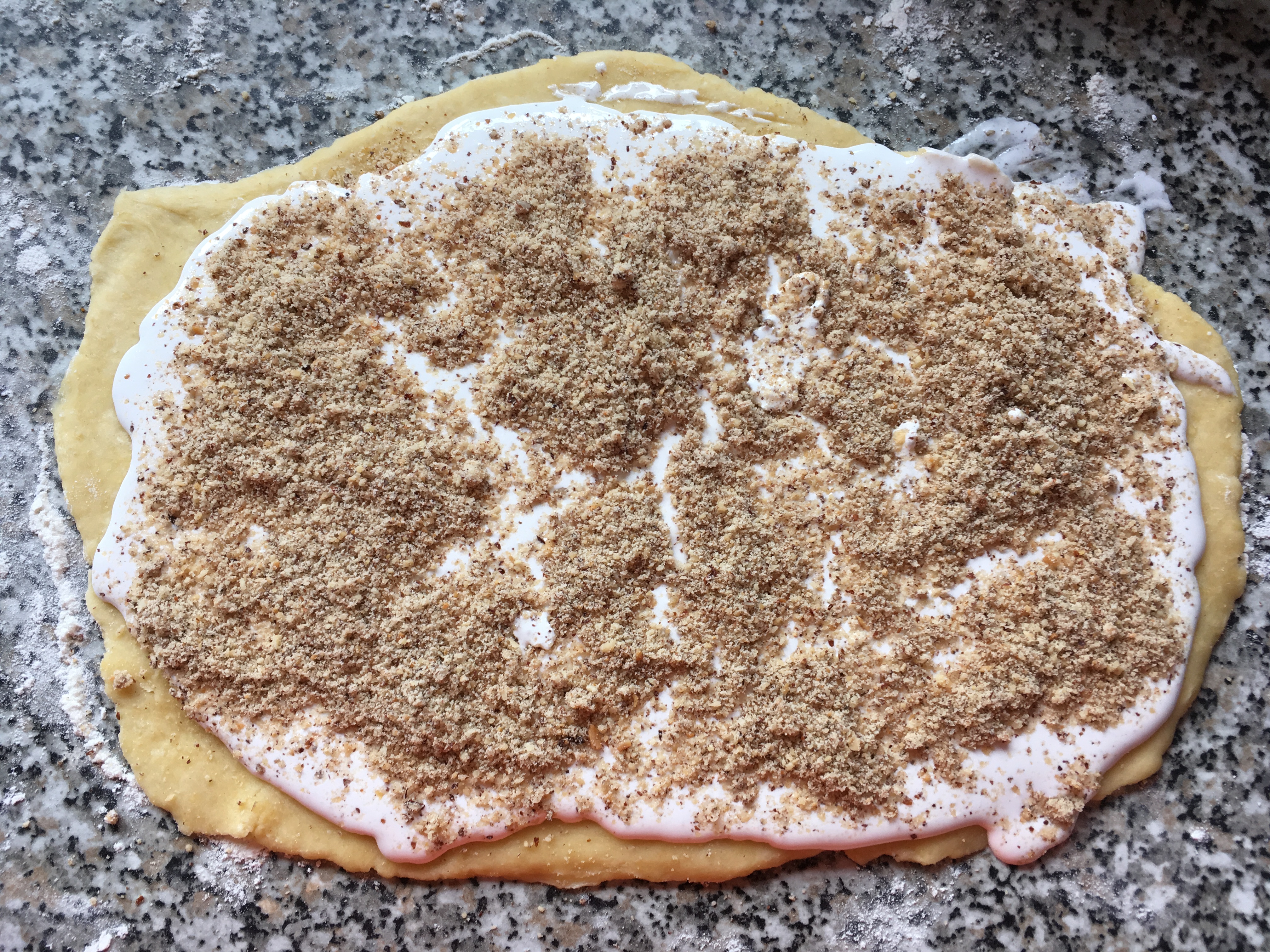 Eiklar und Staubzucker Zuckercreme - und auf die ausgerollten Teigstücke streichen. Die geriebenen Nüsse darüberstreuen und den Teig dünn einrollen wie einen Strudel. Hier schnell mit den gekühlten Elementen arbeiten.