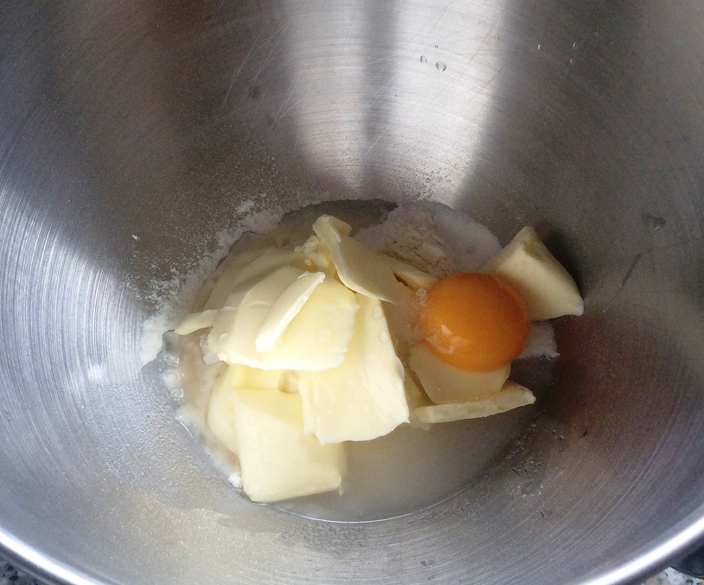 - Mehl, Zucker, Butter, 1 Eigelb und 1 EL Wasser (14ml) kneten, bis sich ein schöner Plätzchenteig formt.