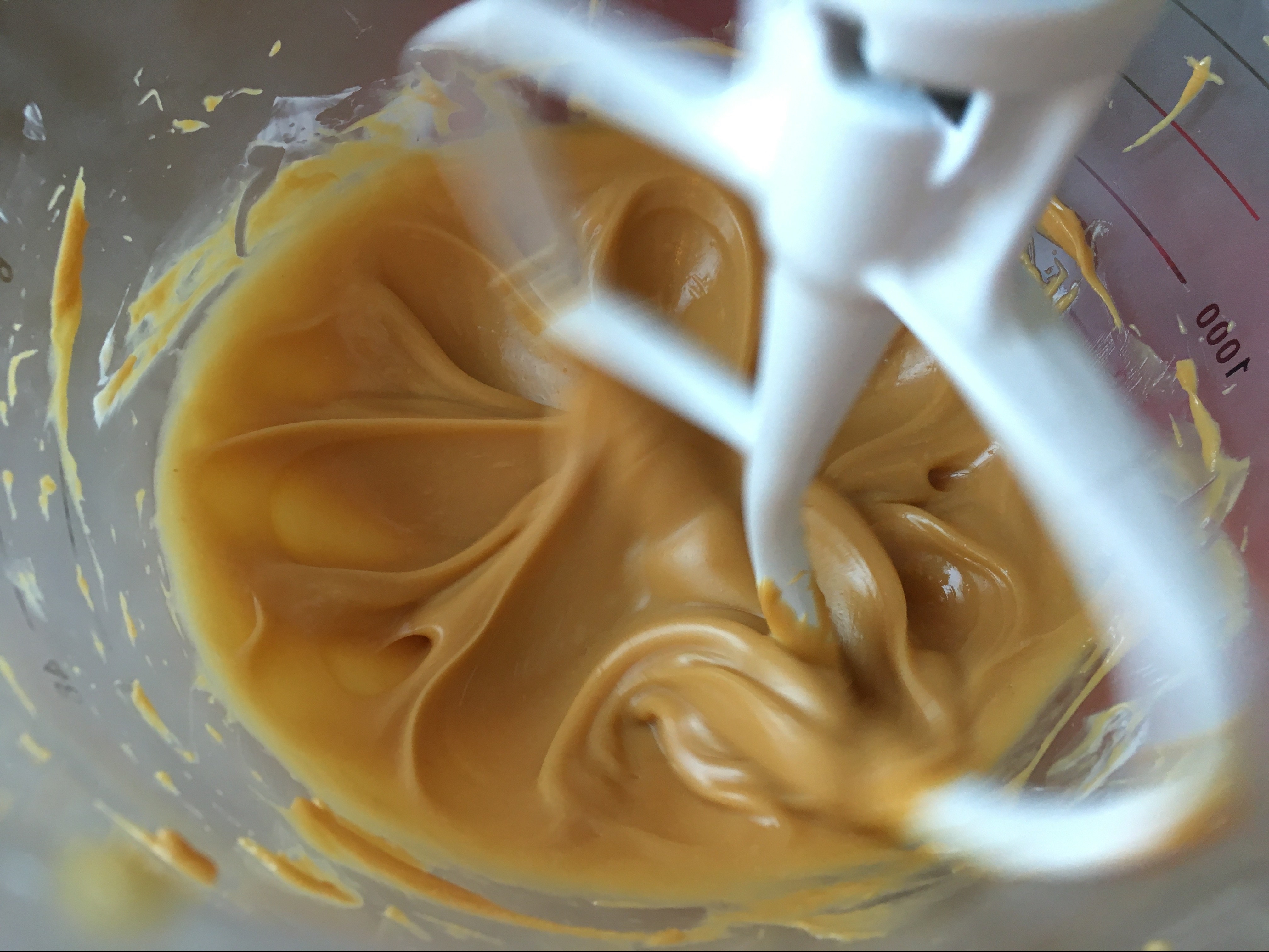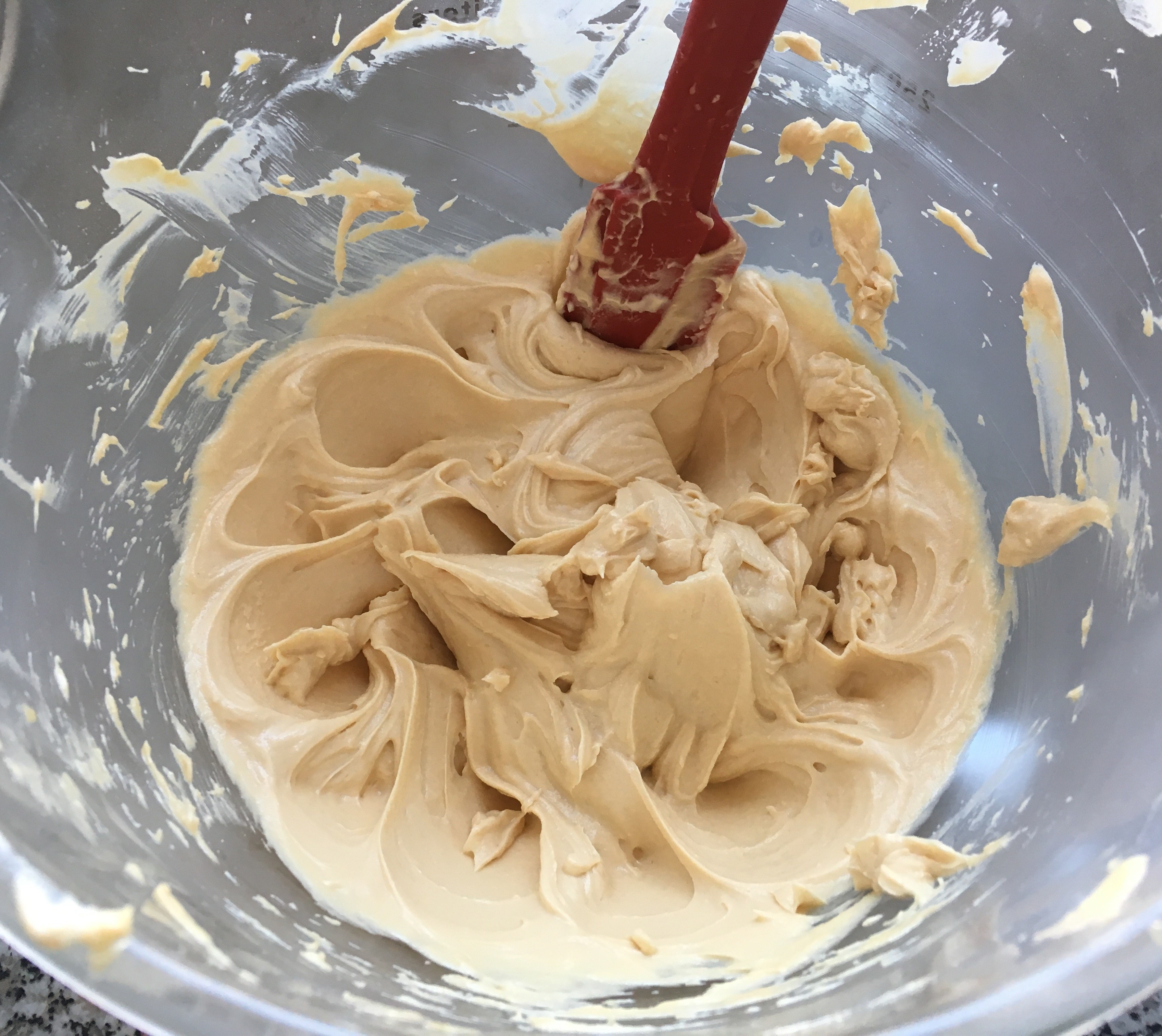 Butter und Erdnussbutter cremig schlagen - dann nach und nach auch den Puderzucker mit in den Mixer geben. Am Ende die Sahne hinzufügen, bis die Glasur die richtige Konsistenz hat.
