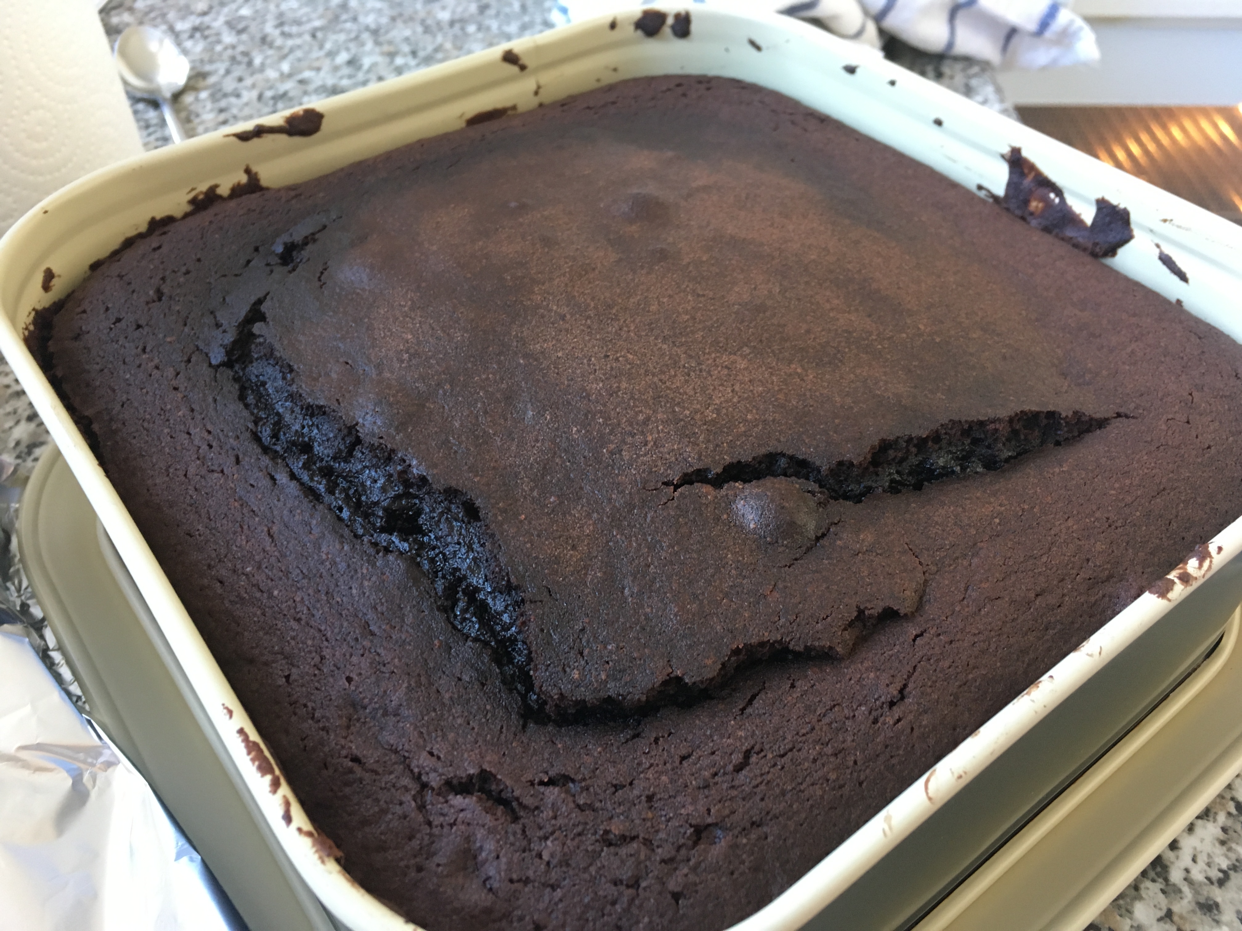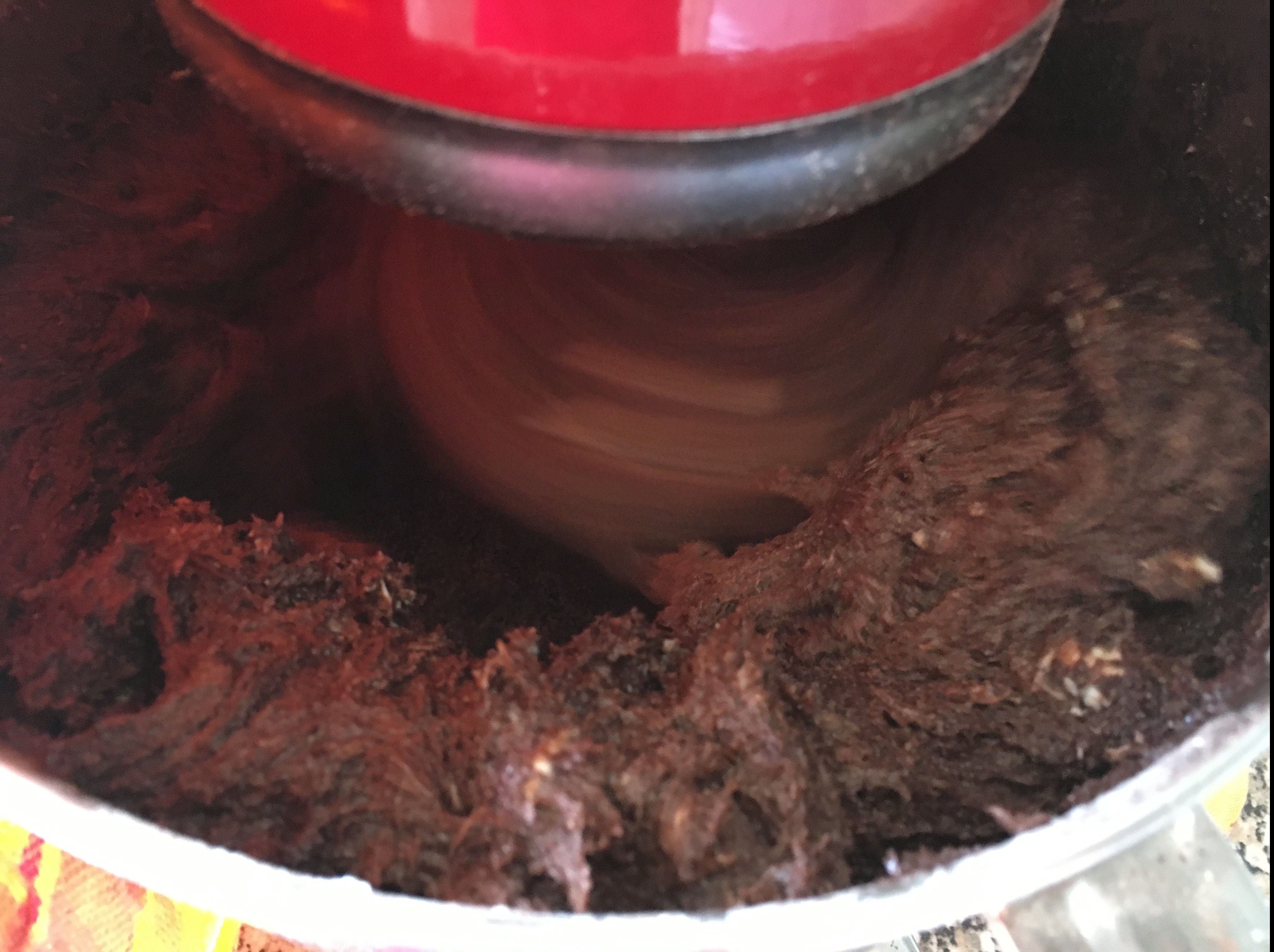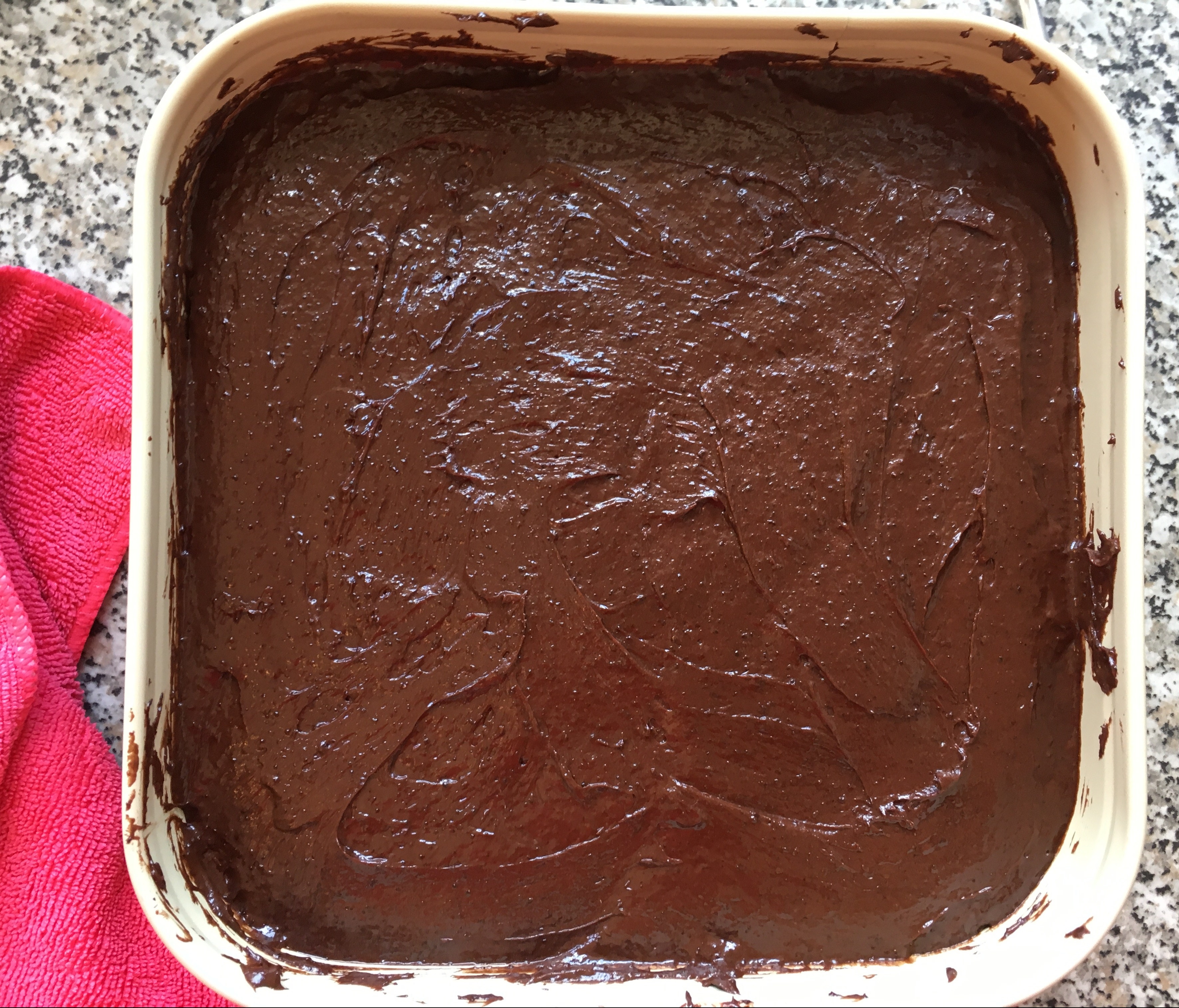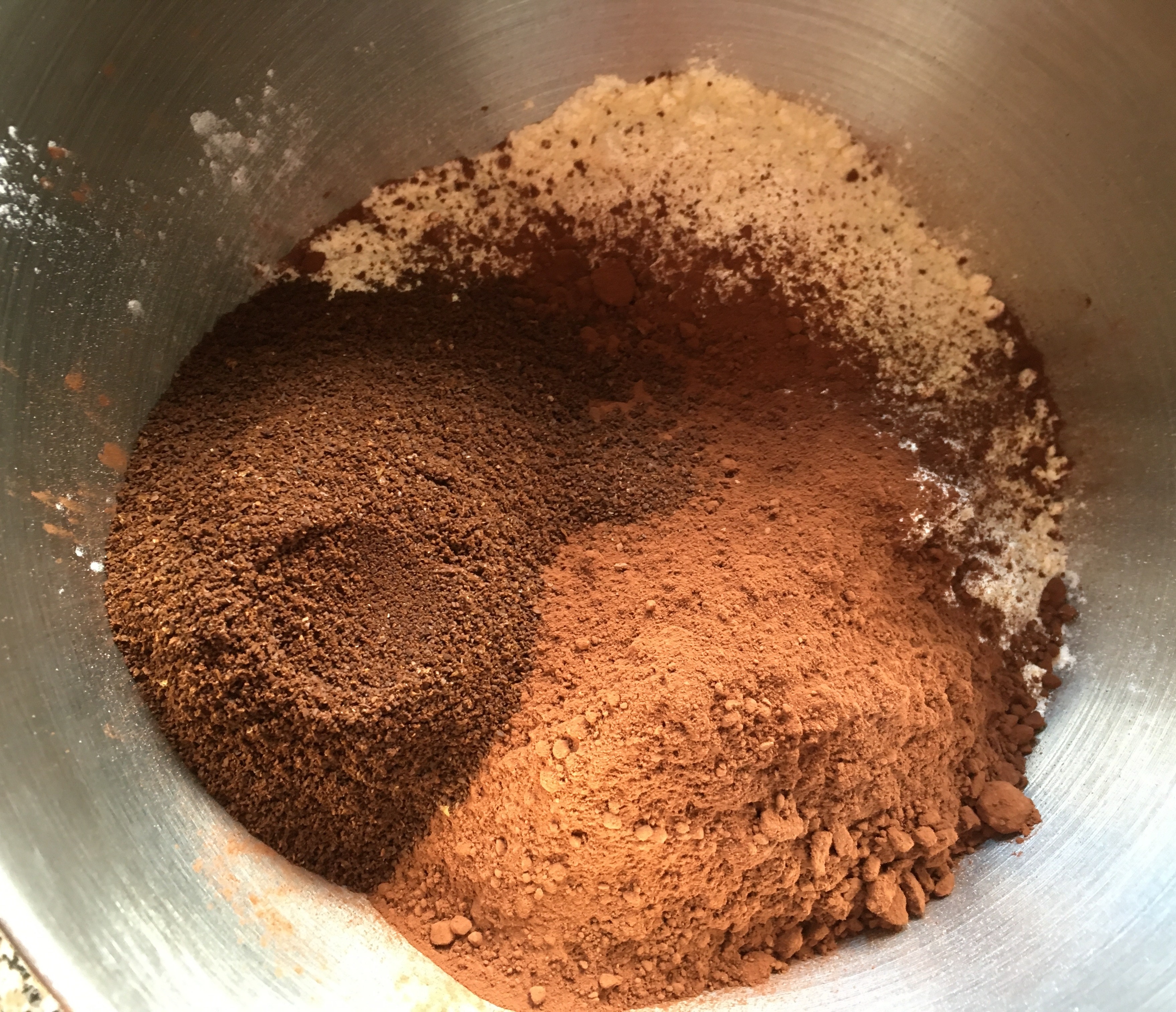 Mehl, Kakaopulver, Kaffee Zucker, Eier, Butter und Backpulver vermengen - Den Teig in die Form gießen und sie ein bisschen hin und her bewegen, bis die Oberfläche schön glatt und gleichmäßig ist.