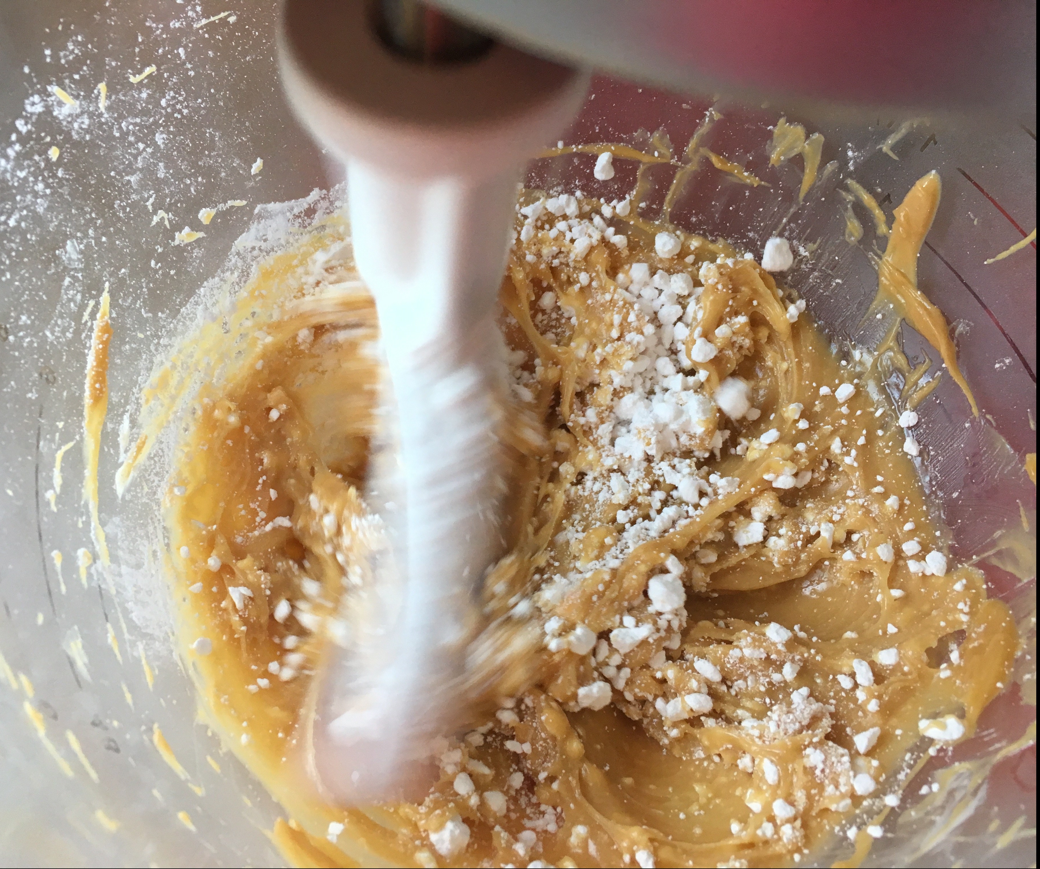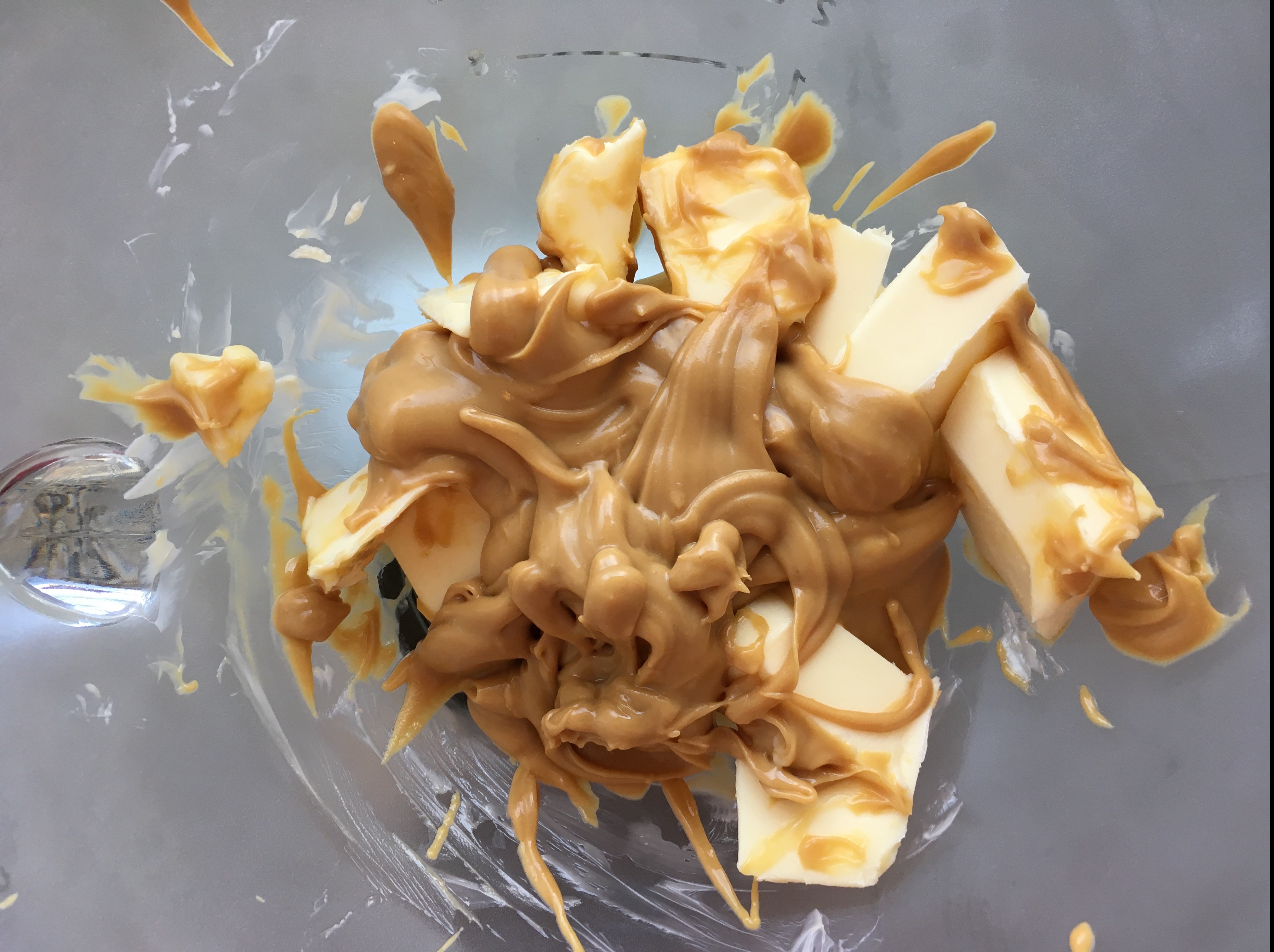 - Erdnussbutter und Butter zusammen cremig schlagen,
