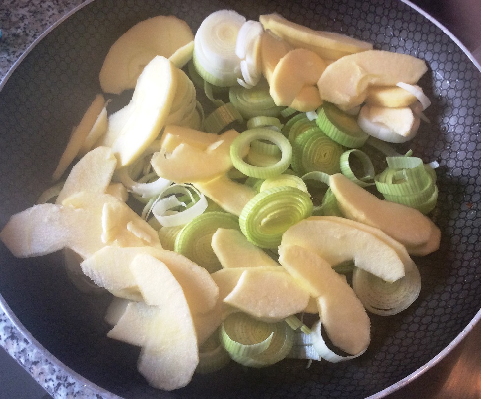 - Speck aus der Pfanne nehmen, Lauch und Äpfel im Bratfett 3 – 5 Minuten andünsten.