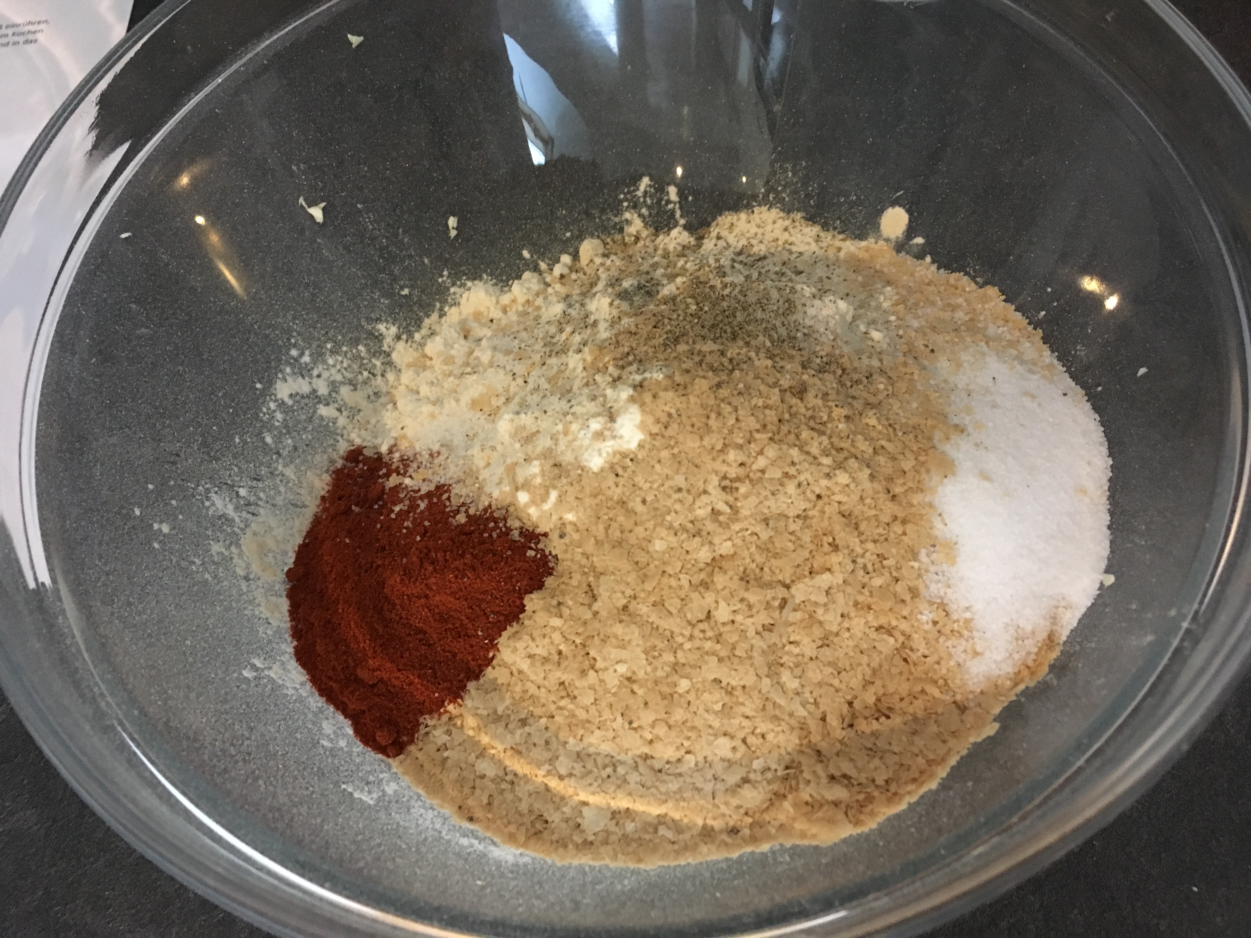 - Geben Sie alle trockenen Zutaten in eine Schüssel, also Seitanmehl, Hefeflochen und die Gewürze. Zwiebel und Knoblauch dürfen auch dazu. Alles gut miteinander vermengen.