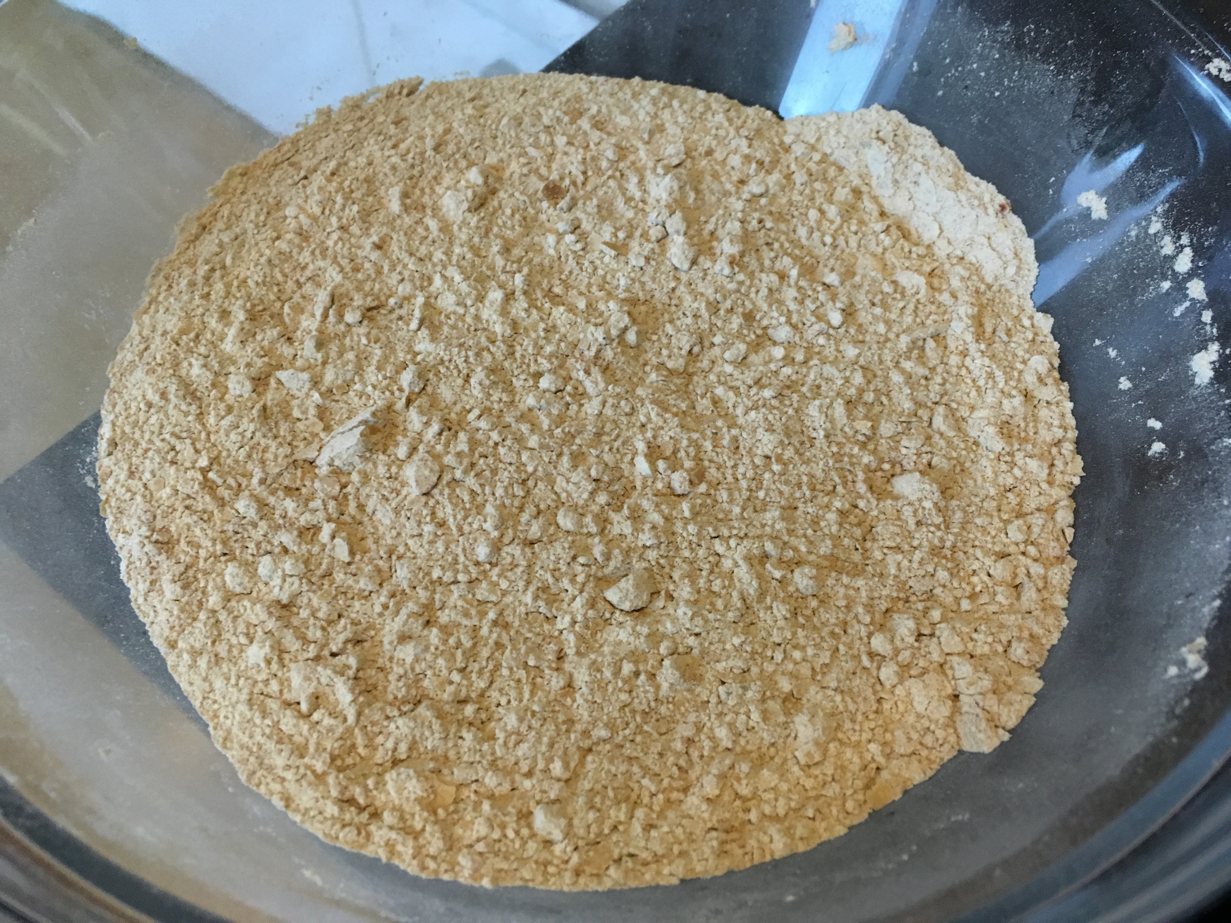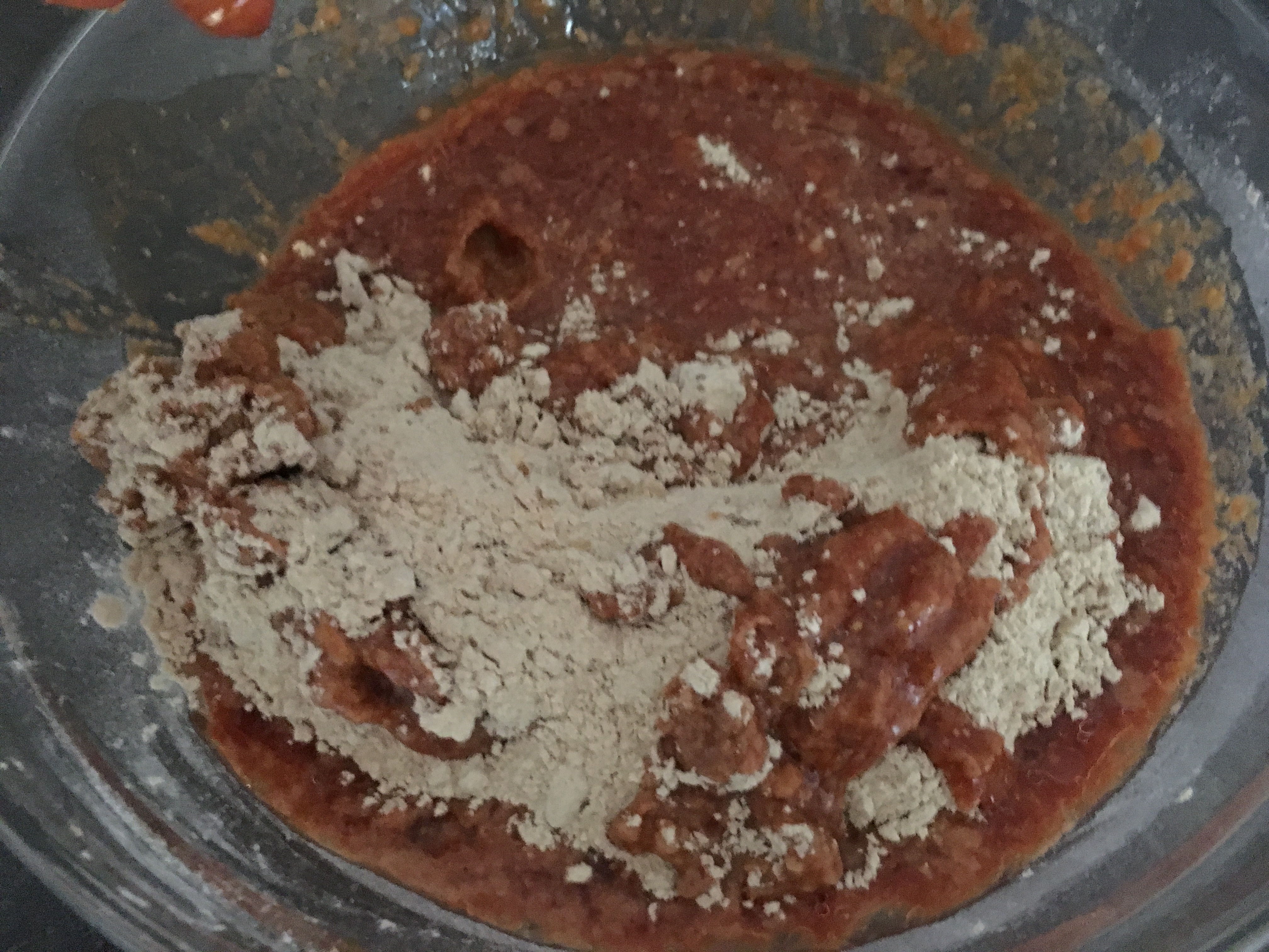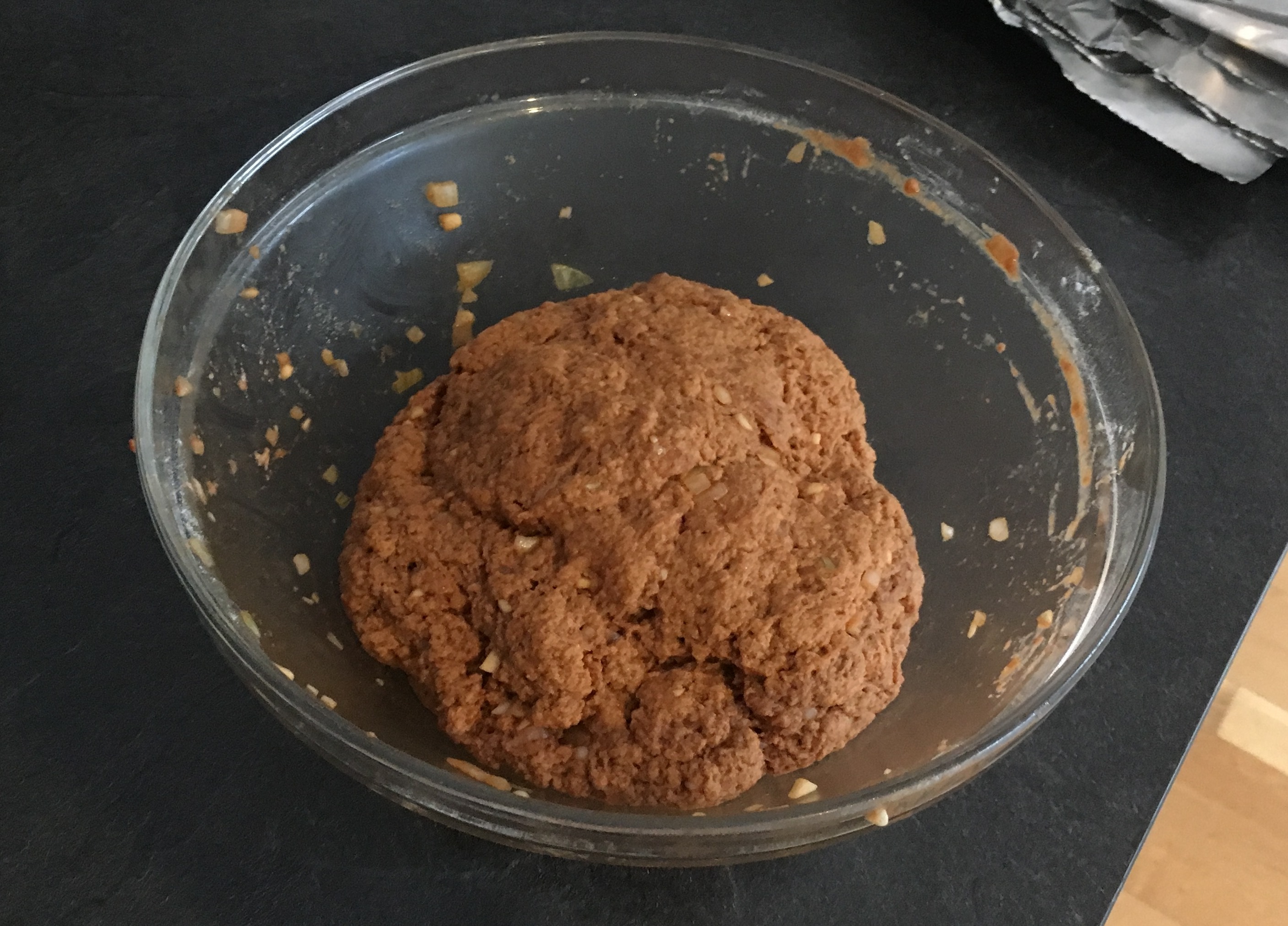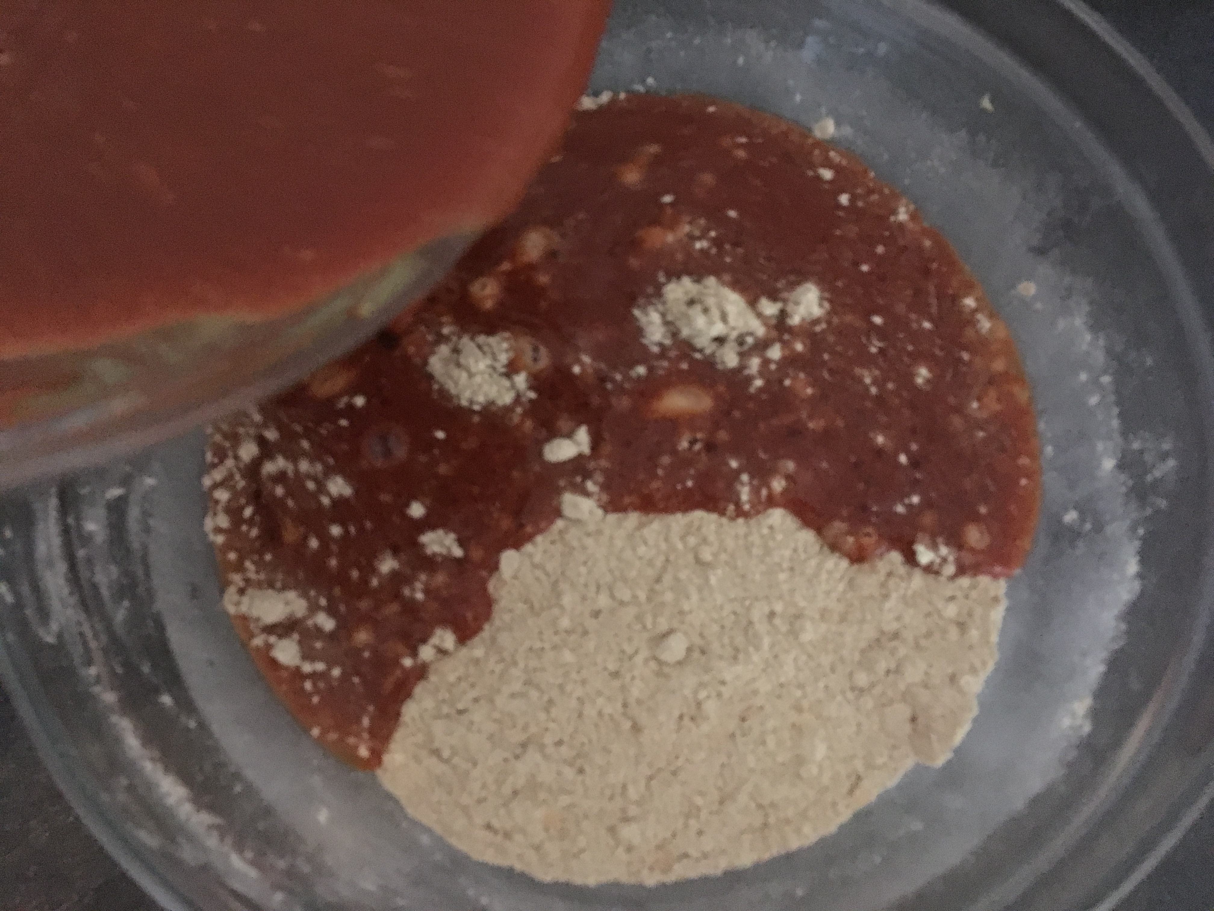 Schüssel 2: Nasse Zutaten Schüssel 2: Verrührt - Dann schütten Sie die Flüssigkeit zu den trockenen Zutaten und verkneten alles gut miteinander. Es ist hilfreich, am Anfang einen Rest Flüssigkeit zurückzubehalten und erst bei Bedarf zuzugeben.